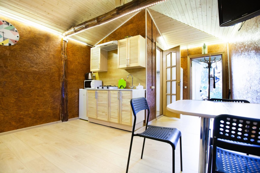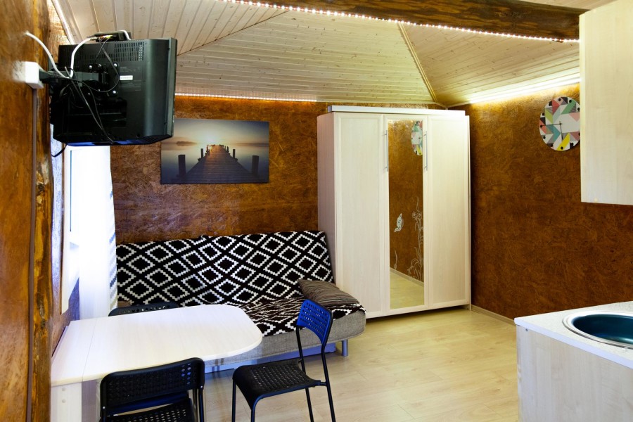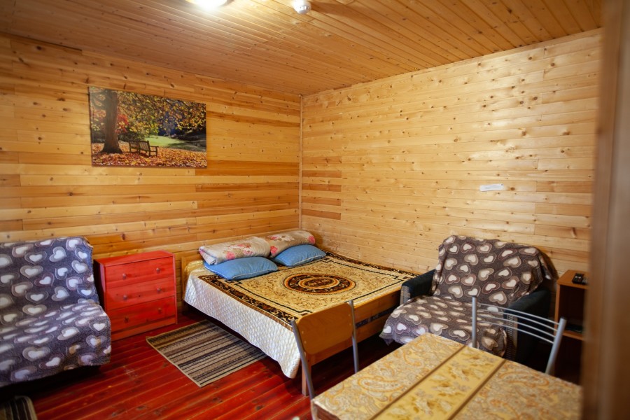 На ухоженной территории — общая кухня, сауна, несколько мангальных зон с беседками, настольный теннис и детская и волейбольная площадки. Проживание организовано в номерах и коттеджах различной вместимости. В каждом из них есть собственная ванная комната, телевизор и холодильник, в холодное время года работает центральное отопление.