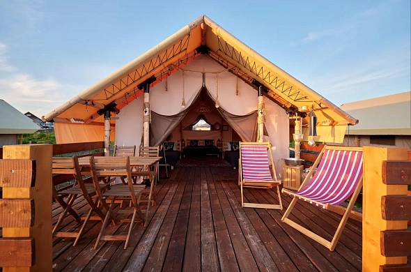 Расположенный на живописном берегу реки Кама, наш глэмпинг раскинулся на большой территории, утопающей в зелени и наполненной свежим речным воздухом.