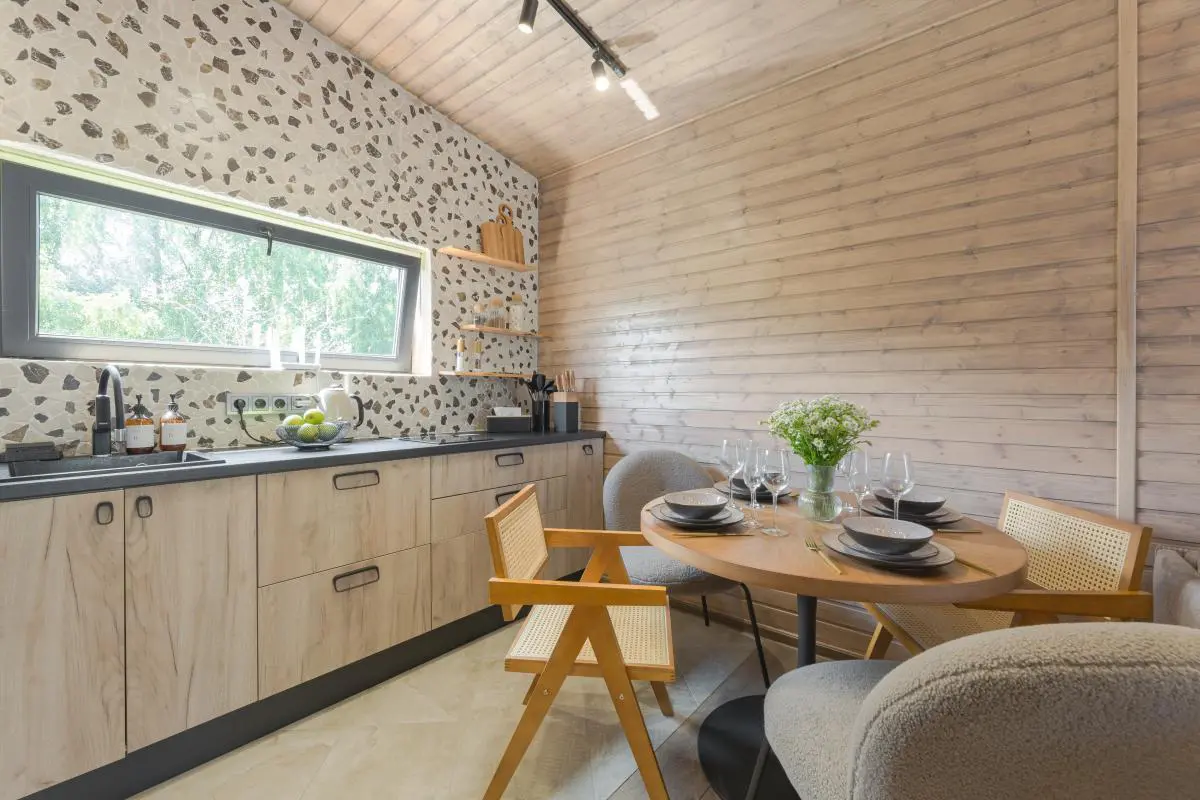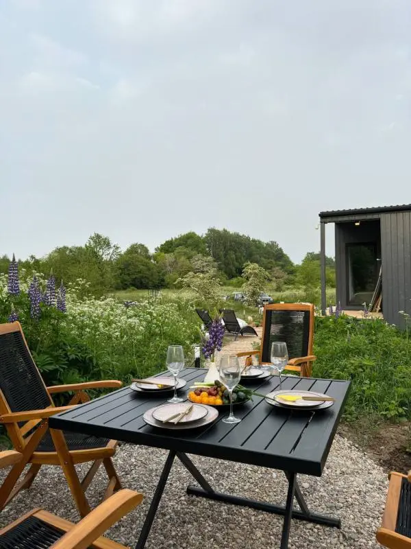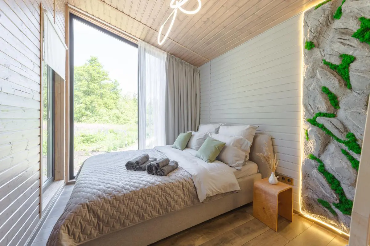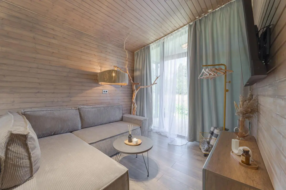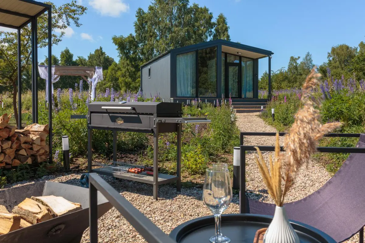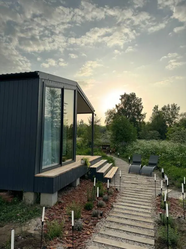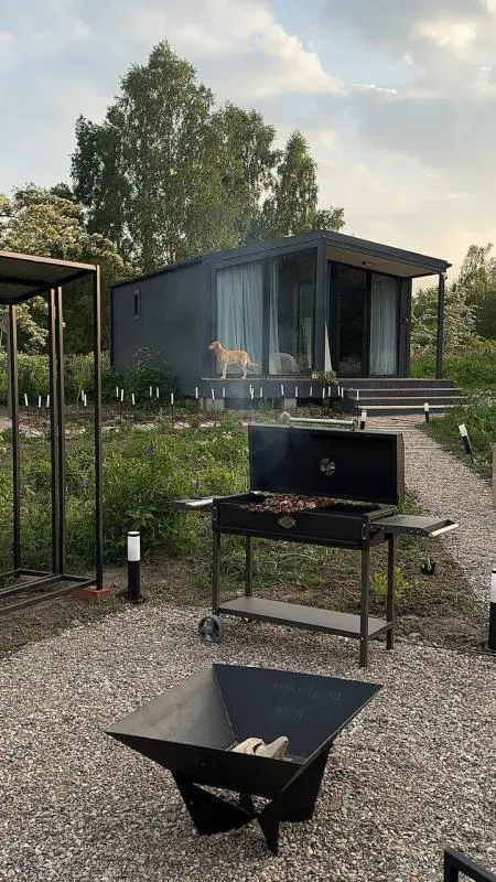 В доме есть всё необходимое. На территории: зона барбекю с мангалом и дровницей, костровая чаша со стульями, подвесная качель и лежаки для отдыха на свежем воздухе.