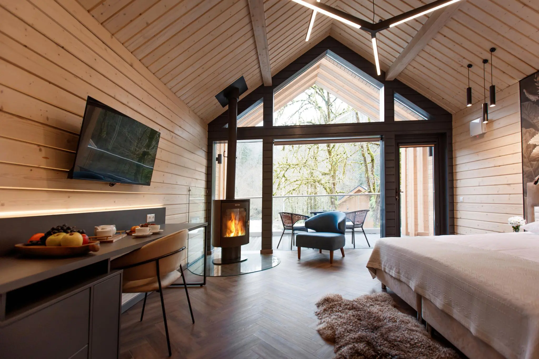 На побережье горной реки Большая Хоста, в реликтовом лесу, расположились 7 комфортабельных барнхаусов и 3 просторных тент-хауса, в каждом из которых мебель из натуральных эко-материалов, теплые полы, кондиционер, камин.