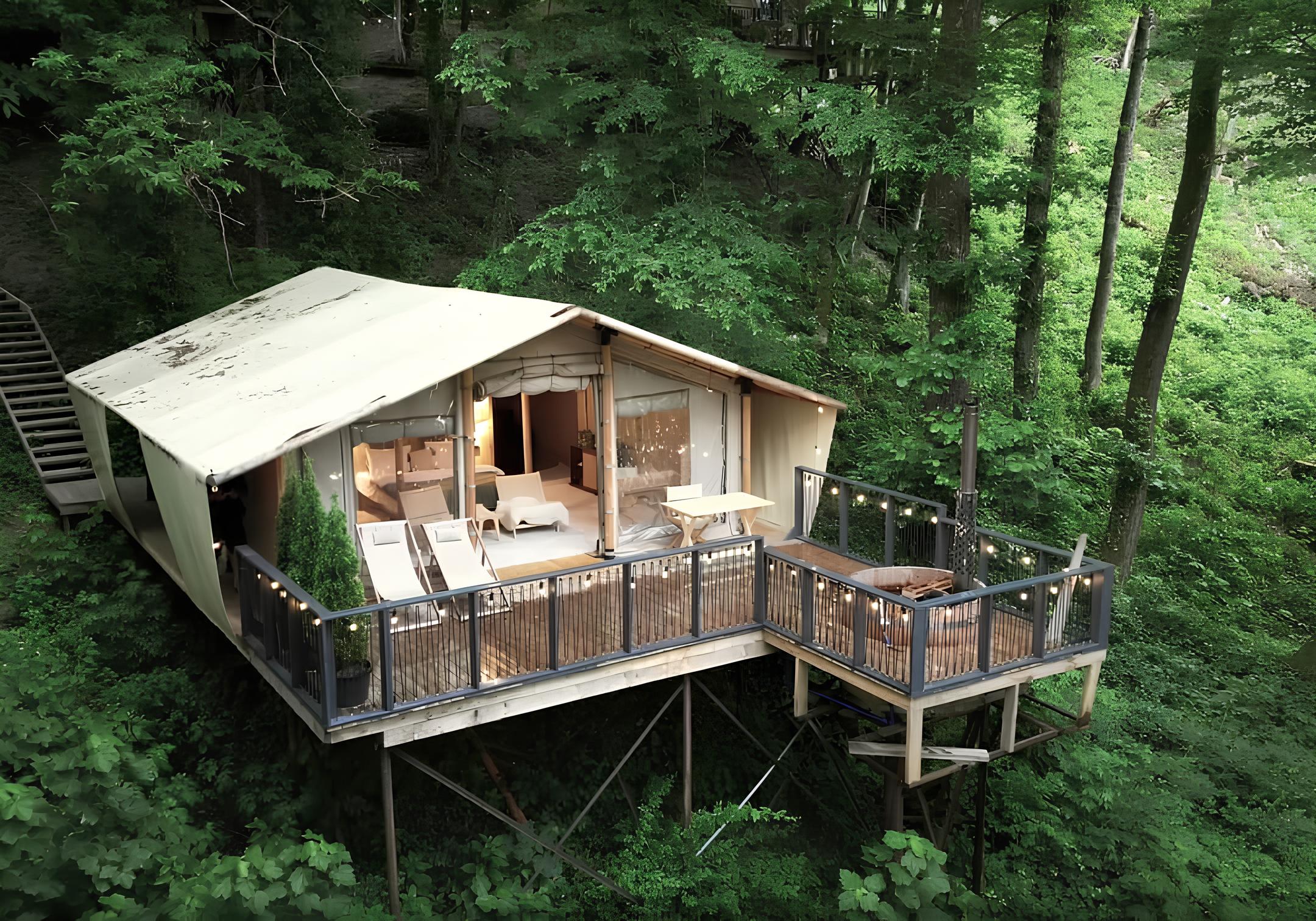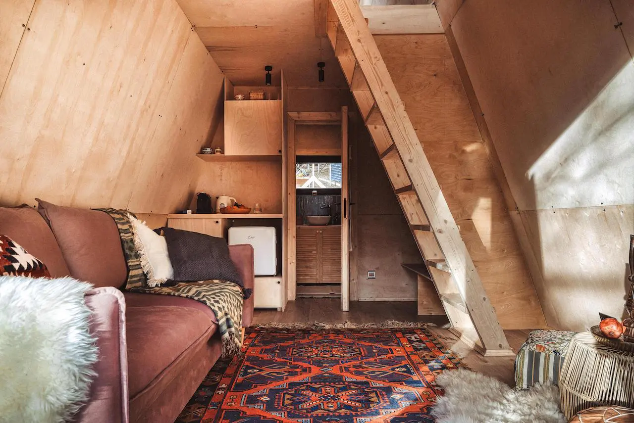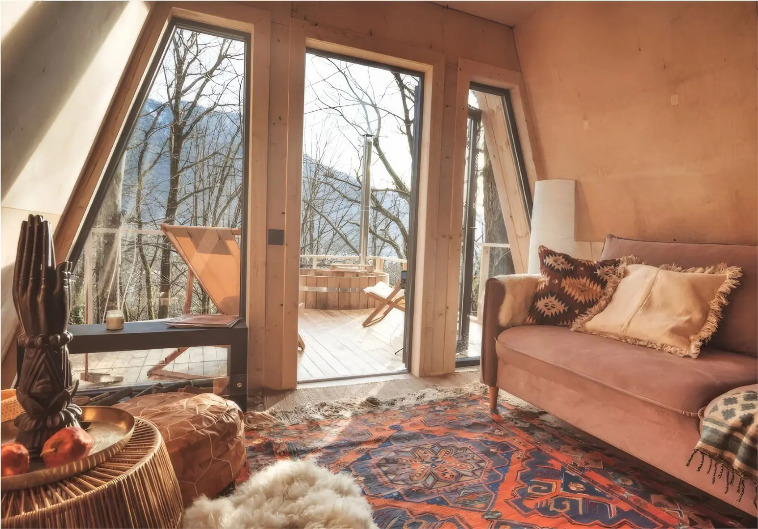 Гостей ждут стильные А-фреймы, сафари-тенты и сказочный домик «Облако» для двоих. Интерьеры продуманы до деталей — мебель ручной работы, натуральные ткани, камин, кофемашина и собственная купель на террасе.