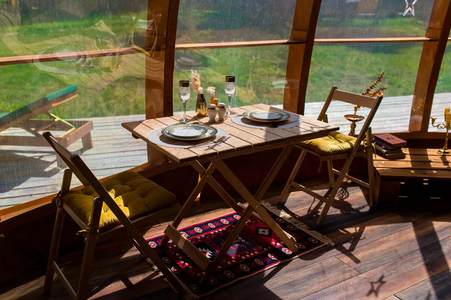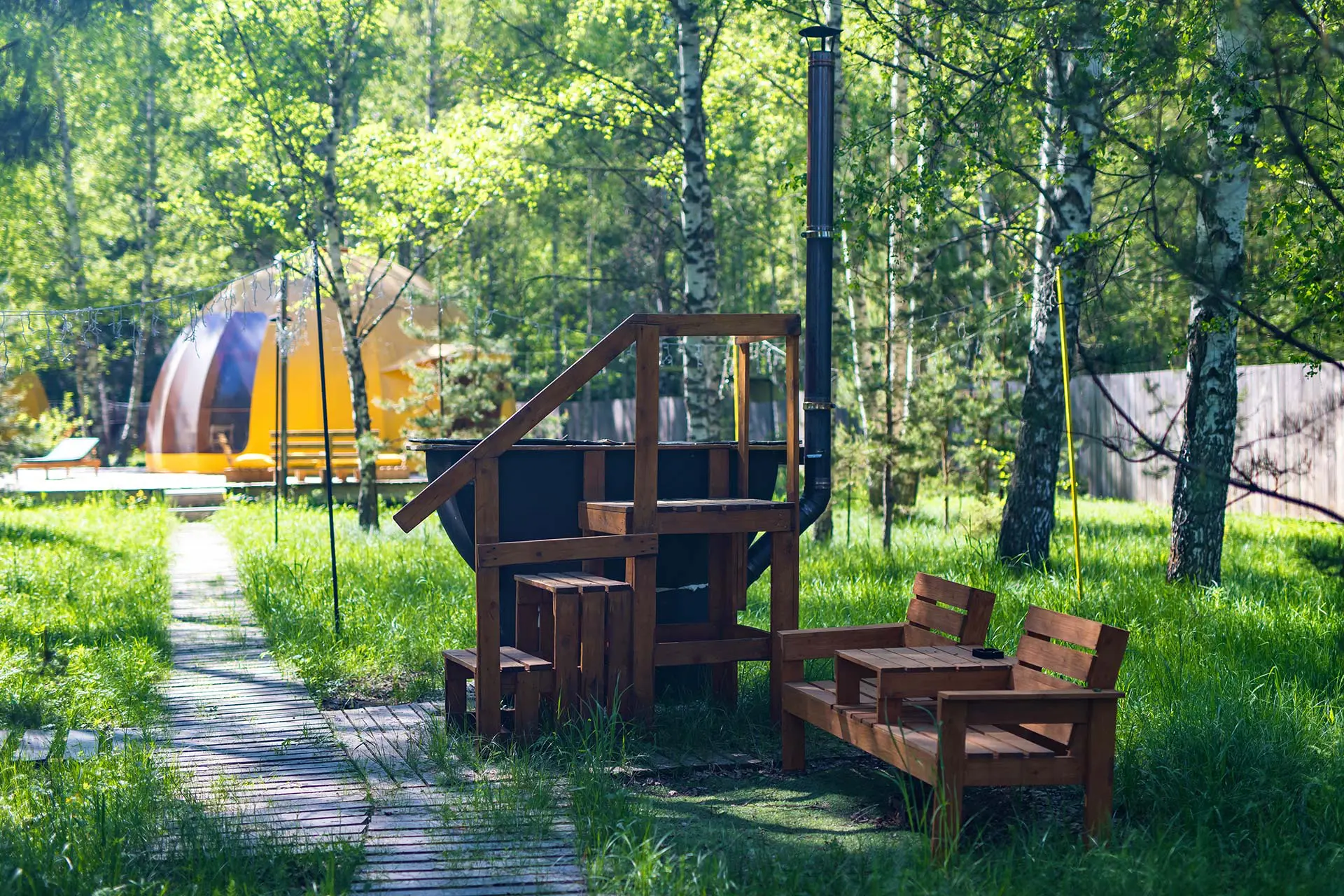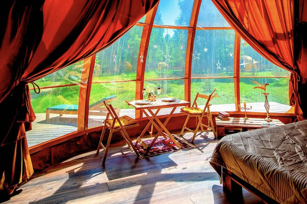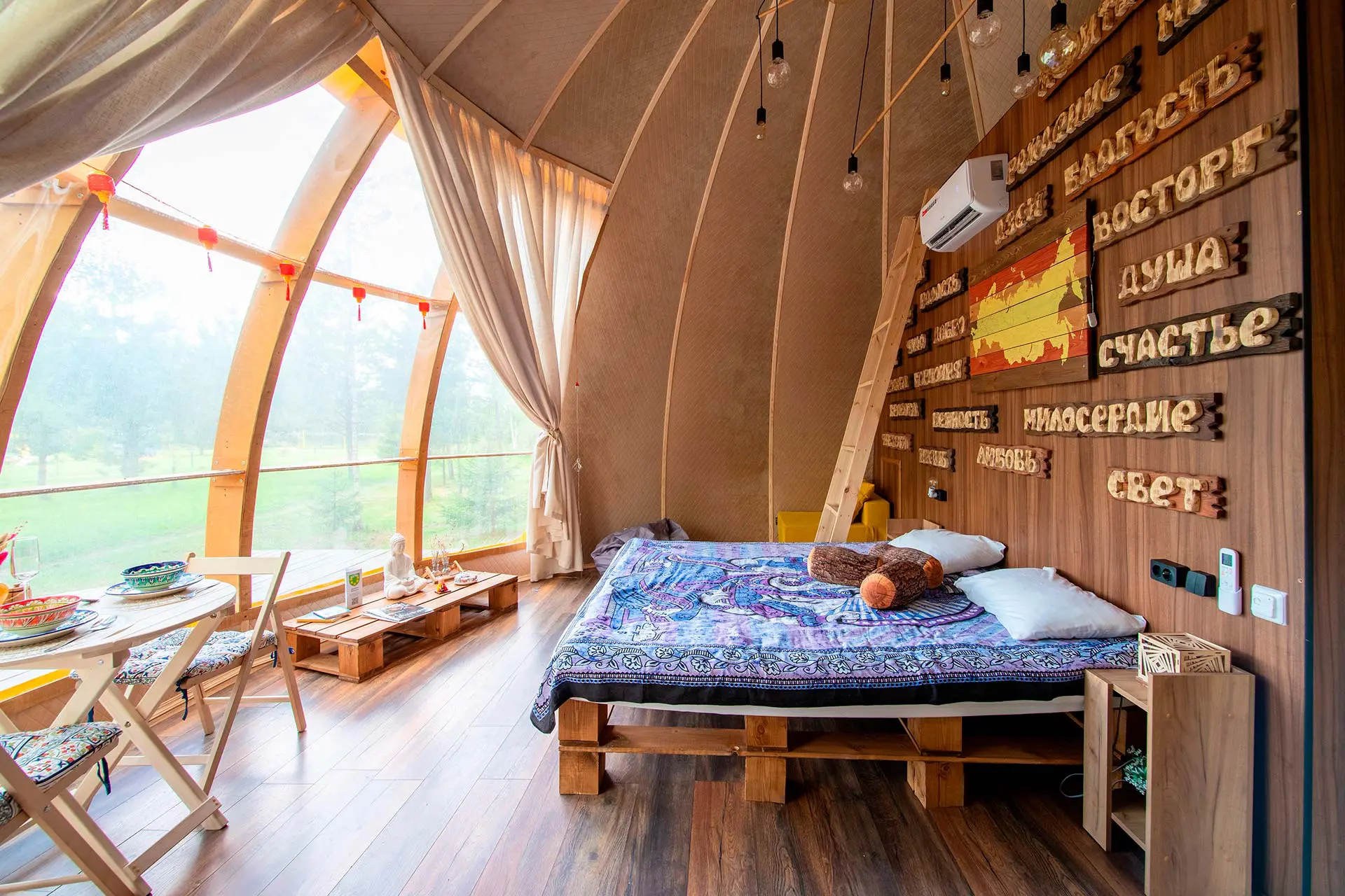 Каждый купольный домик оснащен личной террасой с зоной отдыха. На территории глэмпинга есть русская баня, банные чаны, спортивные площадки, пруд и два бассейна. Здесь предлагается множество активностей для любителей спорта и отдыха на свежем воздухе, включая велосипедные прогулки и зимние развлечения. Багио идеально подходит для проведения важных мероприятий и романтических свиданий.