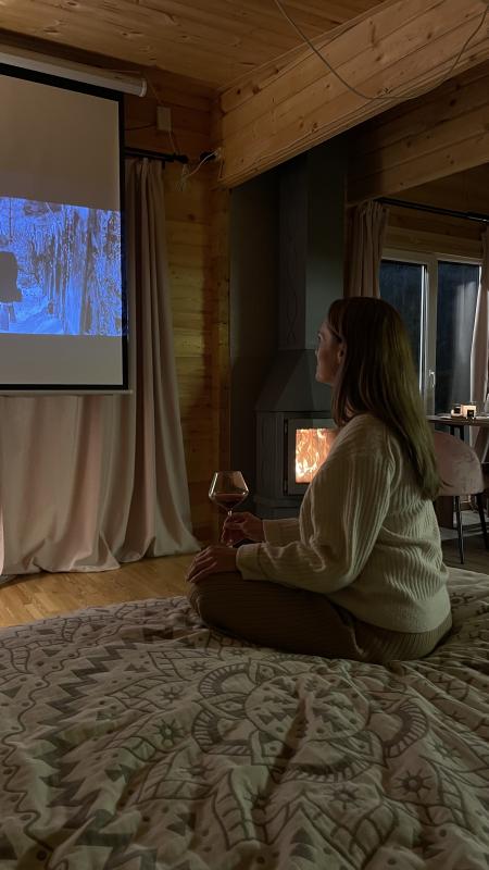 Внутри — тёплая атмосфера, природные мотивы в интерьере и возможность устроить киносеанс с проектором. Для отдыха на улице предусмотрены зоны барбекю, купели, а вокруг — лесные массивы и живописные виды.