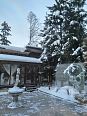 У каждого домика есть своя зона барбекю с мангалом, можно заказать фотосессию, забронировать костровую чашу для уютных посиделок под открытым небом у огня, сходить на сеанс массажа, отдохнуть в бане, окунуться в прохладную купель или же, наоборот, понежиться в горячем чане фурако.