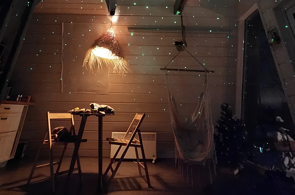В домах есть все необходимое для самостоятельной готовки, зона барбекю возле каждого дома, а в 10 минутах езды кафе. Гостям доступны плавучая баня, джакузи с видом на природу и бочка Фурако. Можно прокатиться на сап-борде, порыбачить, взять велосипеды и даже погладить кроликов, а зимой — кататься на коньках, греться у камина, наслаждаться заснеженными пейзажами и смотреть кино на проекторе.