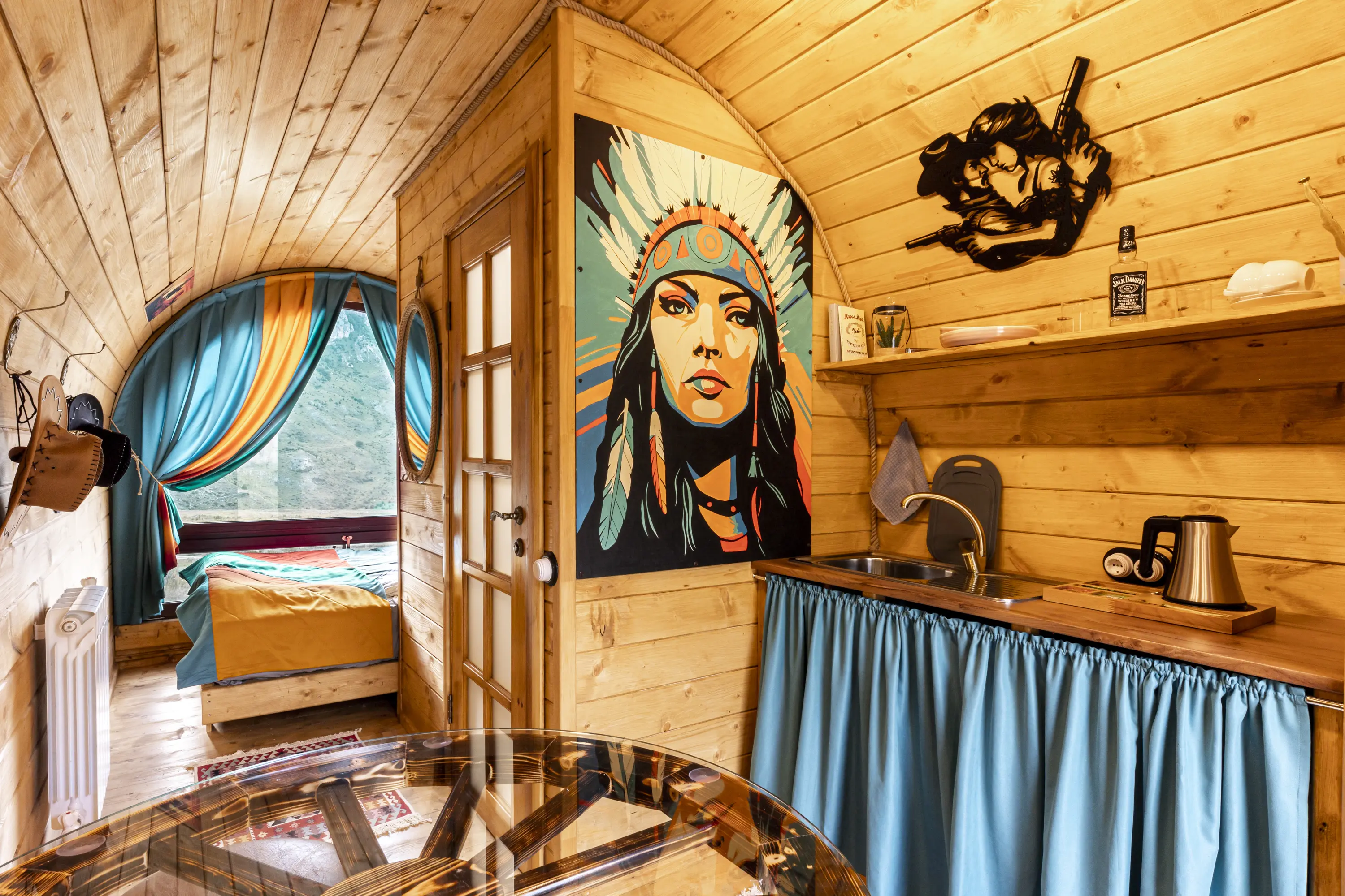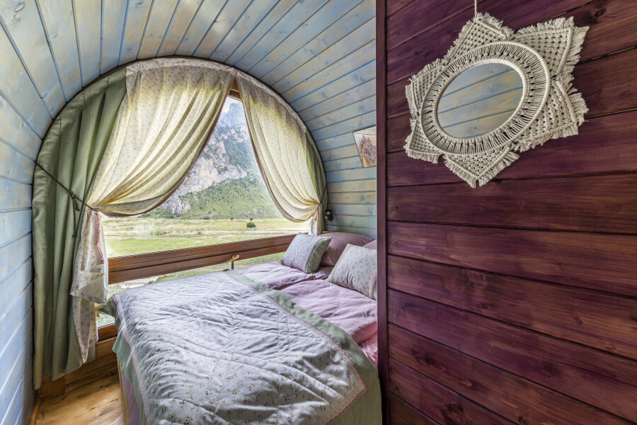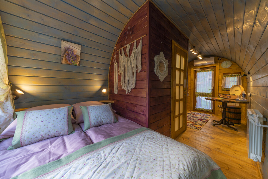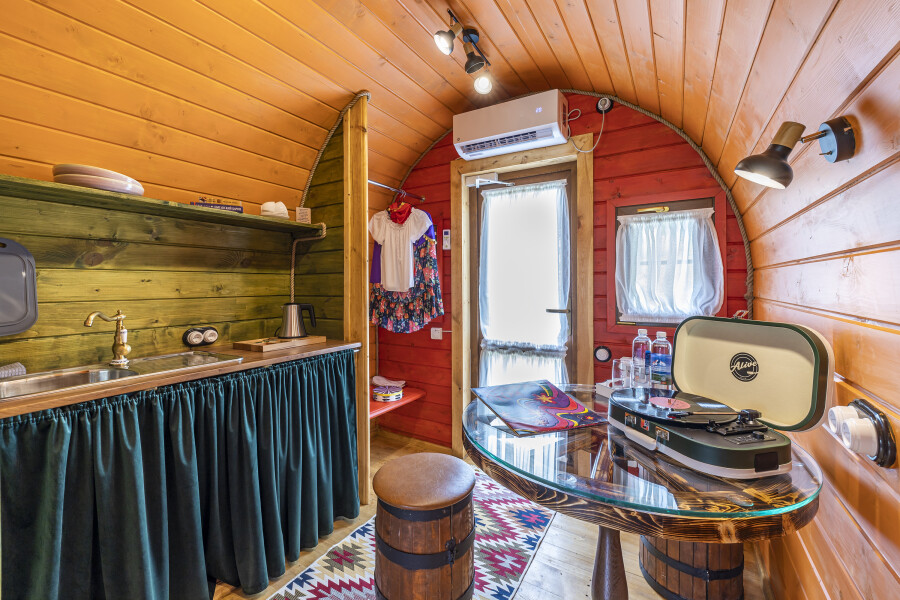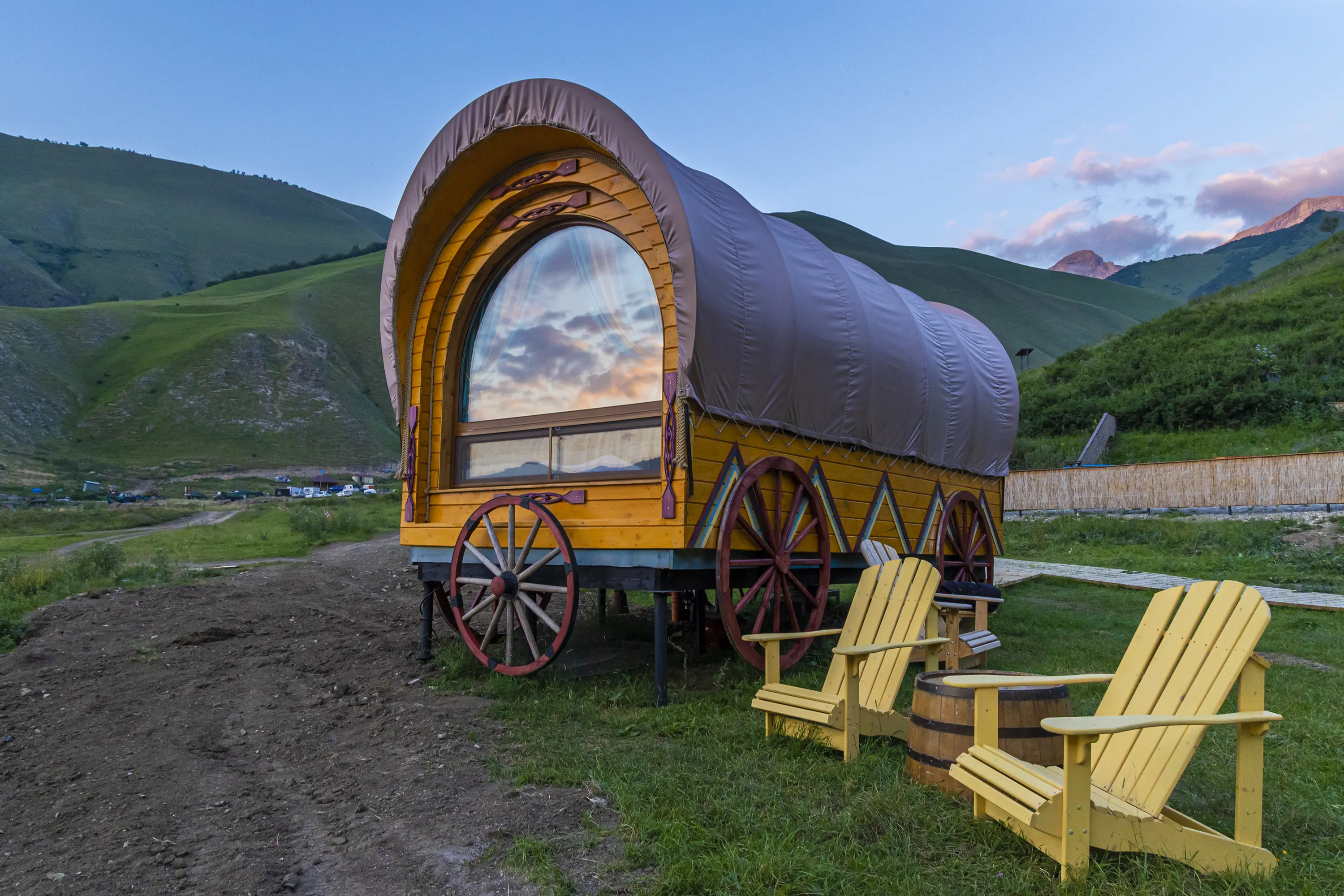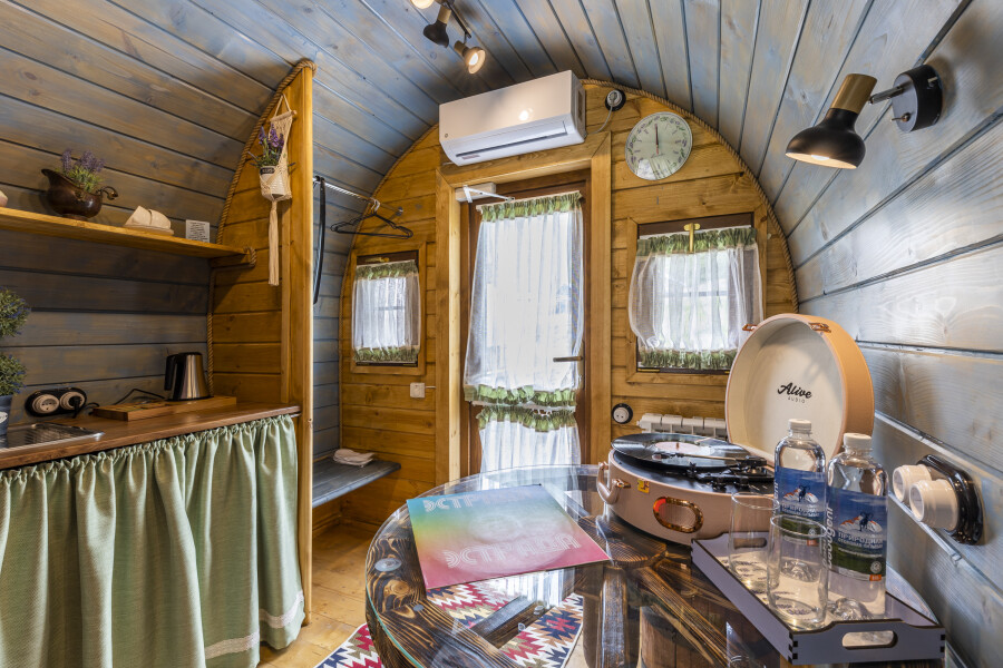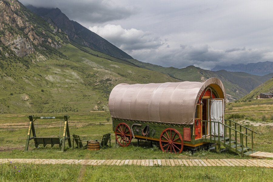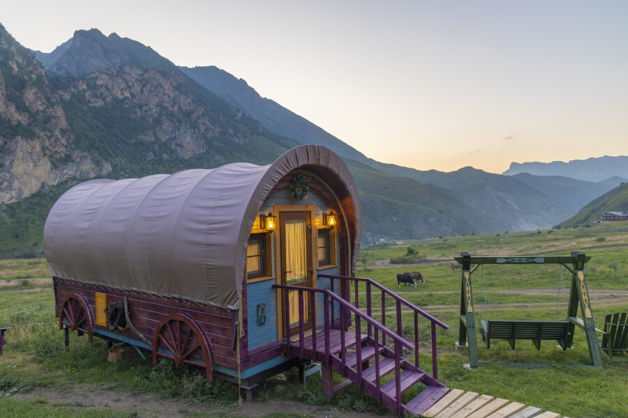 В одном из трёх городков, на которые словно разделён глэмпинг, каждый найдёт подходящий вариант размещения. Для небольшой семьи — уютные хаус-тенты, для пары — оригинальные и стильные домики-дилижансы.