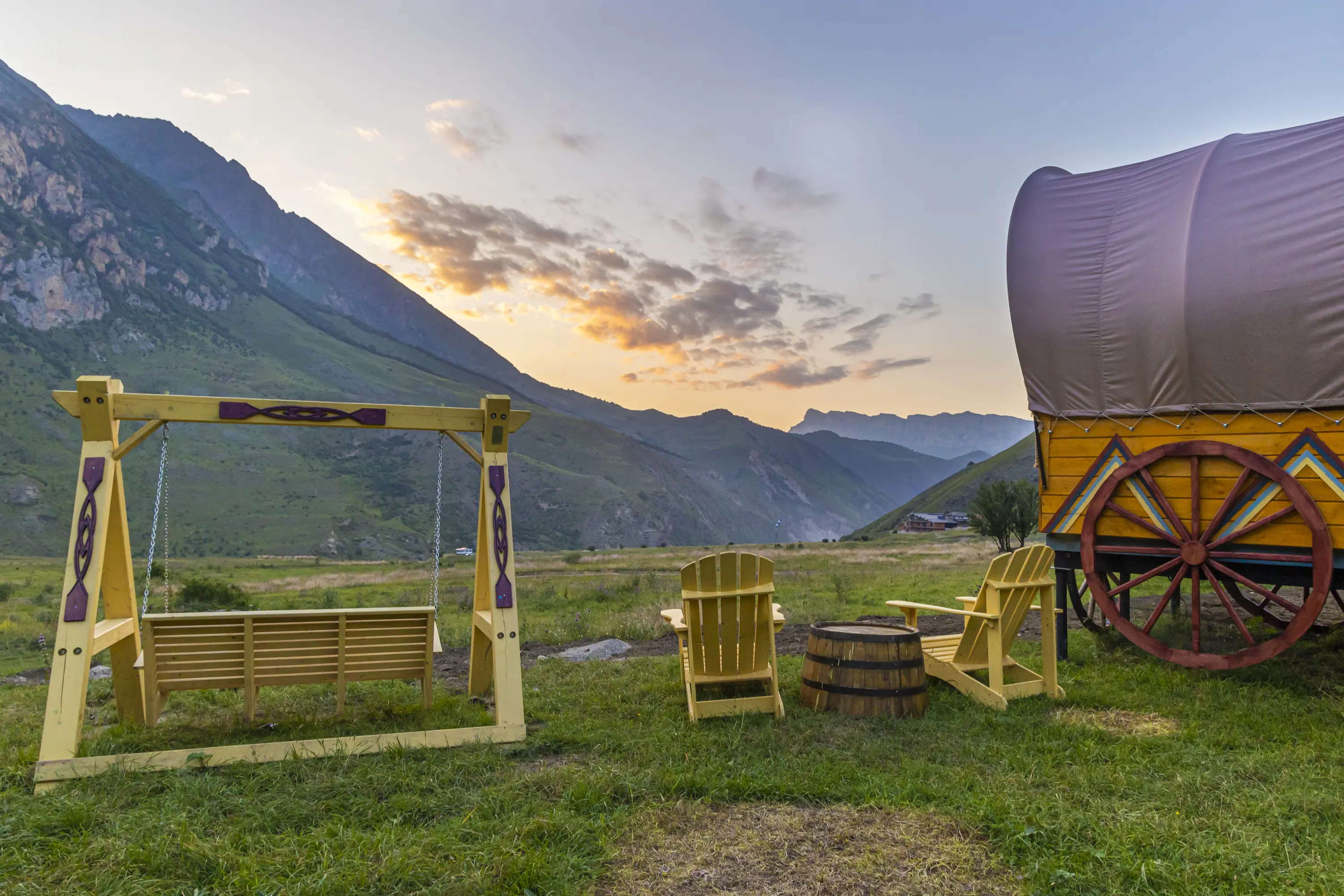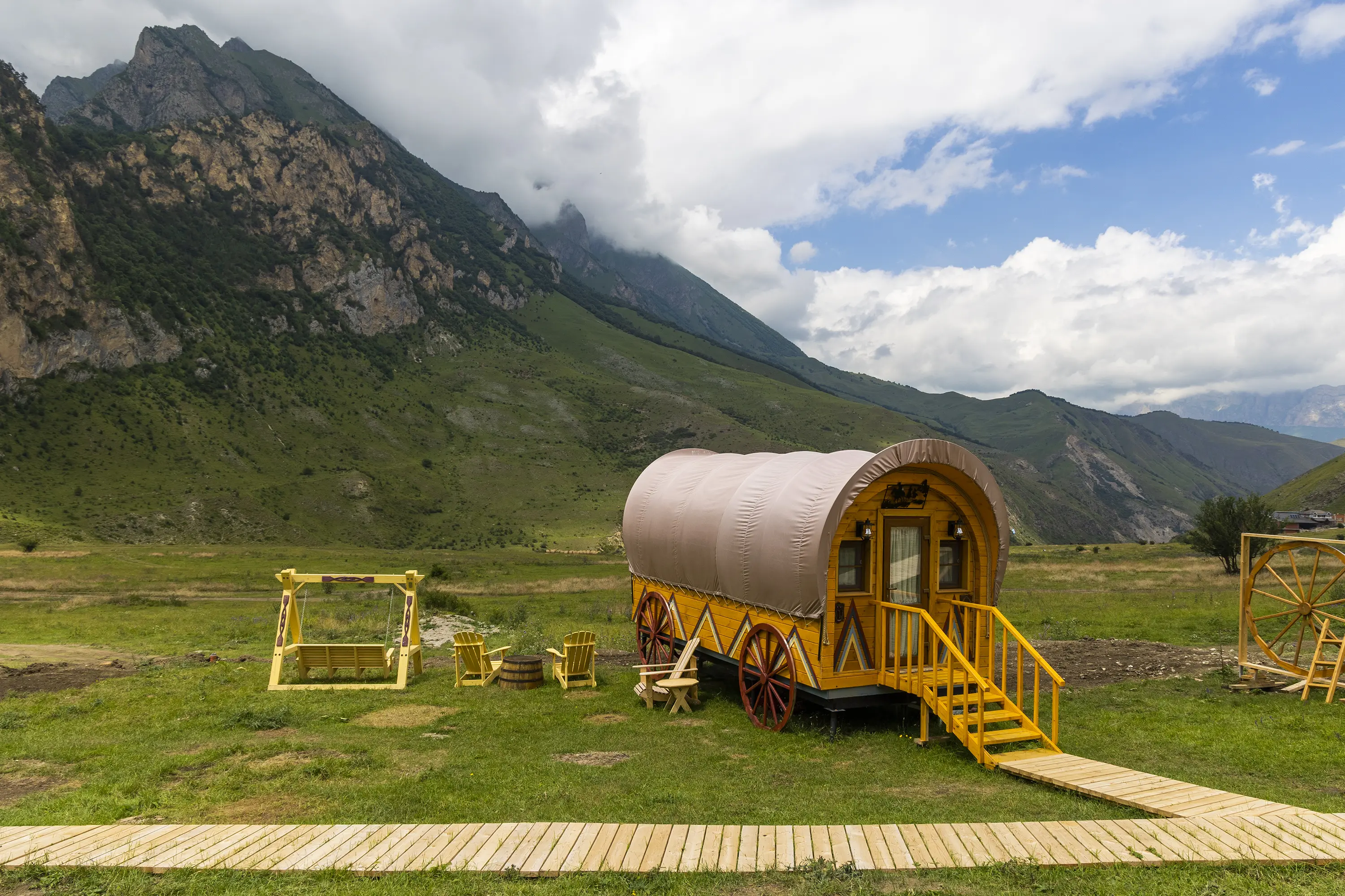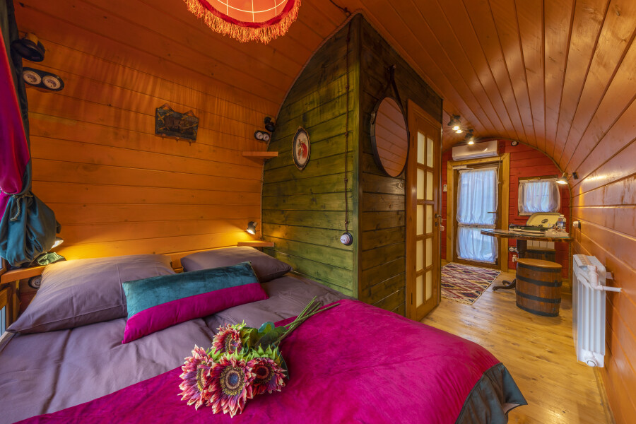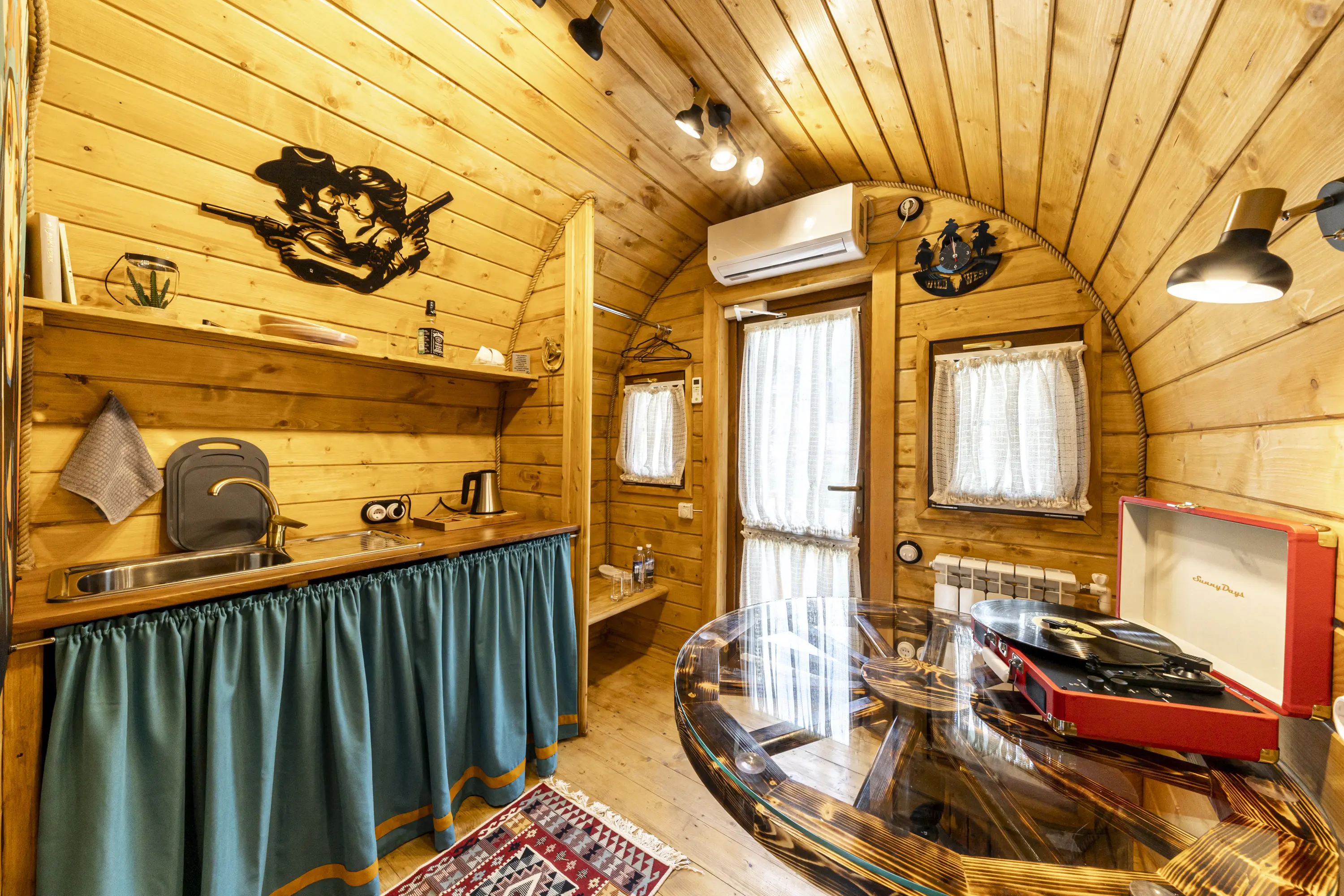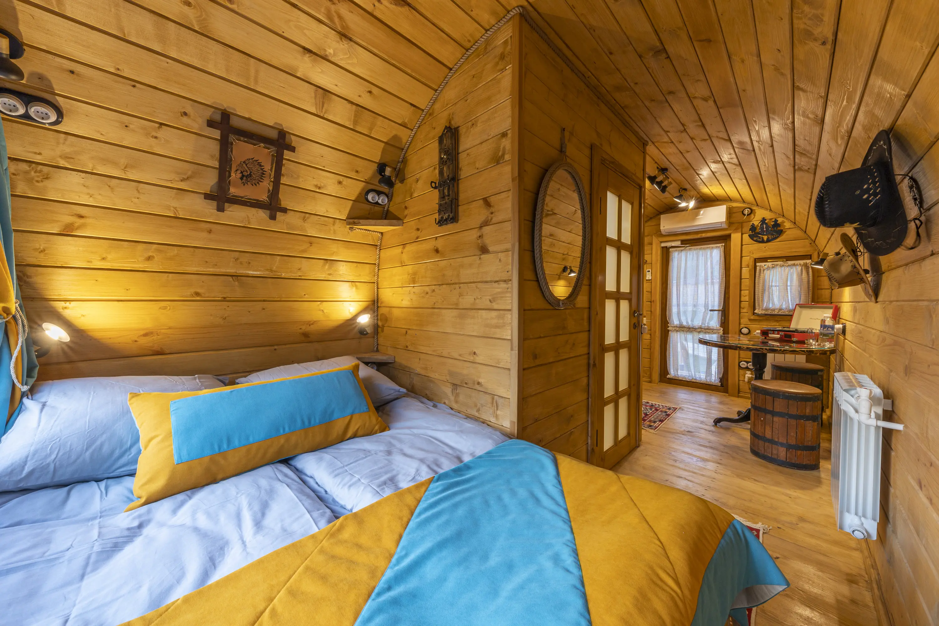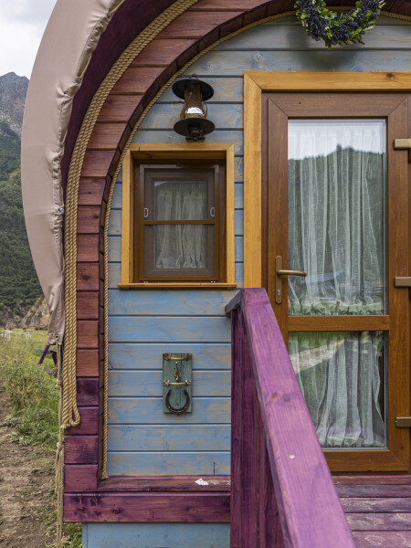 В одном из трёх городков, на которые словно разделён глэмпинг, каждый найдёт подходящий вариант размещения. Для небольшой семьи — уютные хаус-тенты, для пары — оригинальные и стильные домики-дилижансы.