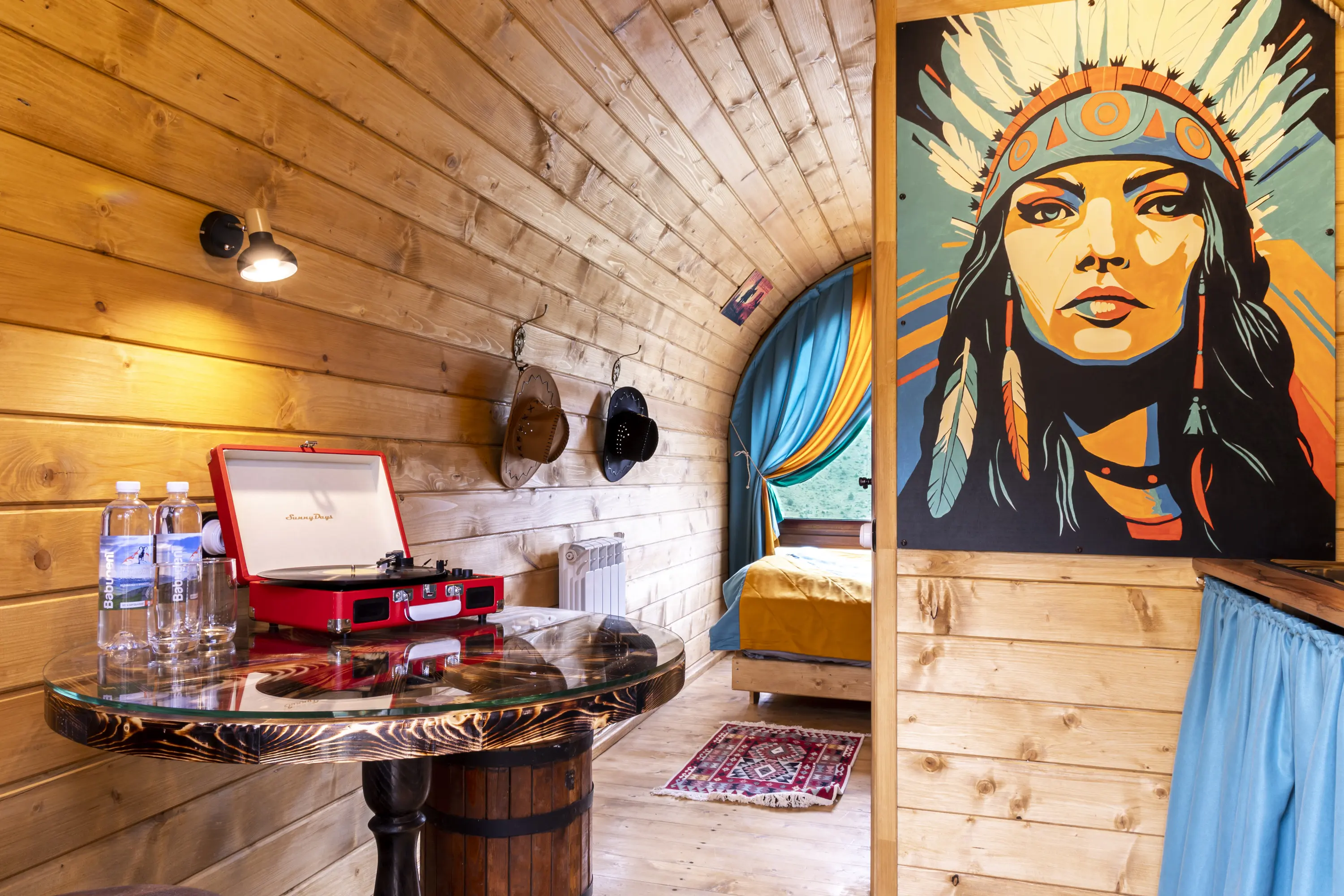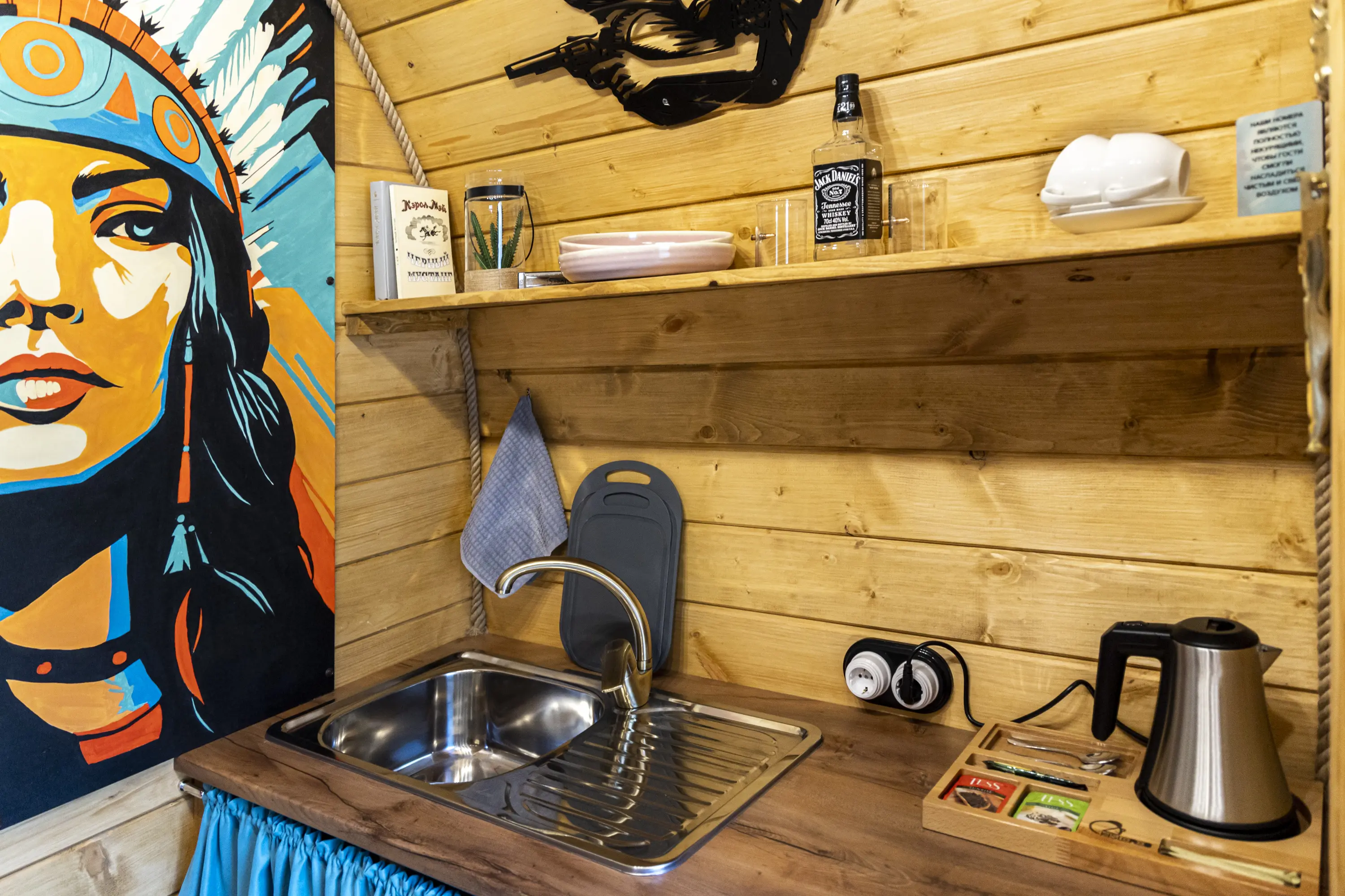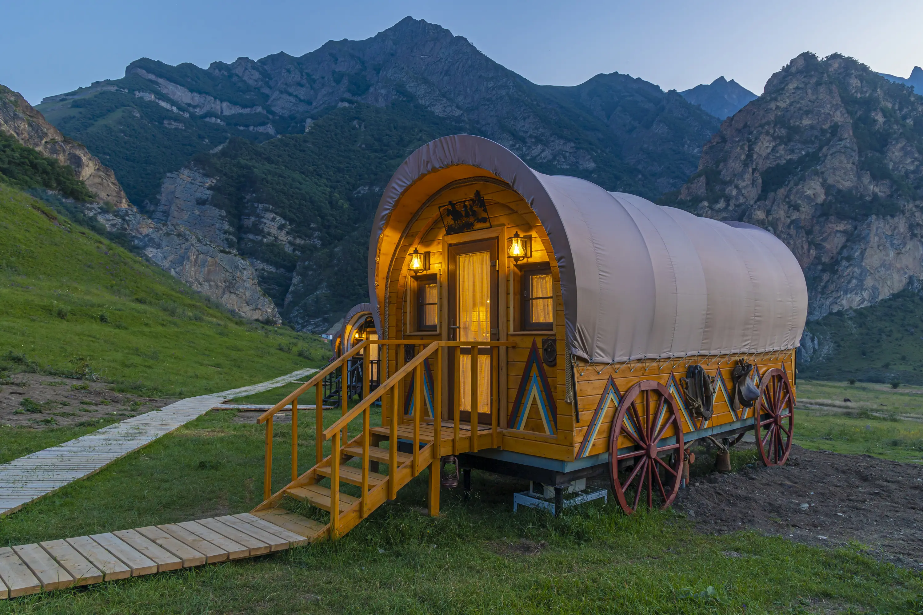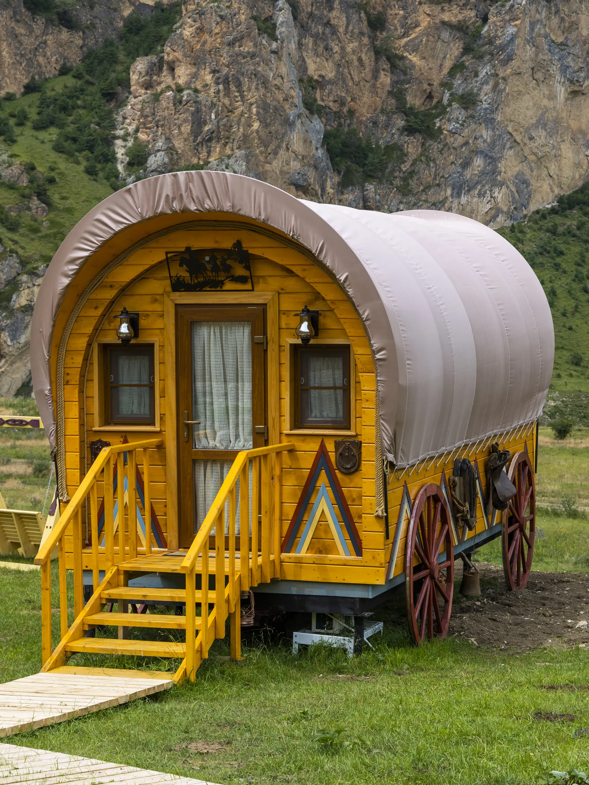 В одном из трёх городков, на которые словно разделён глэмпинг, каждый найдёт подходящий вариант размещения. Для небольшой семьи — уютные хаус-тенты, для пары — оригинальные и стильные домики-дилижансы.