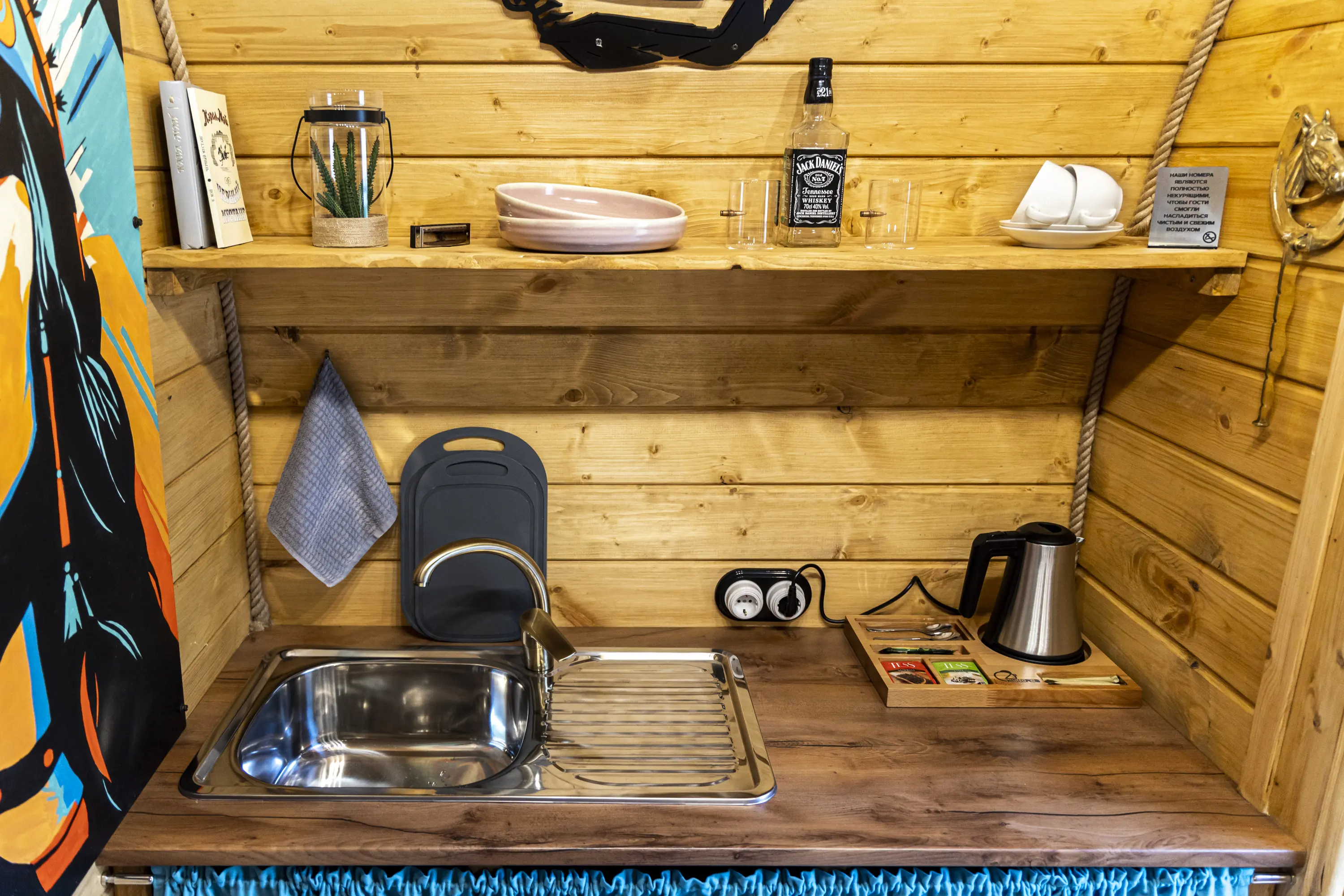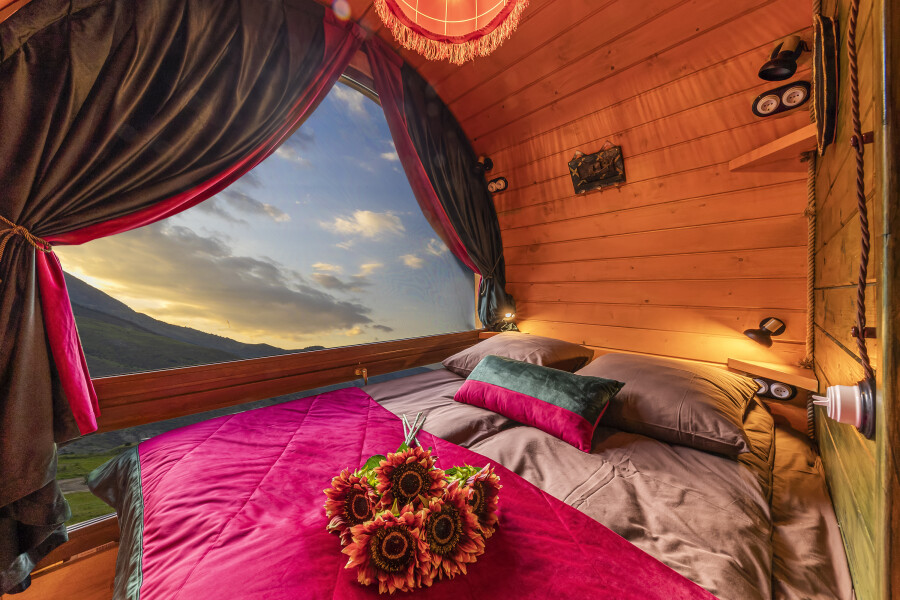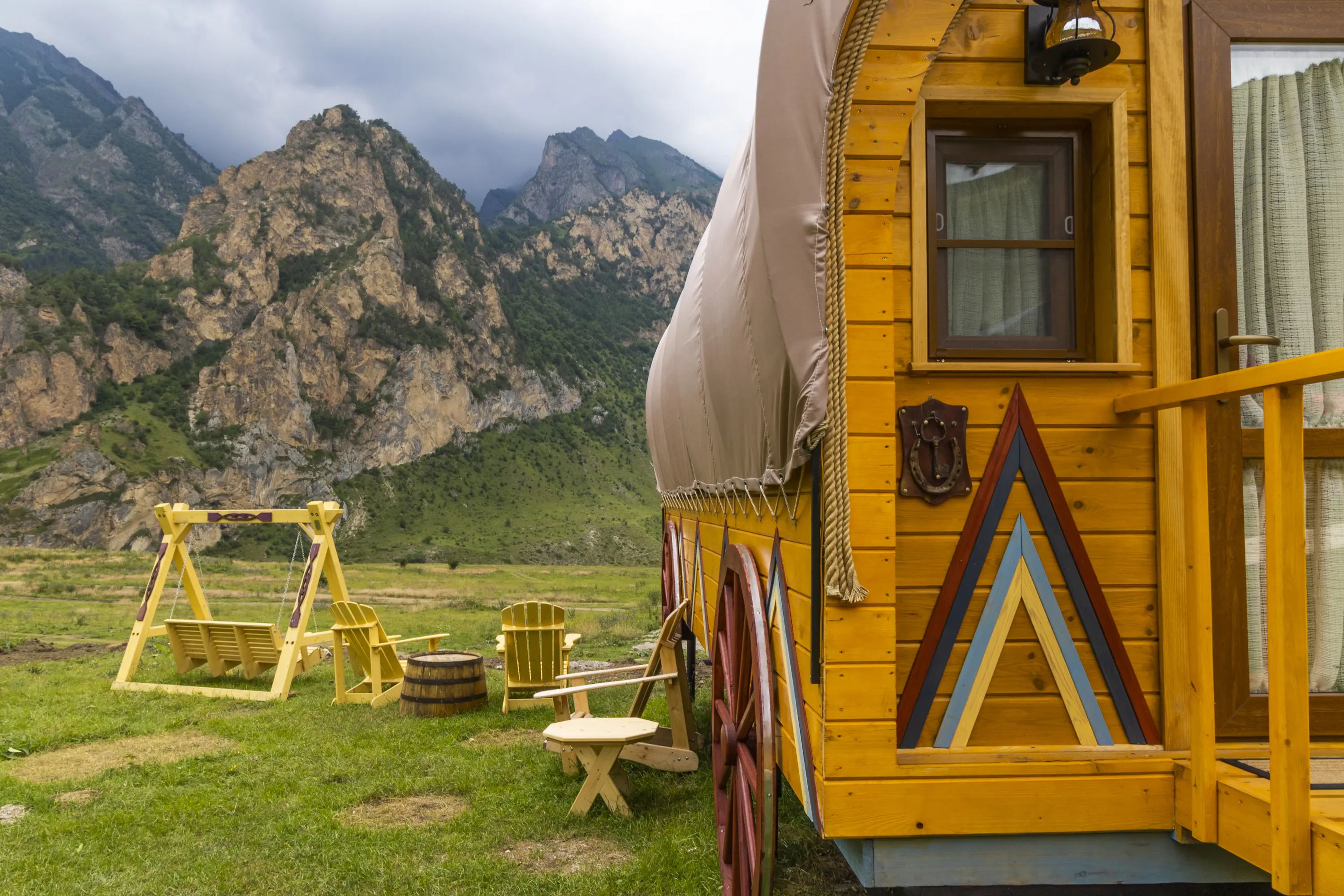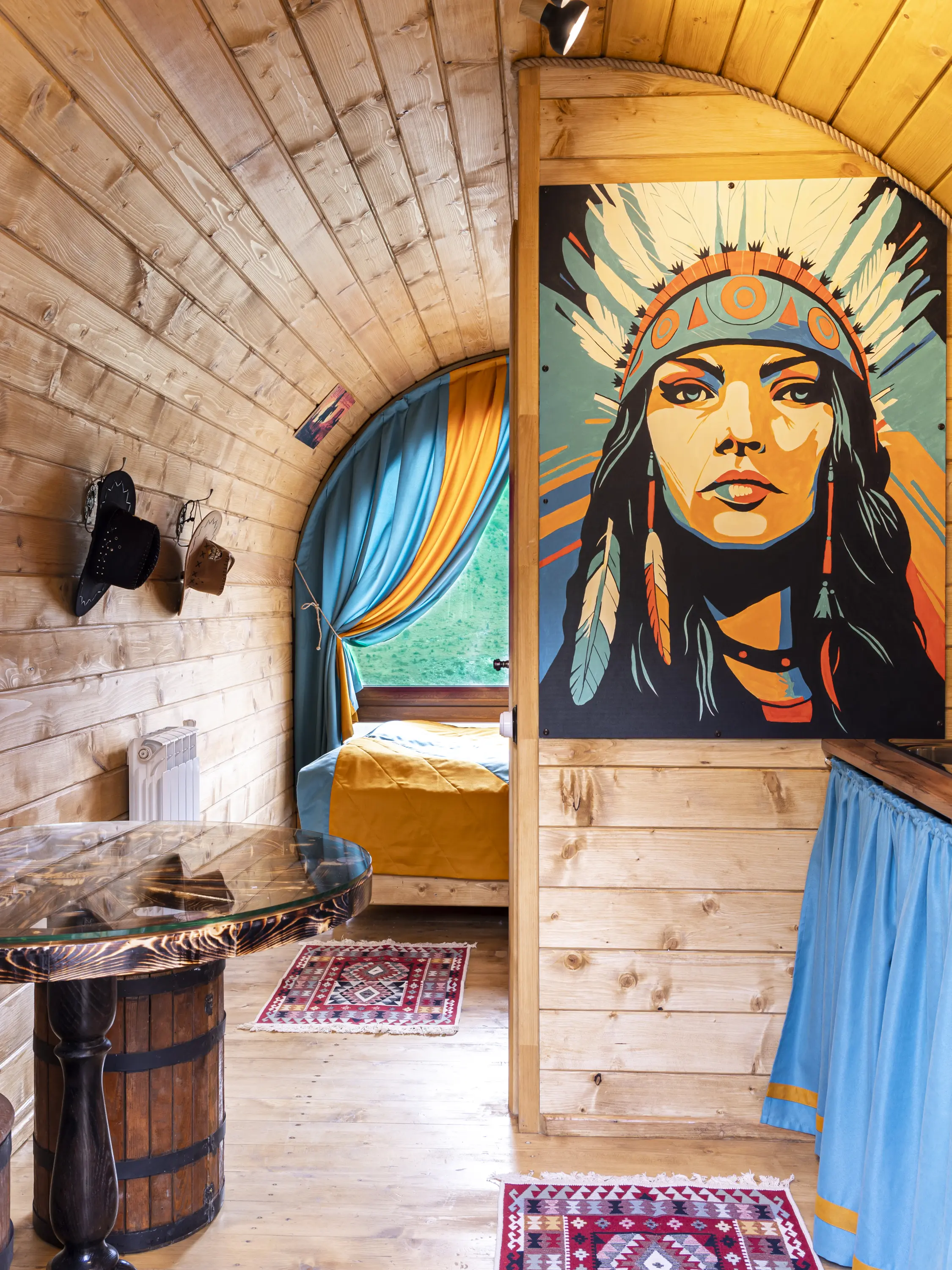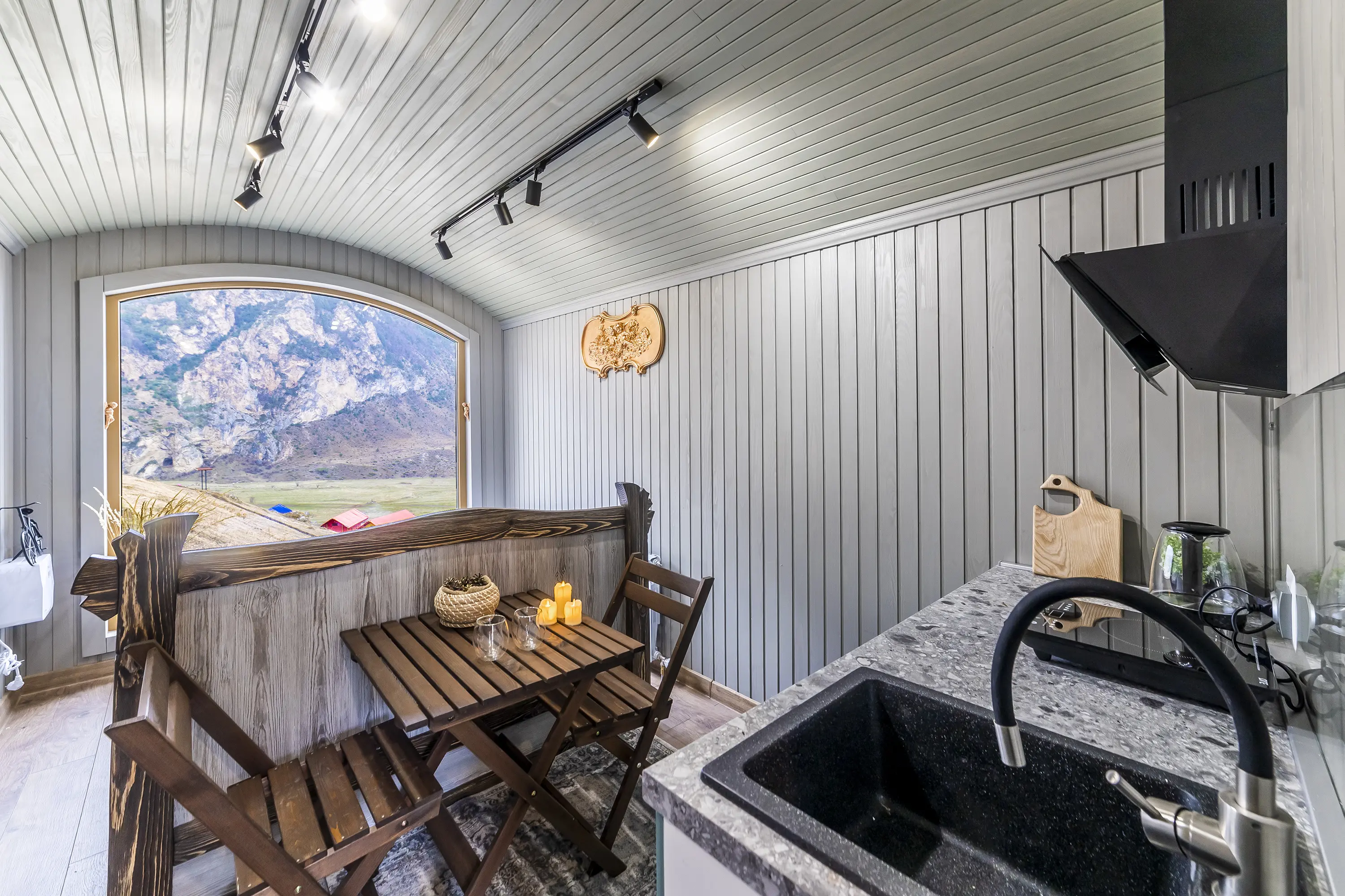 В одном из трёх городков, на которые словно разделён глэмпинг, каждый найдёт подходящий вариант размещения. Для небольшой семьи — уютные хаус-тенты, для пары — оригинальные и стильные домики-дилижансы.