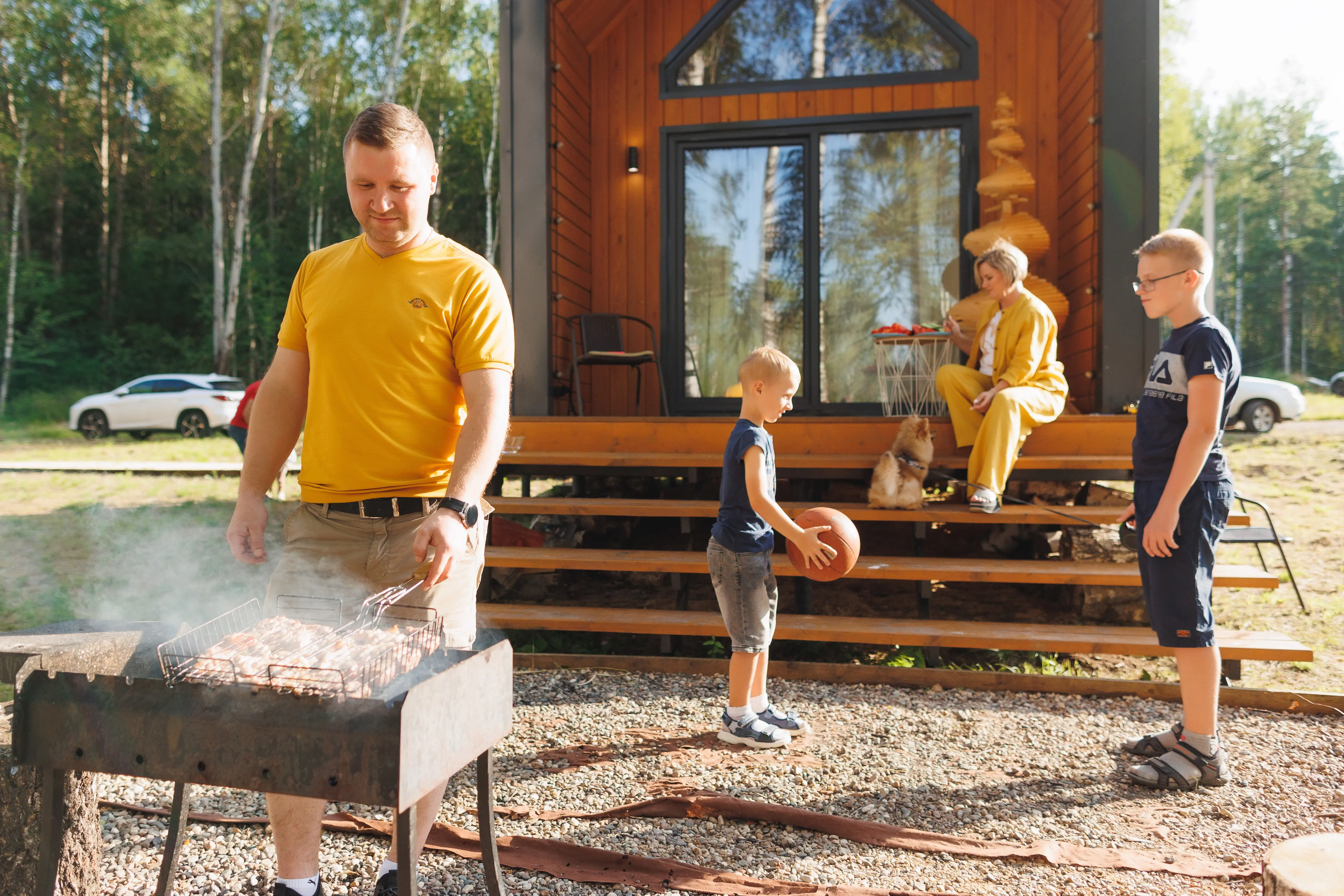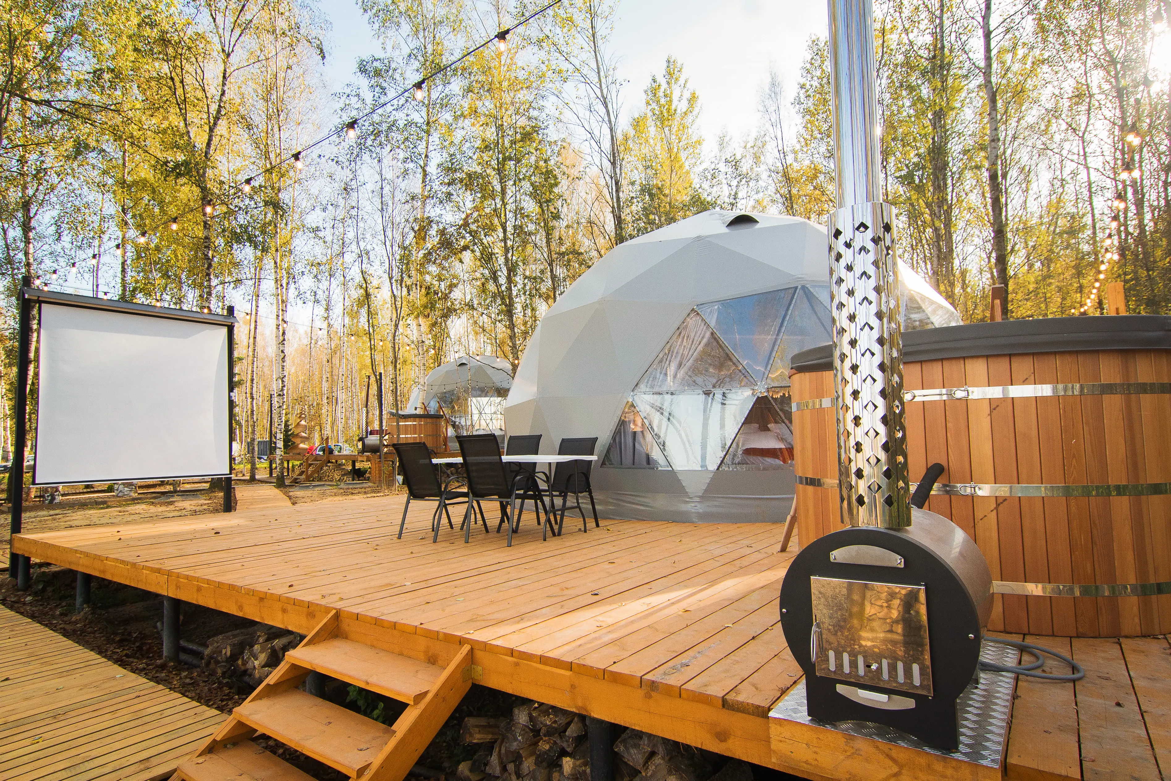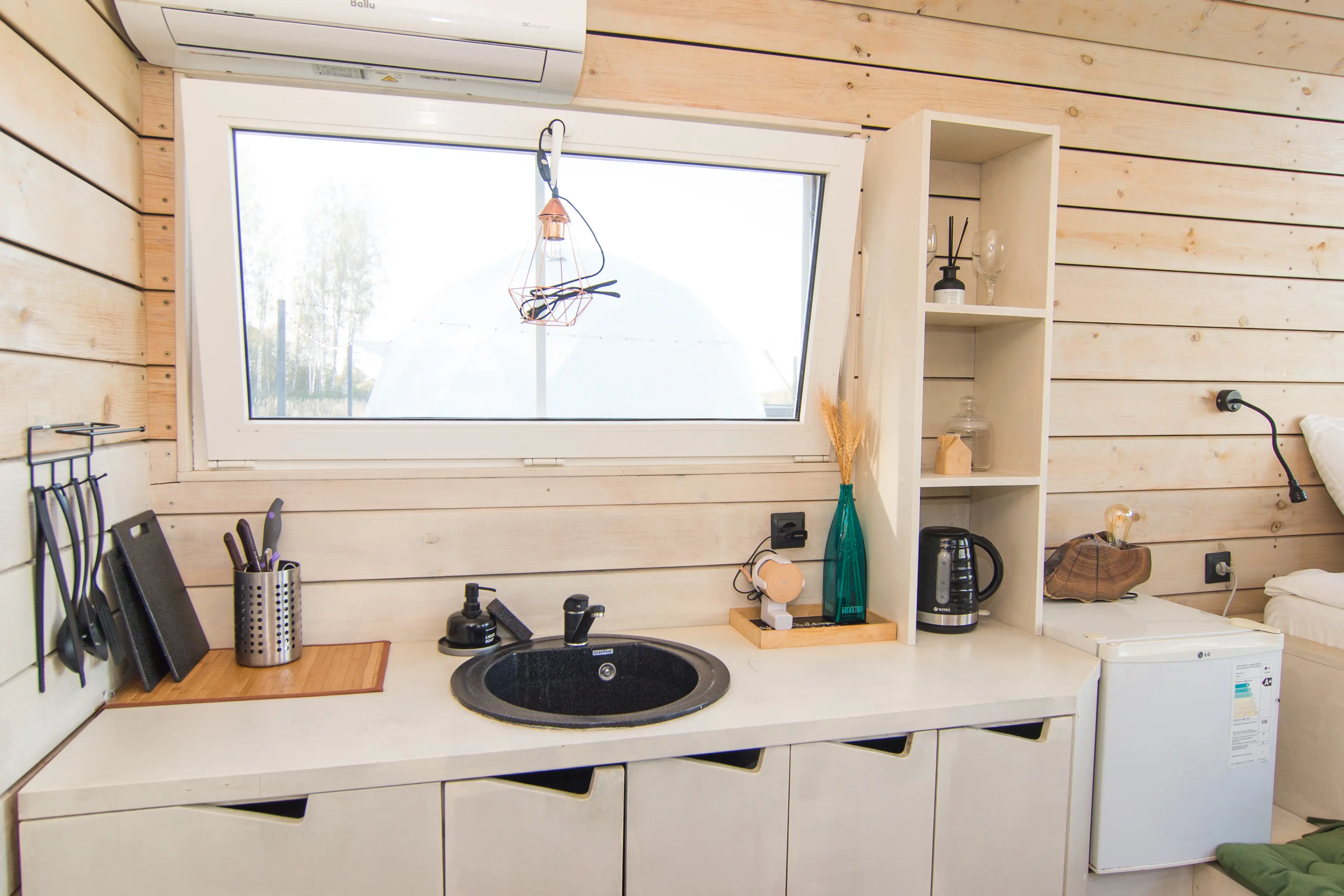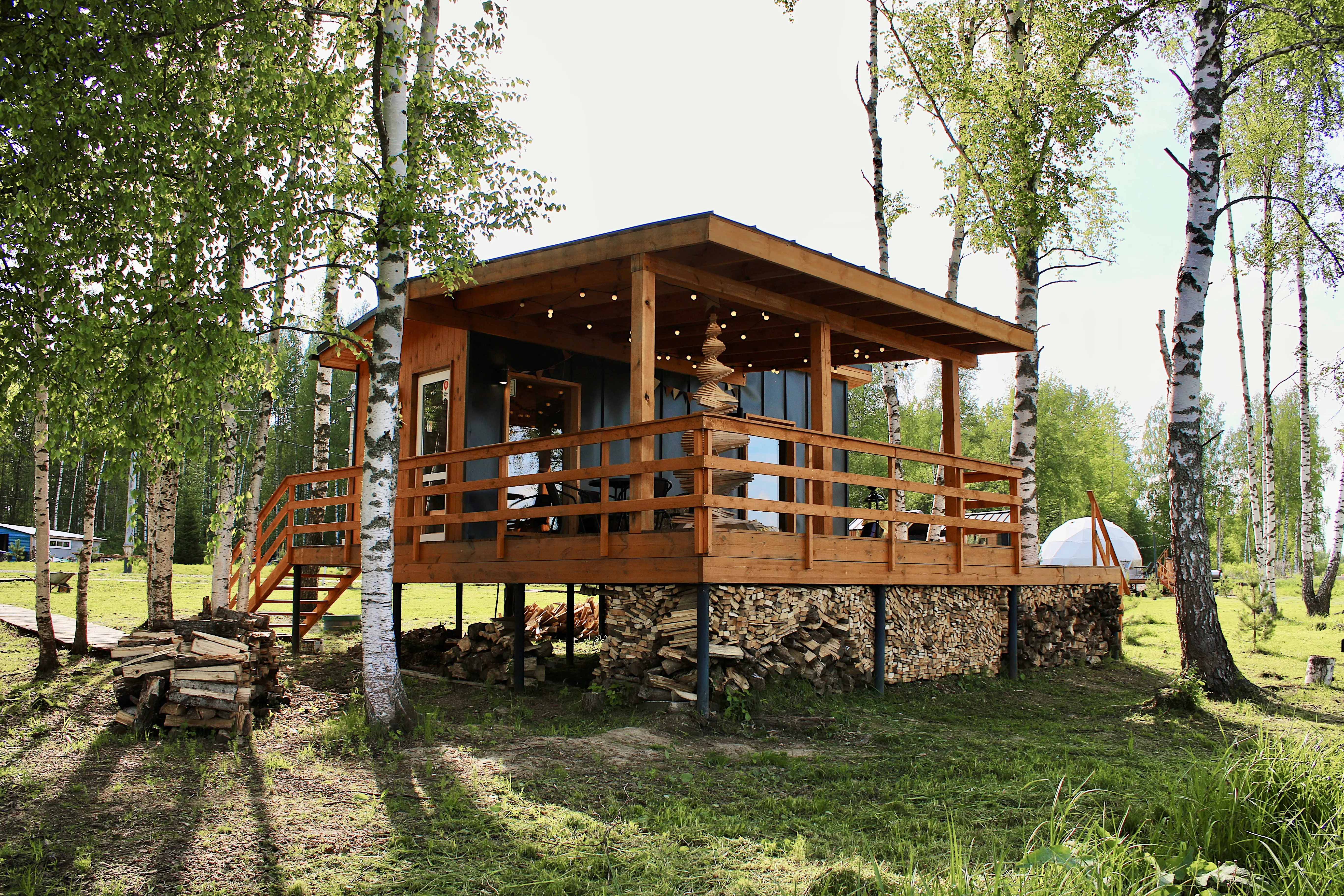 Оптимальный вариант проживания здесь найдётся для любой компании: домики для двоих, сферы средней вместимости и просторные барнхаусы. Везде вас ждут продуманный уютный интерьер, полноценно оснащённая кухня с обеденной зоной, собственные терраса и мангал.