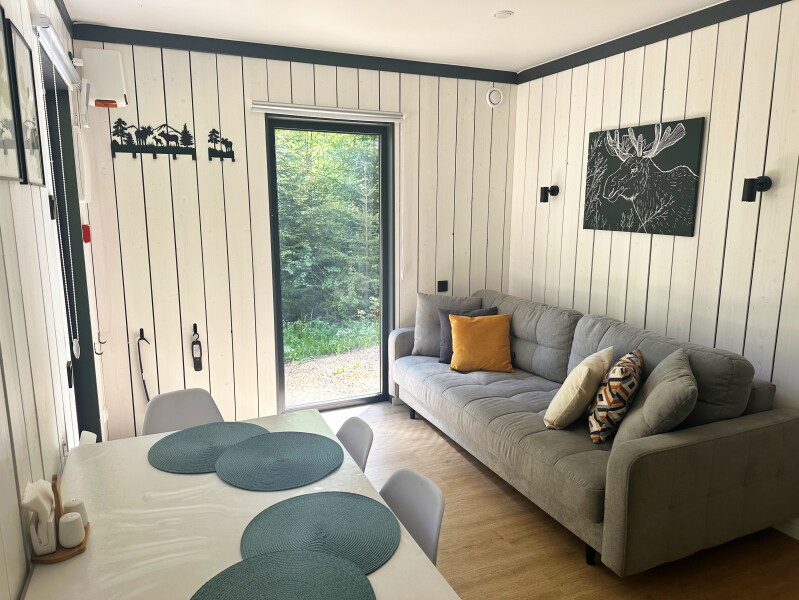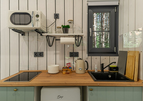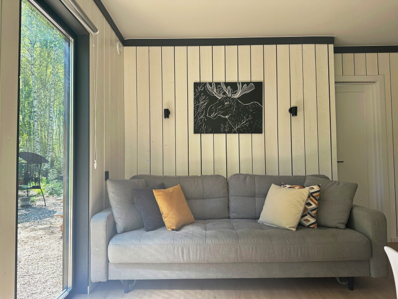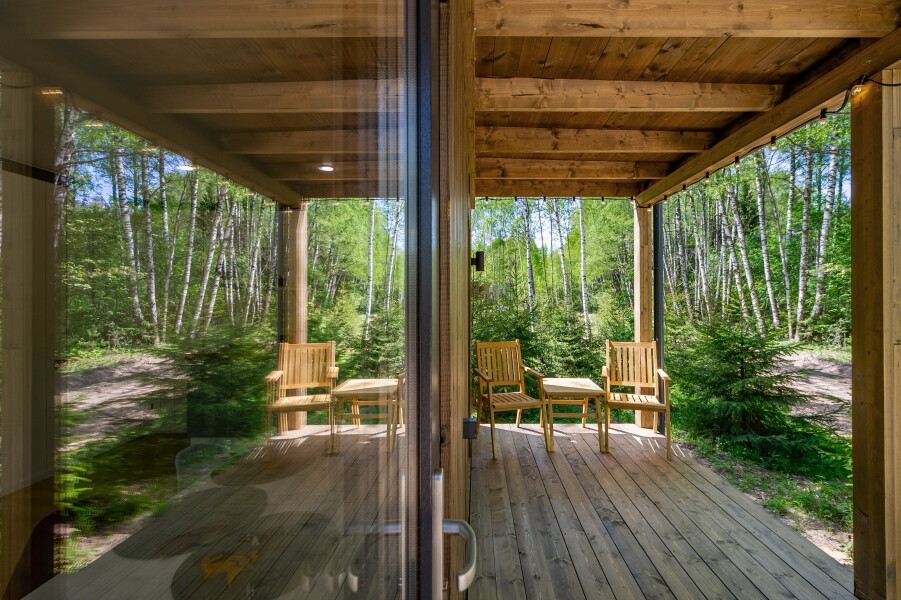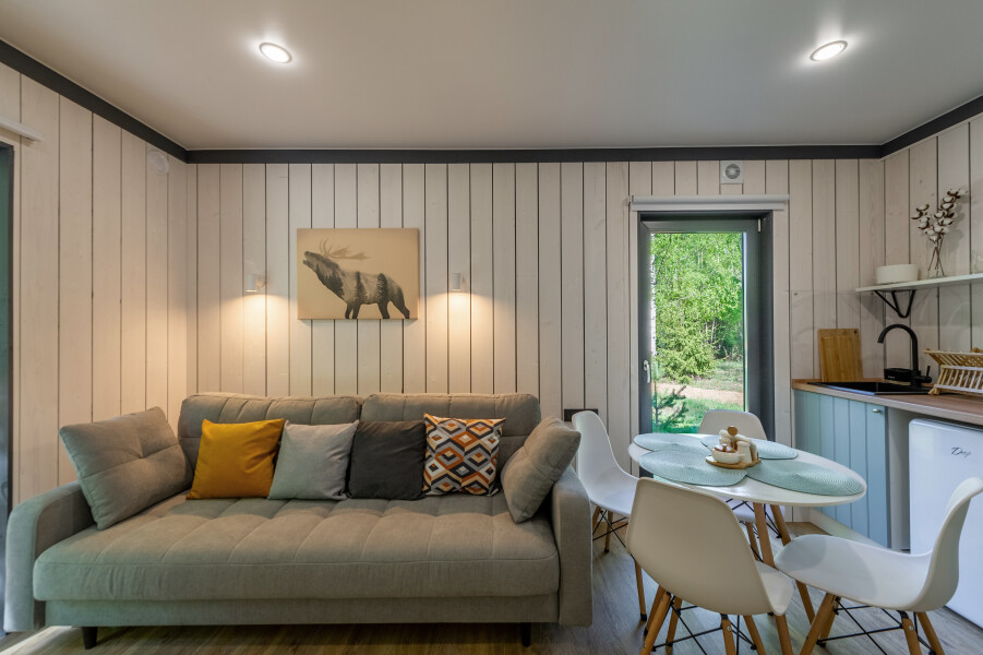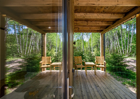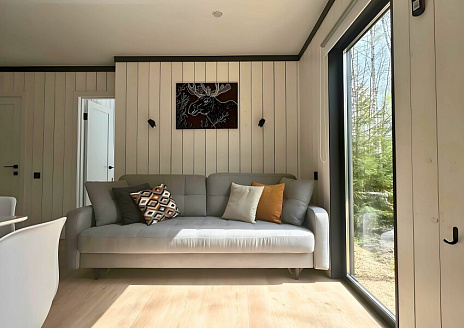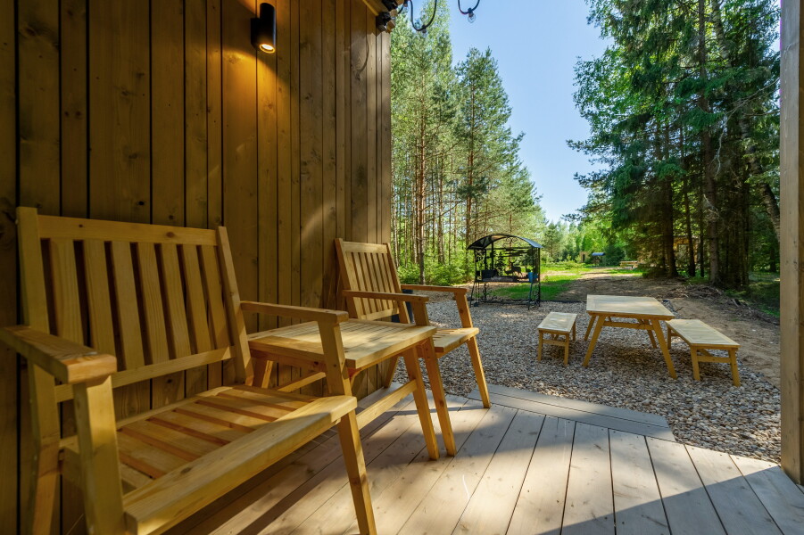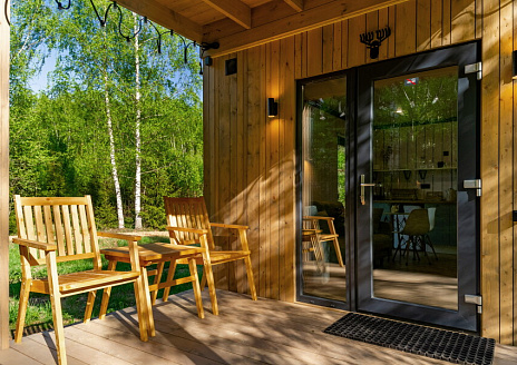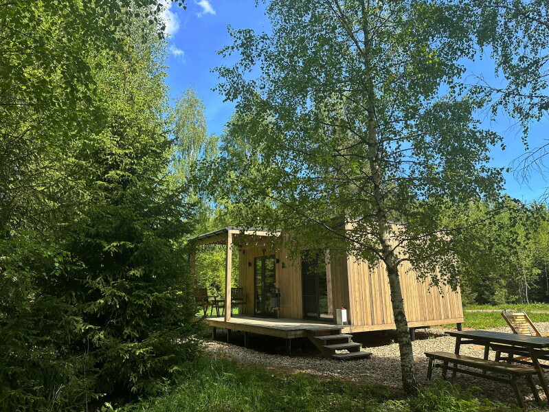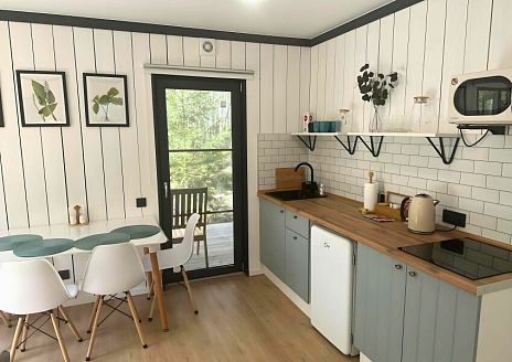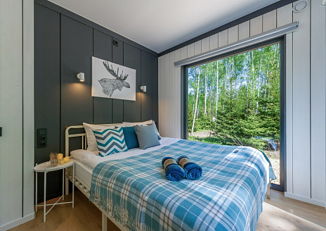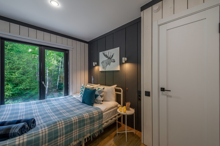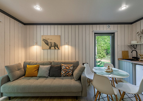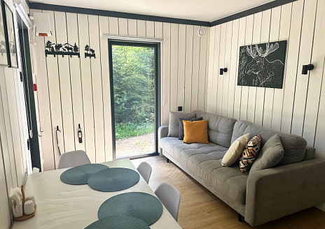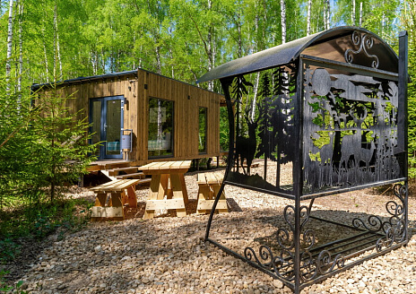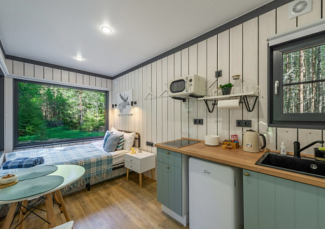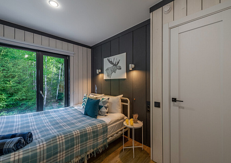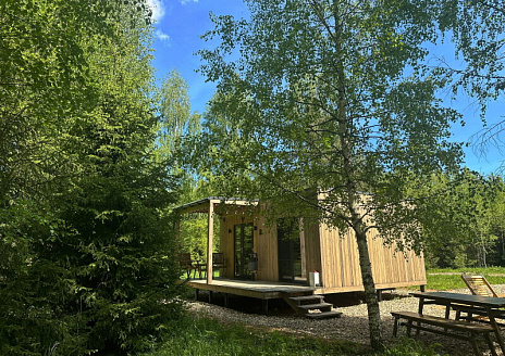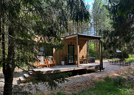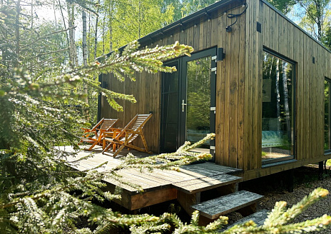 Здесь гостей ждут полностью оборудованные домики в скандинавском стиле с панорамными окнами. На территории есть велосипеды прогулок по окрестностям, спортивный инвентарь, зоны для барбекю, банкетный зал, караоке и прокат проектора для просмотра любимых фильмов. Также в распоряжении гостей: лесная баня с панорамными окнами и купели.