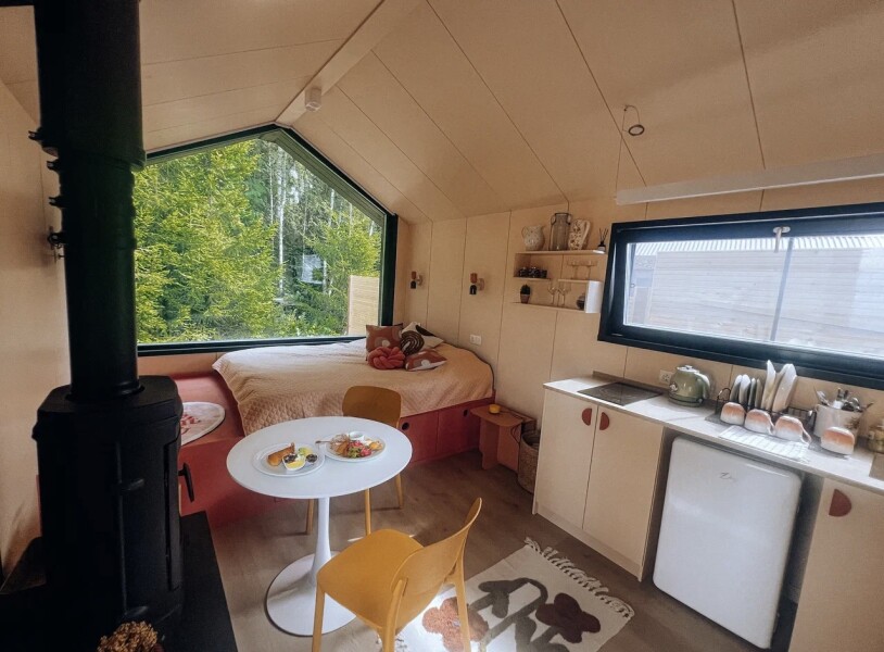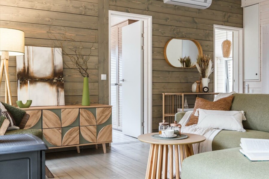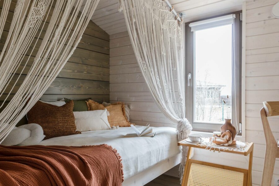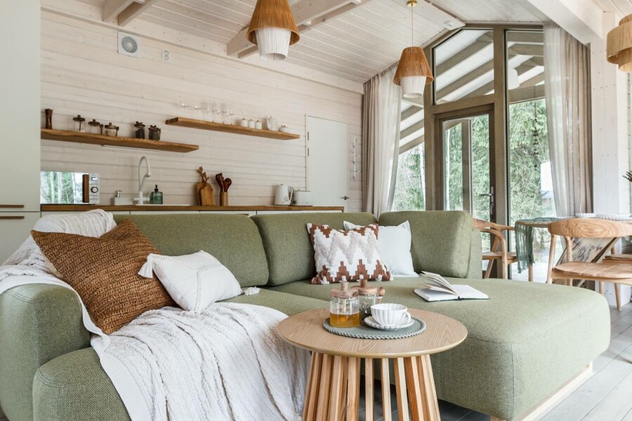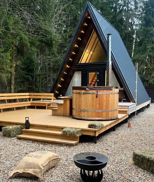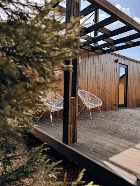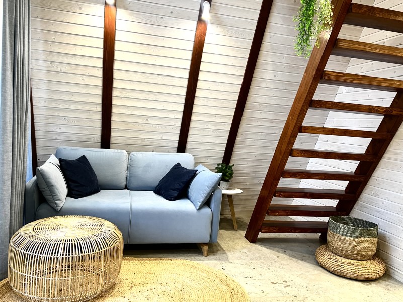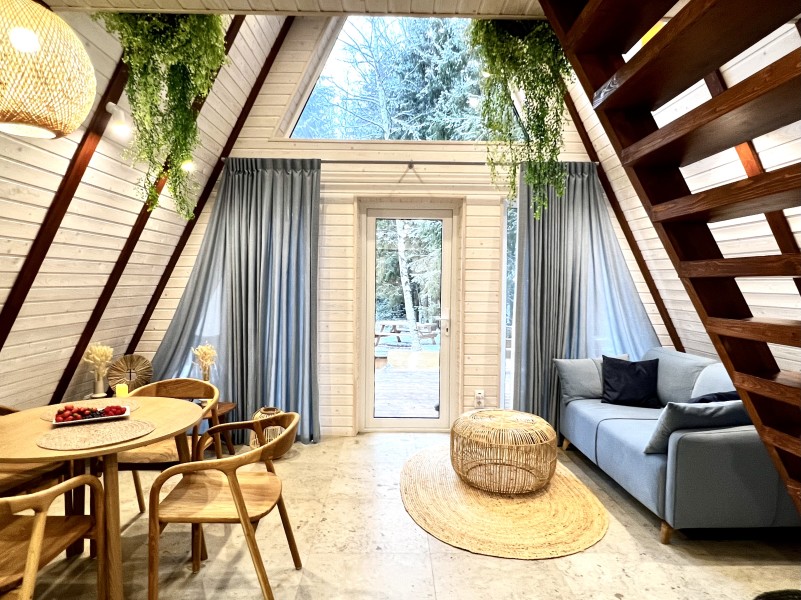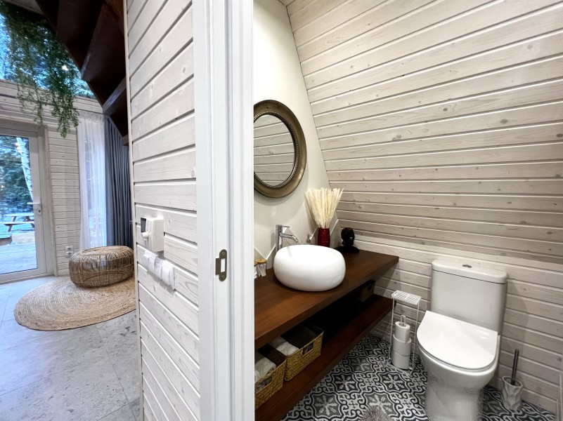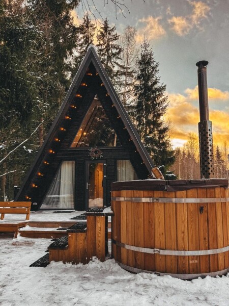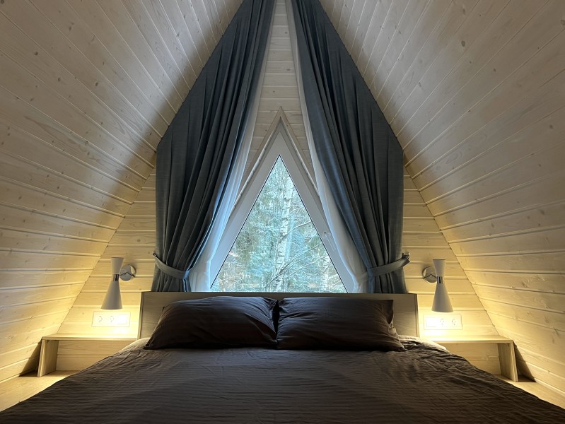 Для гостей открыты несколько разных по типу и площади домиков. В каждом из них вас ждут уютный и стильный интерьер, красивый вид и полноценный городской комфорт со всеми удобствами: кухней, санузлом, тёплым полом, кондиционером. В Шале есть банька, в остальных домиках — персональный банный чан-фурако под открытым небом.