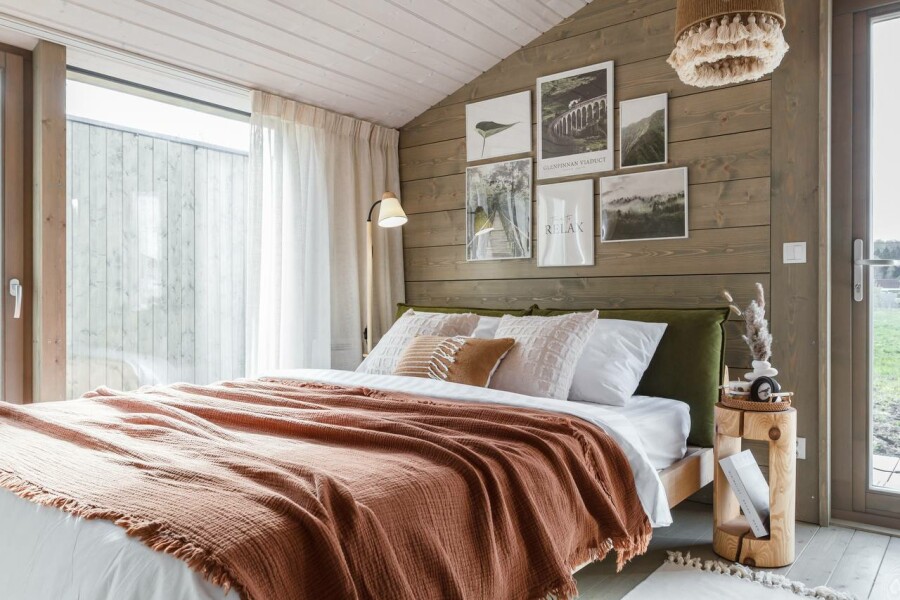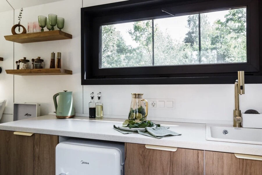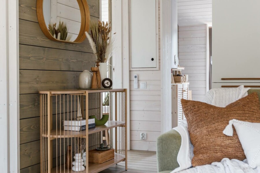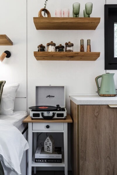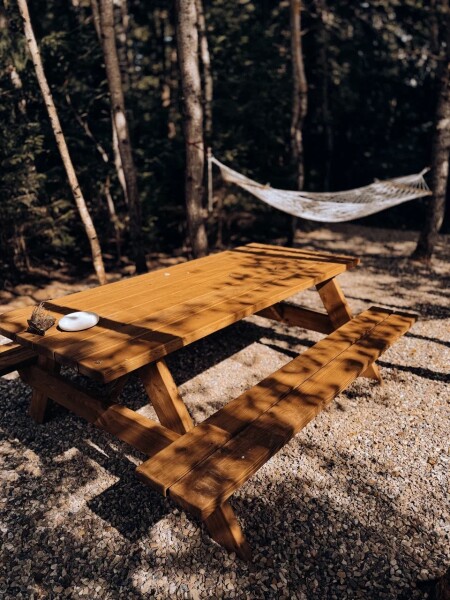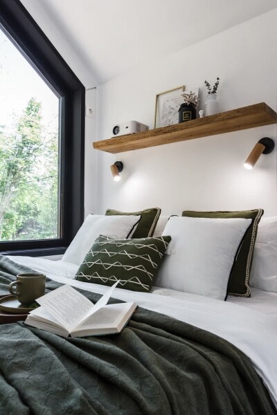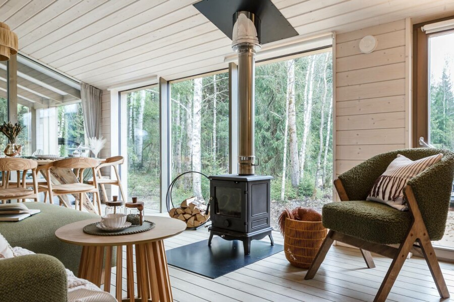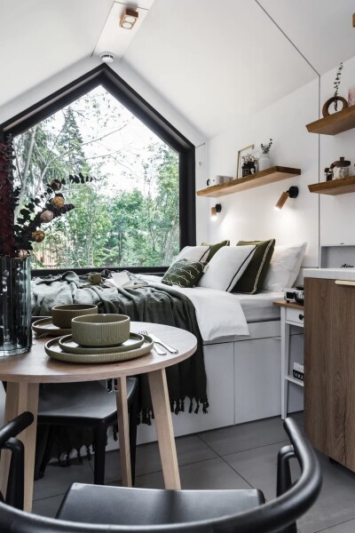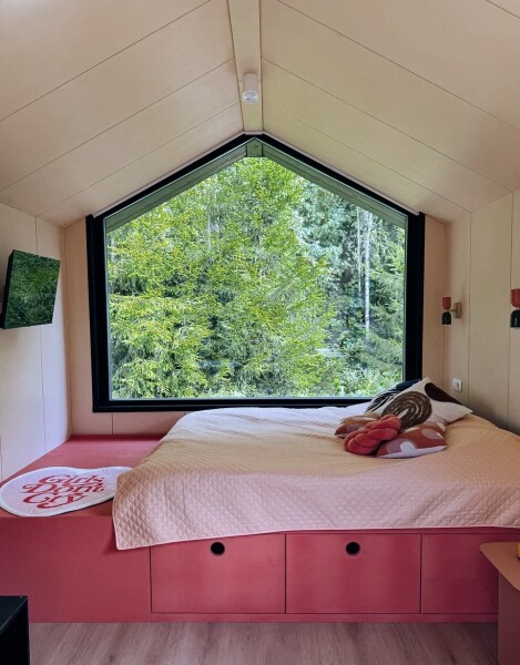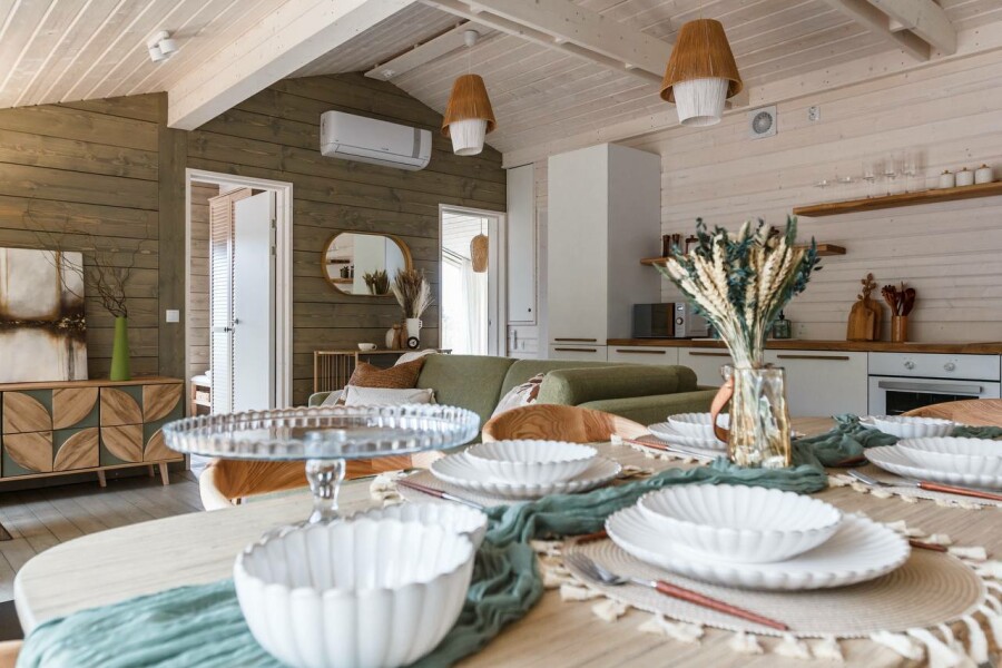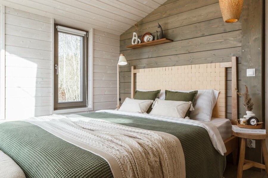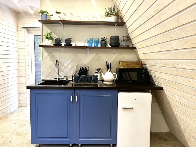 Для гостей открыты несколько разных по типу и площади домиков. В каждом из них вас ждут уютный и стильный интерьер, красивый вид и полноценный городской комфорт со всеми удобствами: кухней, санузлом, тёплым полом, кондиционером. В Шале есть банька, в остальных домиках — персональный банный чан-фурако под открытым небом.