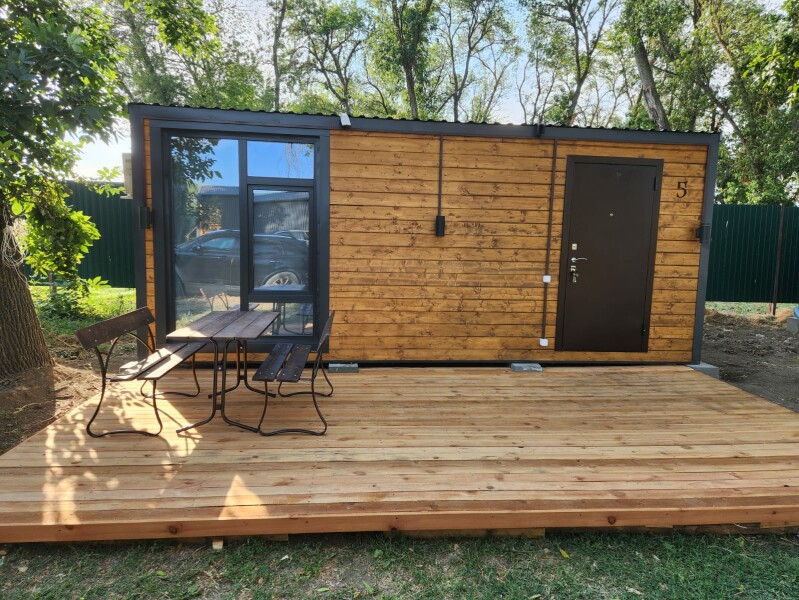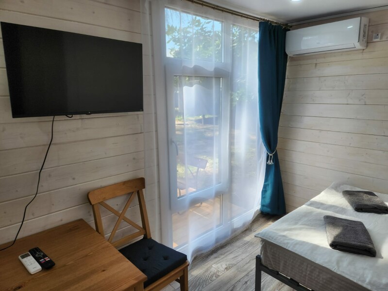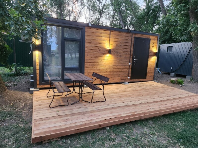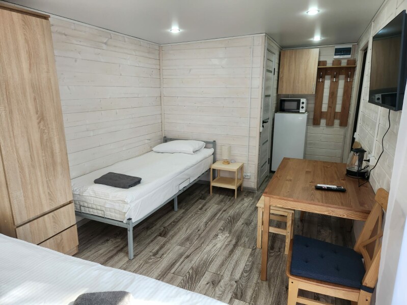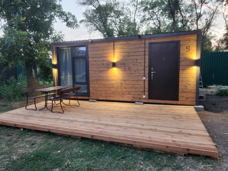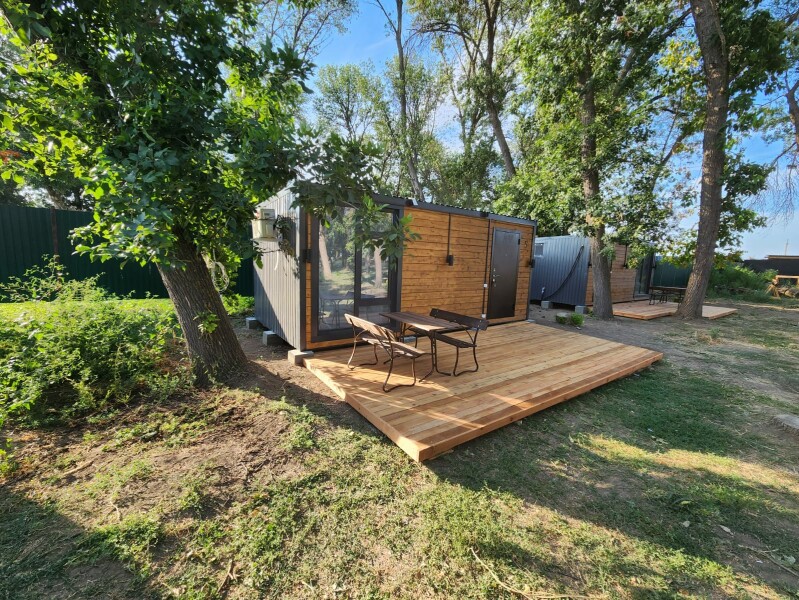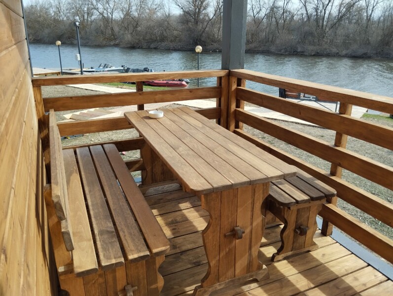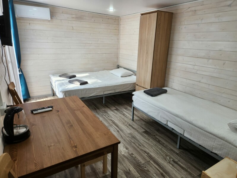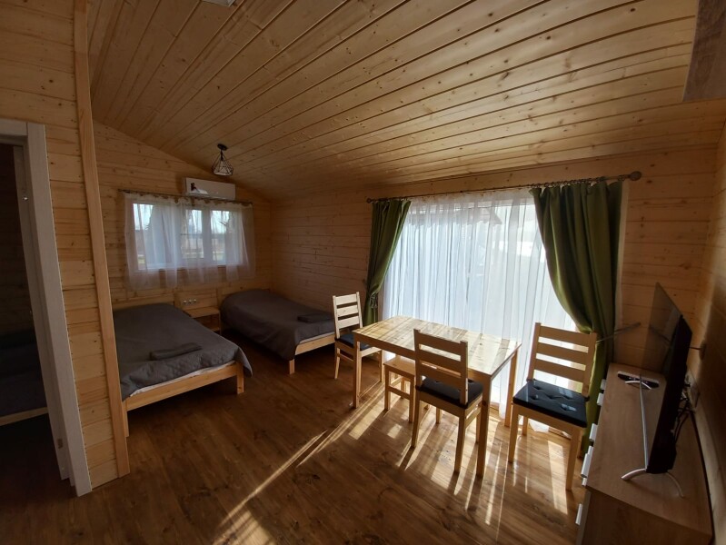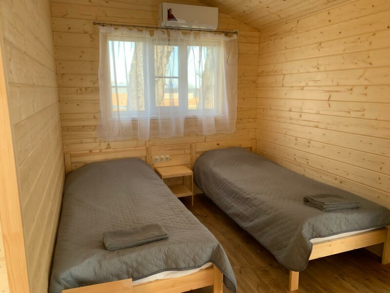 Домики оборудованы всем необходимым, а на территории базы имеется кафе-столовая. Здесь предлагается трофейная рыбалка, подводная охота и охота на дичь в лесах Камызякского района. Для удобства гостей предоставляется трансфер и услуги опытных егерей.