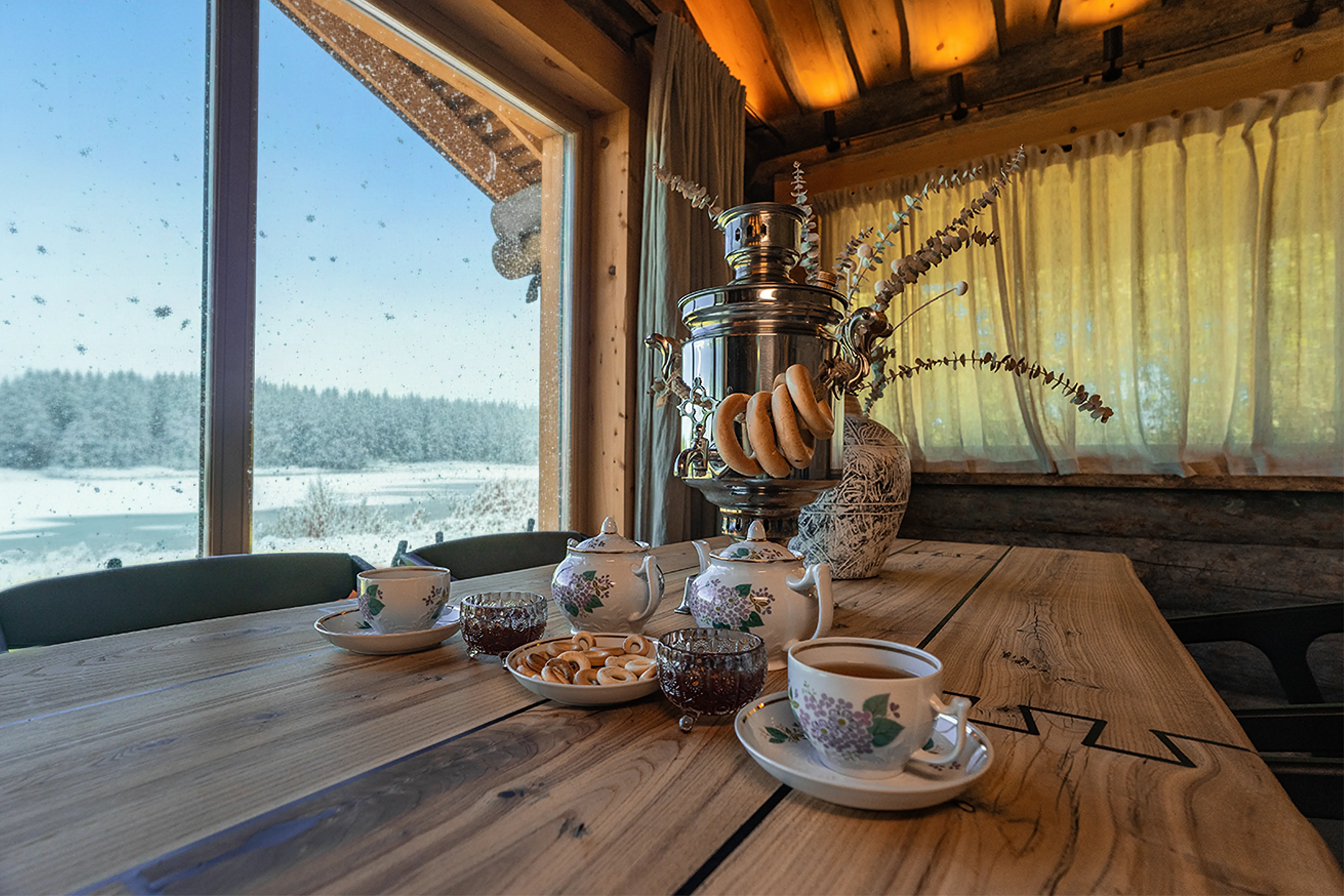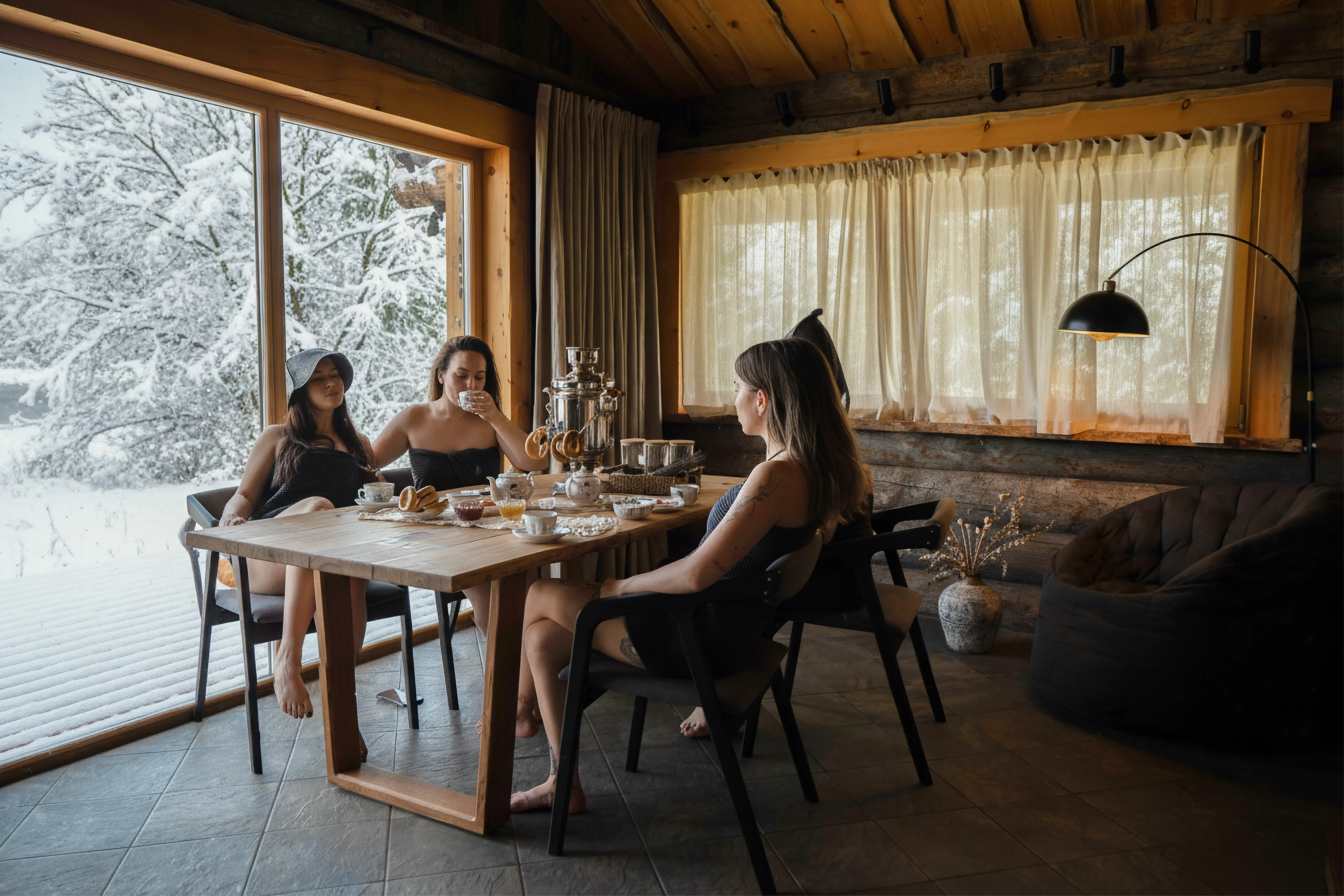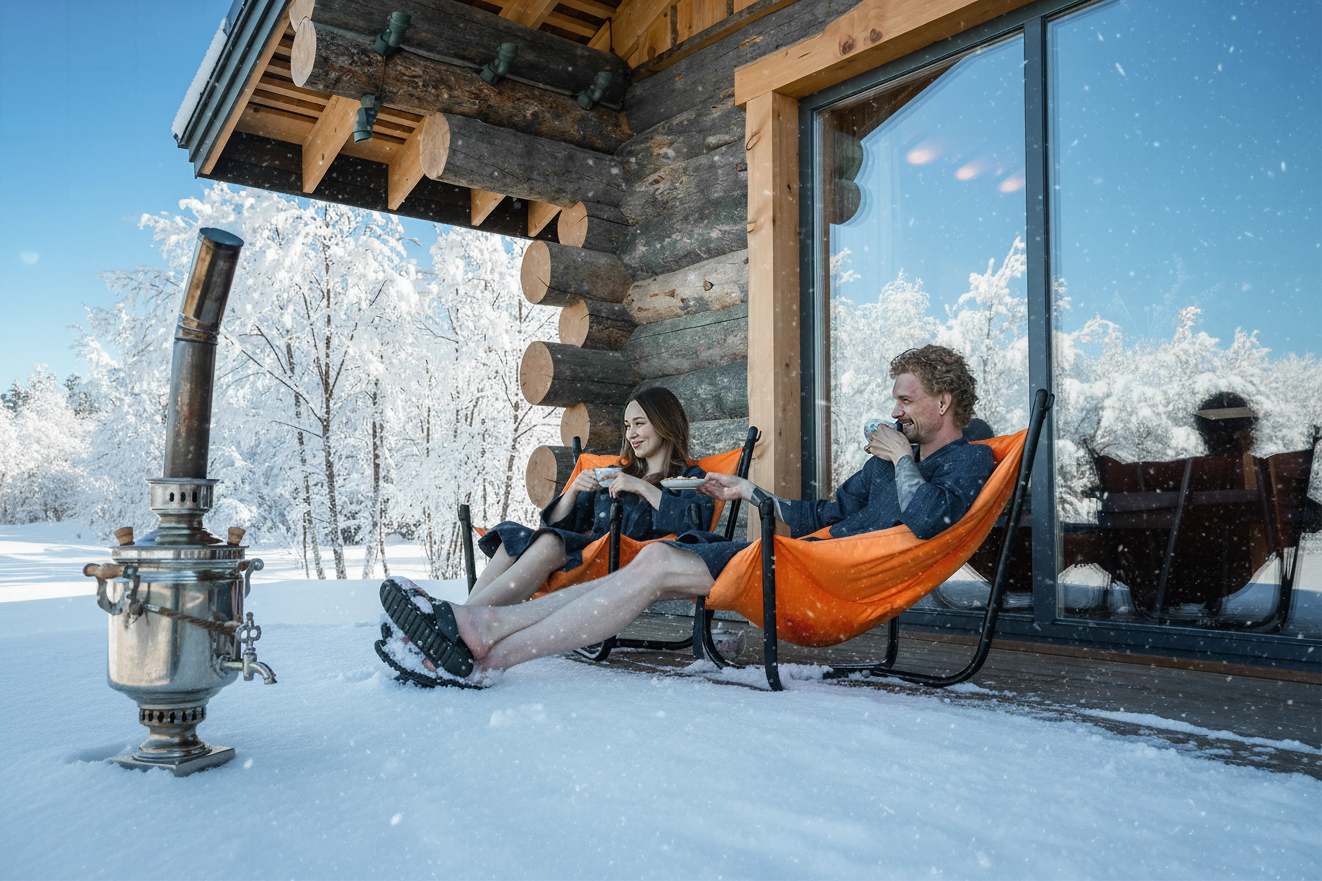На территории комплекса гости могут насладиться уединенным отдыхом у костра, приготовлением шашлыков в мангальной зоне, рыбалкой, прогулками по лесу, водными развлечениями, арендой квадроциклов и велосипедов, также конными прогулками и посещением оленьей фермы. Предусмотрена волейбольная площадка и детская площадка с горкой, качелями и песочницей.