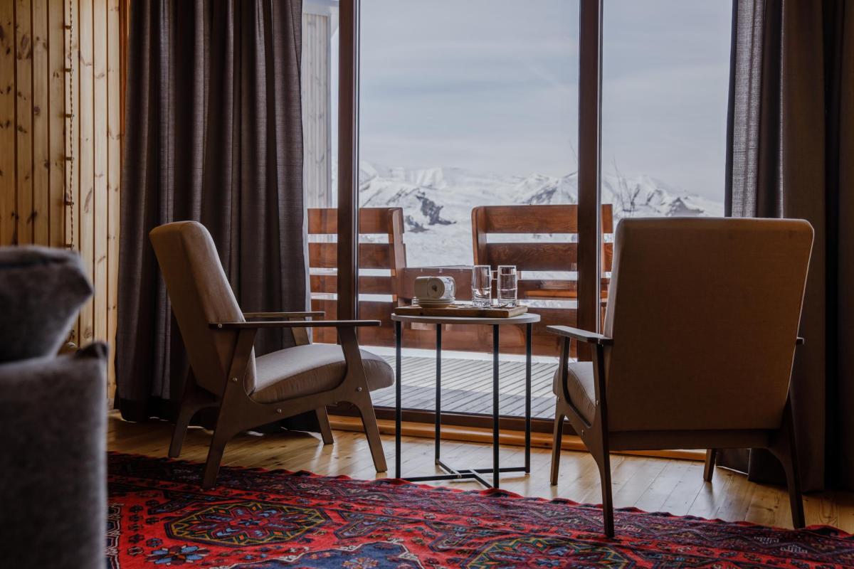На территории: ресторан с блюдами кавказской и европейской кухни, баня с видом на горы, зона кинотеатра, аренда проектора, терраса для йоги и пикников. Вокруг: берёзовый лес РАДЕ, горные ручьи, пещеры и водопады. Работает быстрый Wi-Fi.
