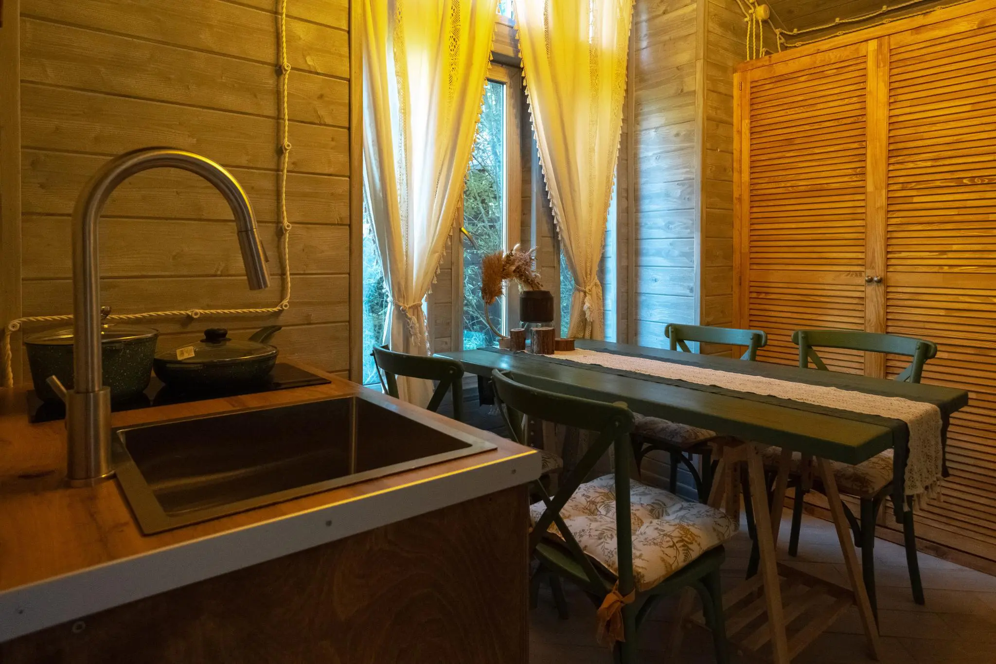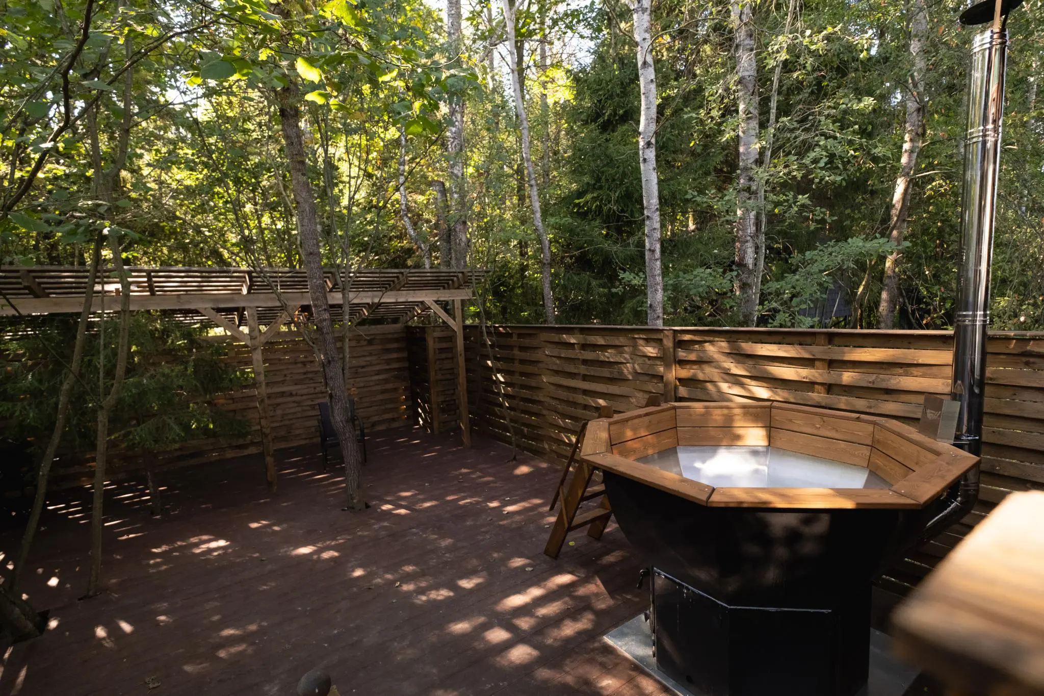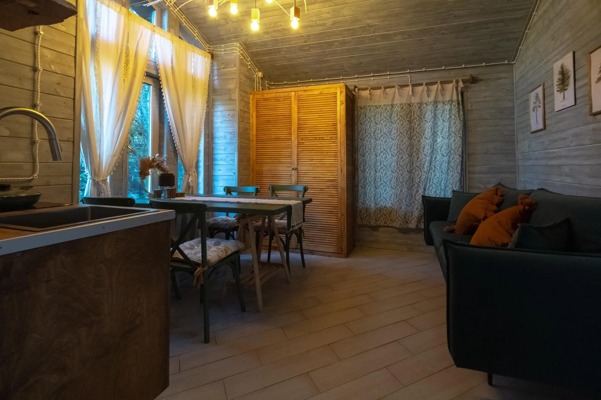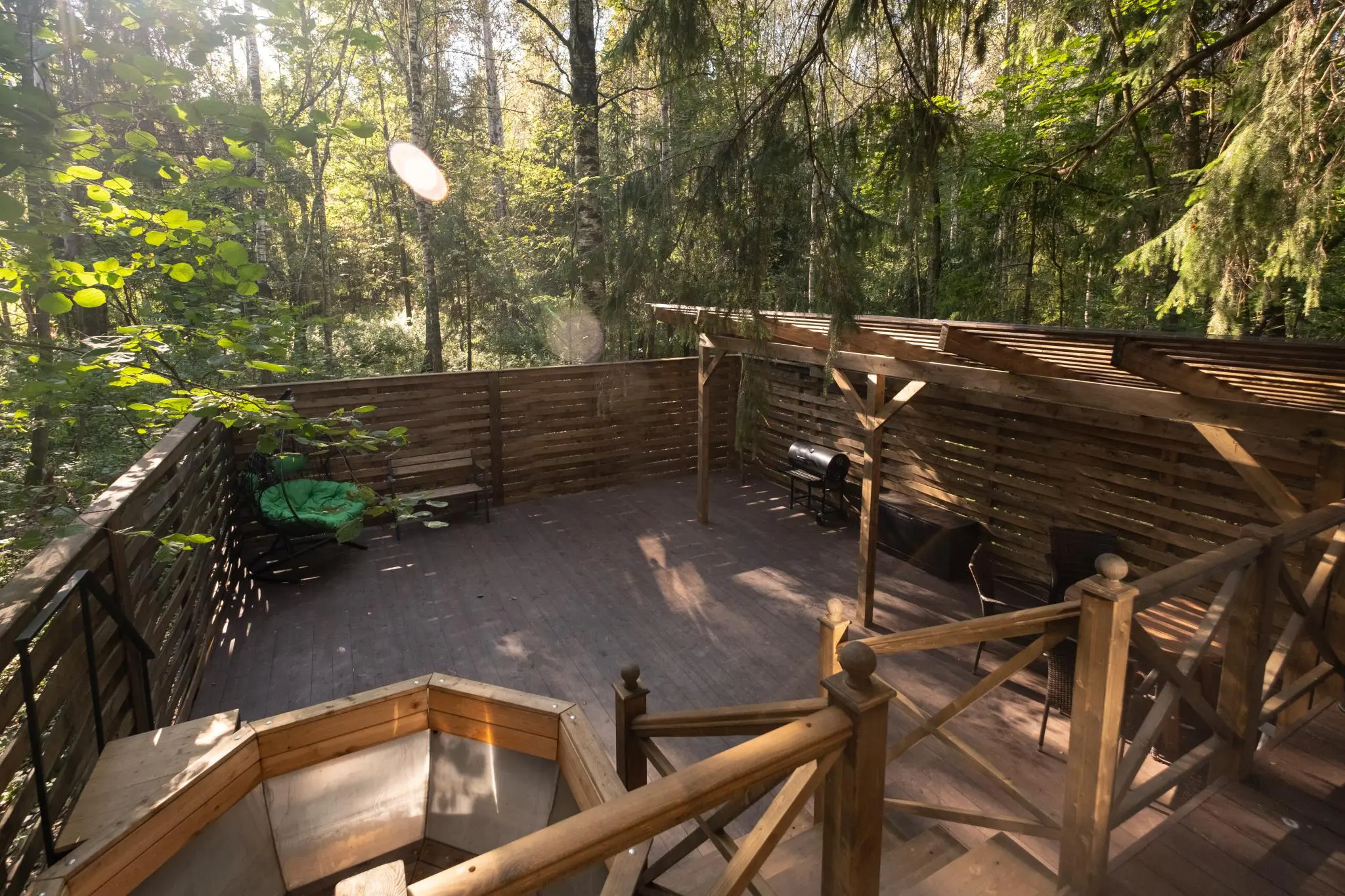 У каждого домика есть закрытая веранда с мангальной зоной и грилем. Для отдыха на свежем воздухе предусмотрены: настоящая дровяная баня, сибирские чаны и купели с горячей водой. Гости могут наслаждаться прогулками по лесу, общением с домашними животными на территории (кроликами и курочками), а также проводить время в домике за настольными играми, караоке и просмотром фильмов с помощью видеопроектора.