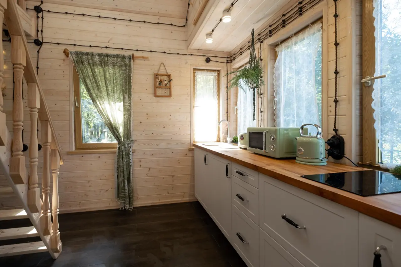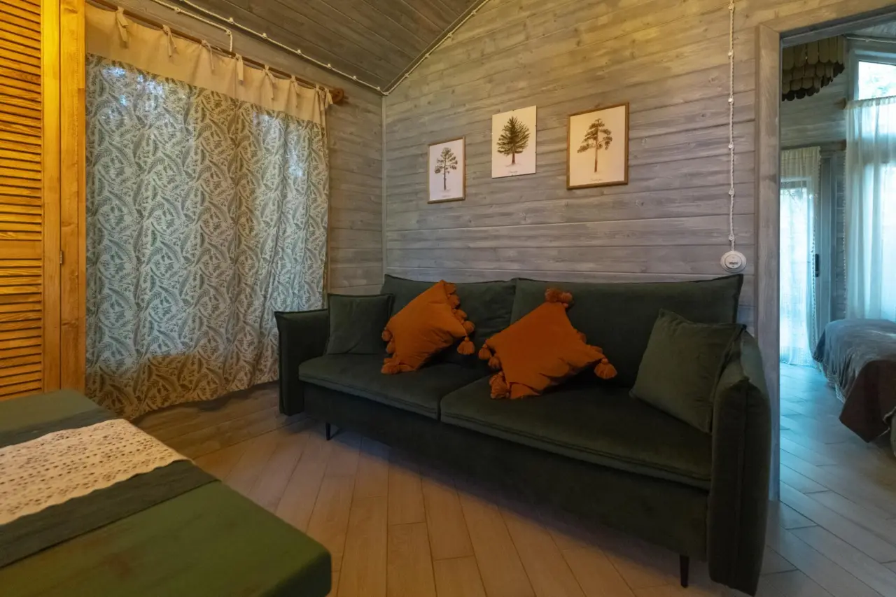 У каждого домика есть закрытая веранда с мангальной зоной и грилем. Для отдыха на свежем воздухе предусмотрены сибирские чаны и купели с горячей водой. Гости могут наслаждаться прогулками по лесу, общением с домашними животными на территории (кроликами и курочками), а также проводить время в домике за настольными играми, караоке и просмотром фильмов с помощью видеопроектора.