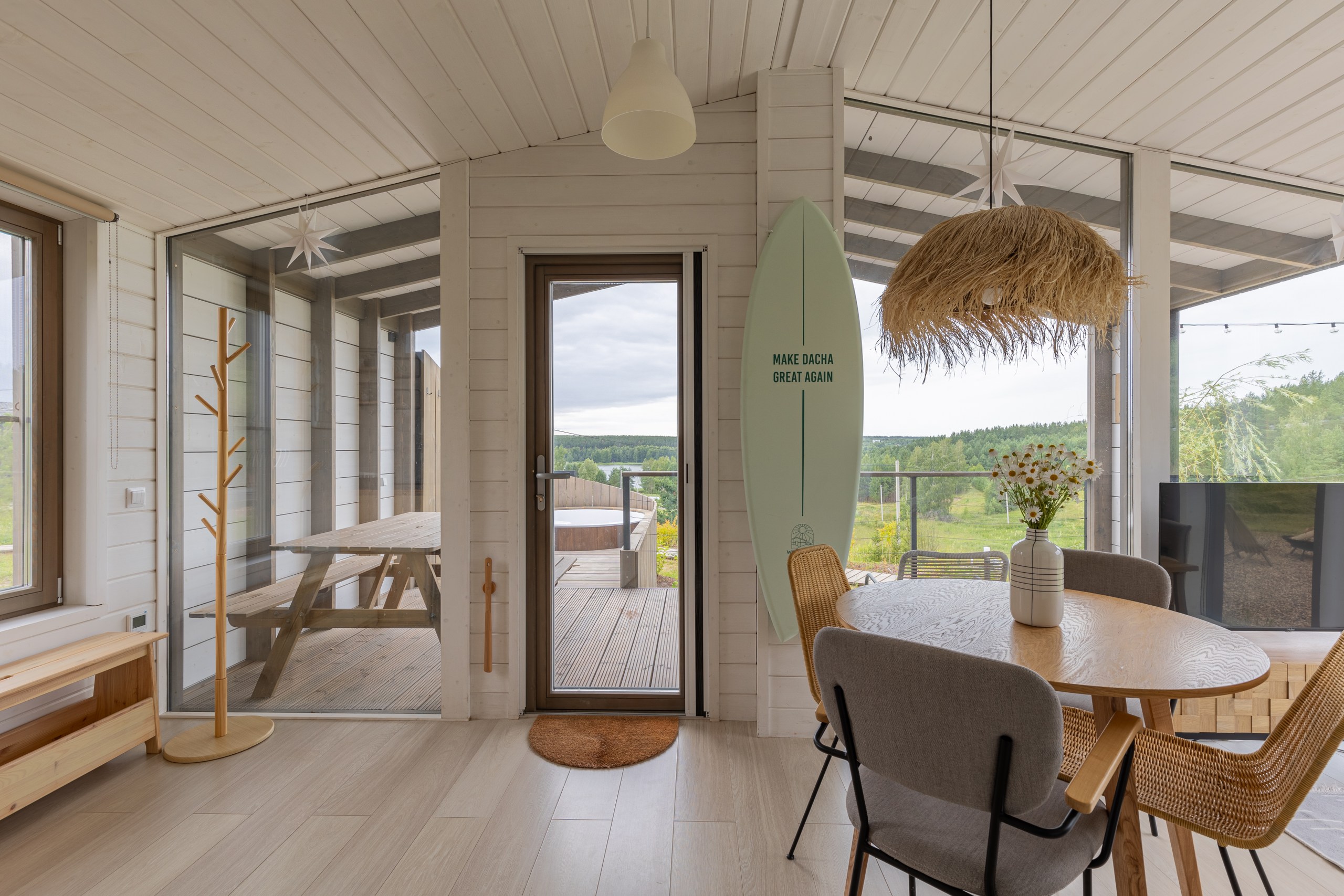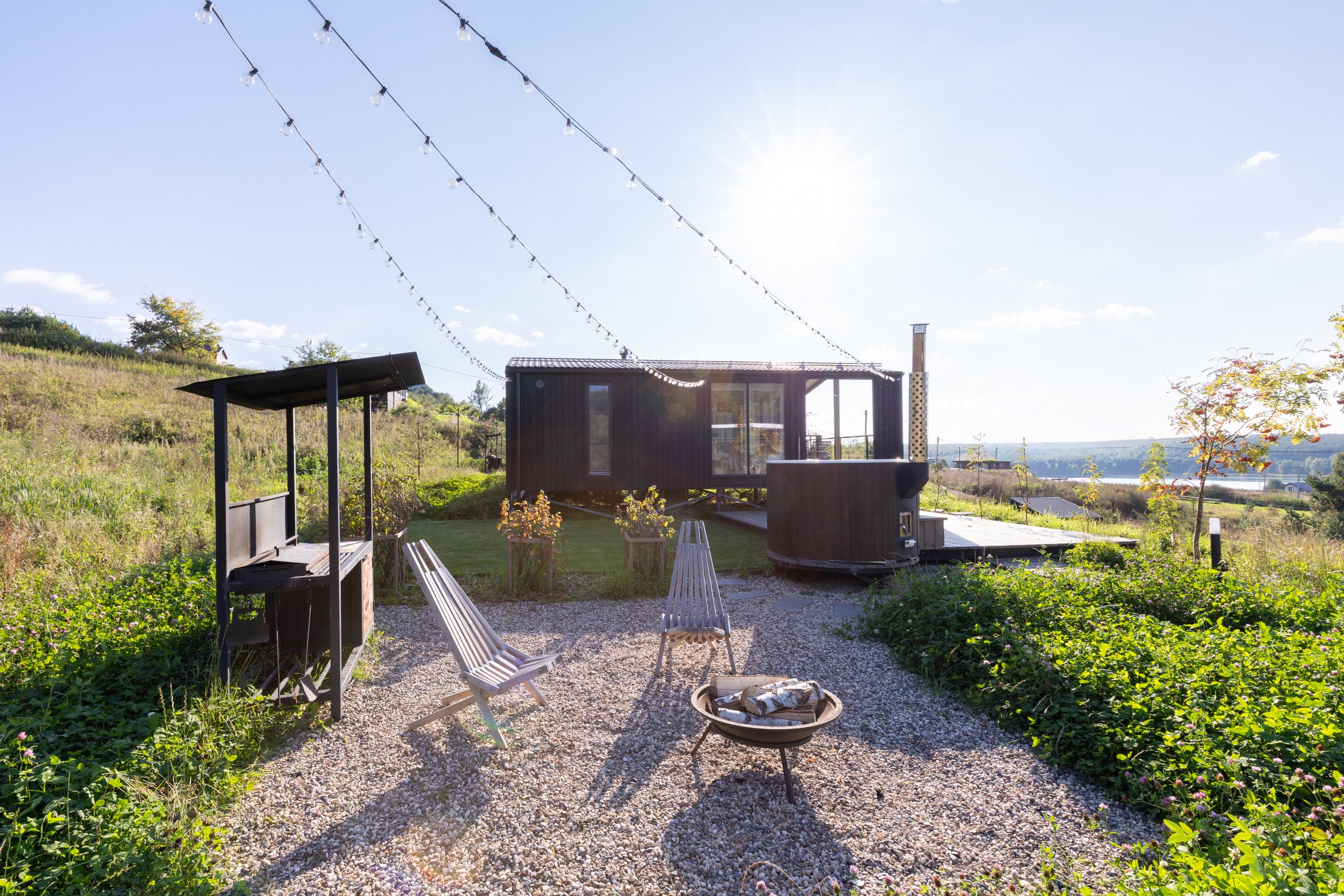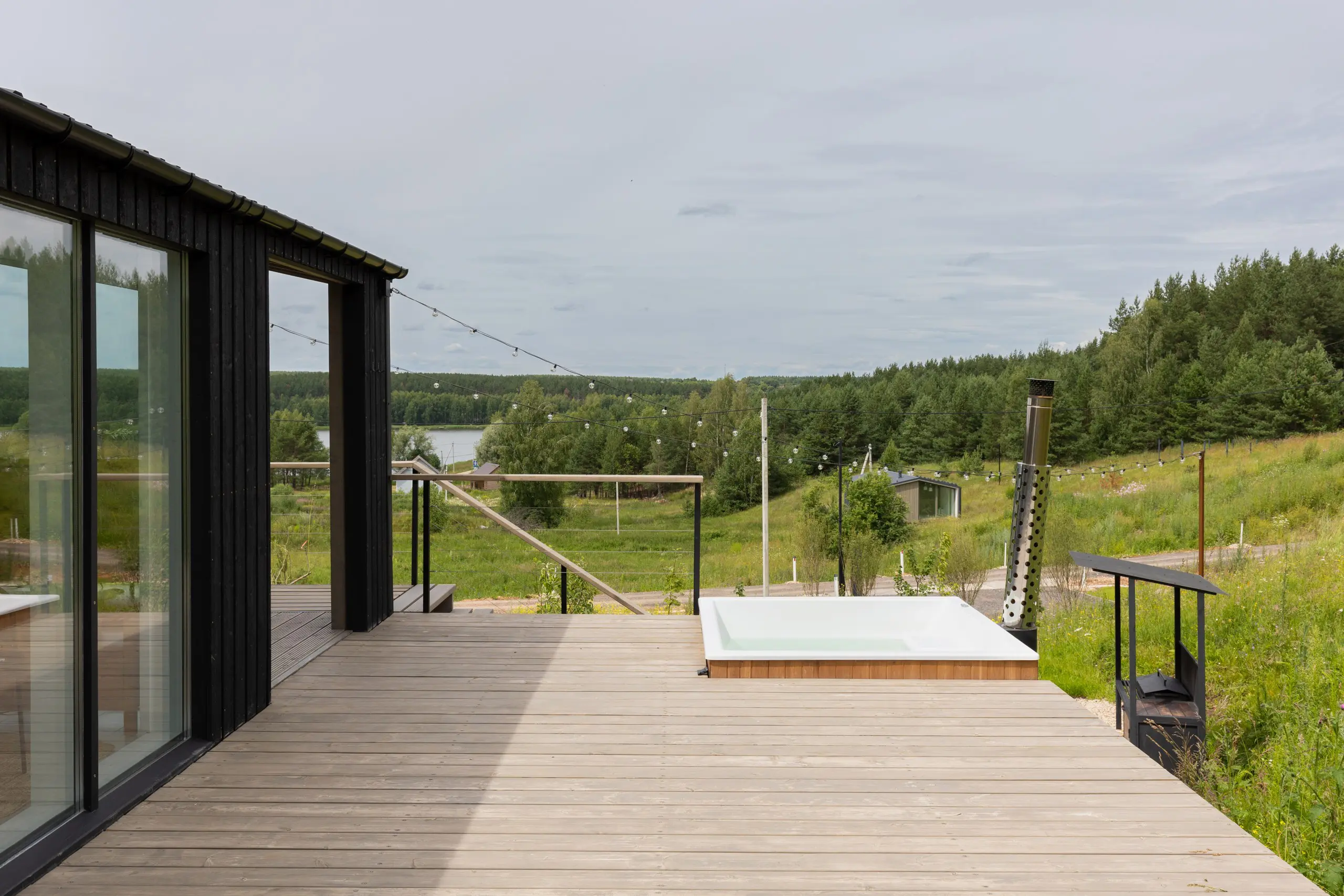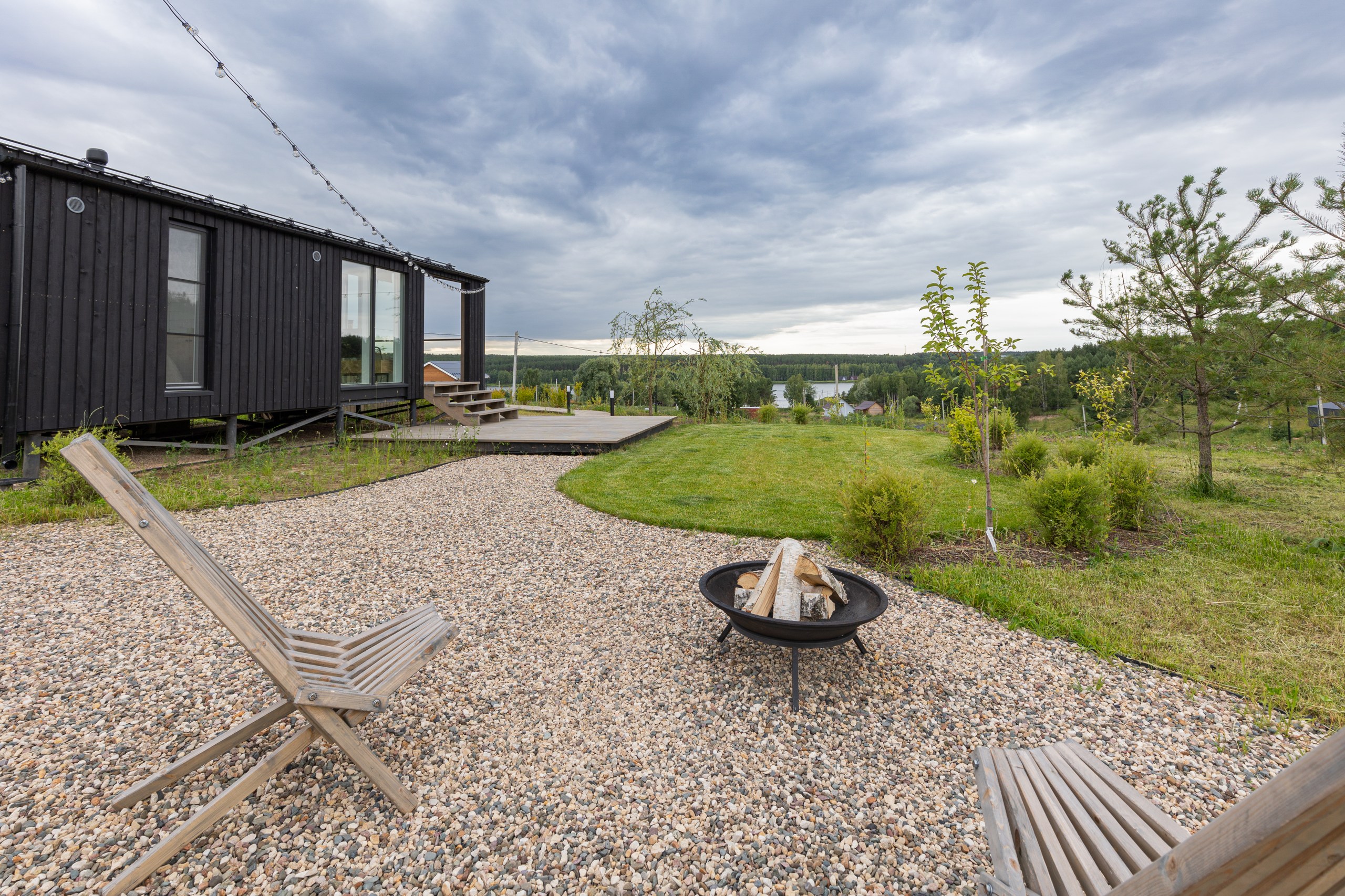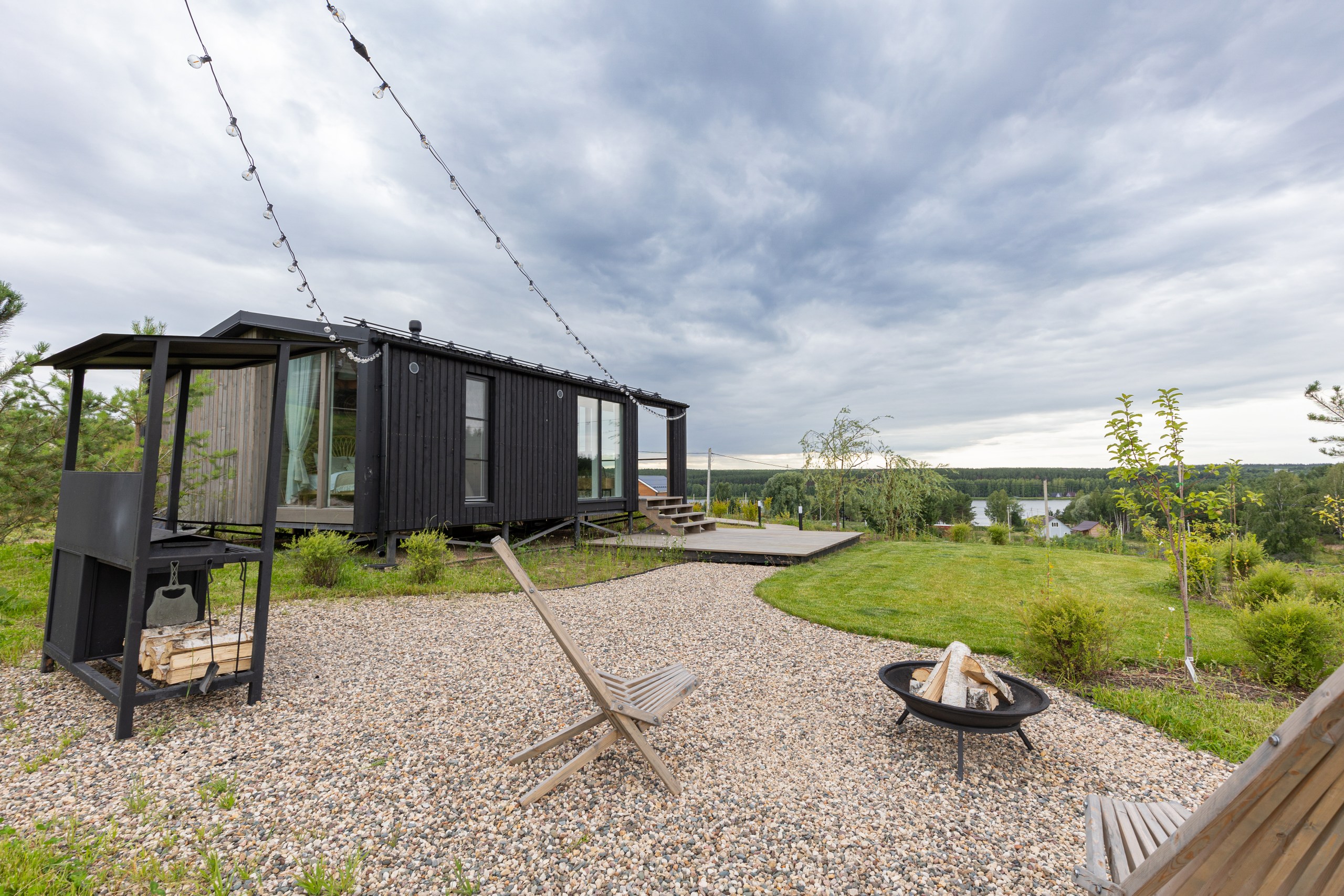 Вас ждут светлые домики с панорамными окнами, уютными спальнями и просторной кухней-гостиной, а на террасе каждого дома есть горячая купель с аэромассажем. Зоны отдыха оборудованы мангалами и костровыми чашами для вечерних посиделок.