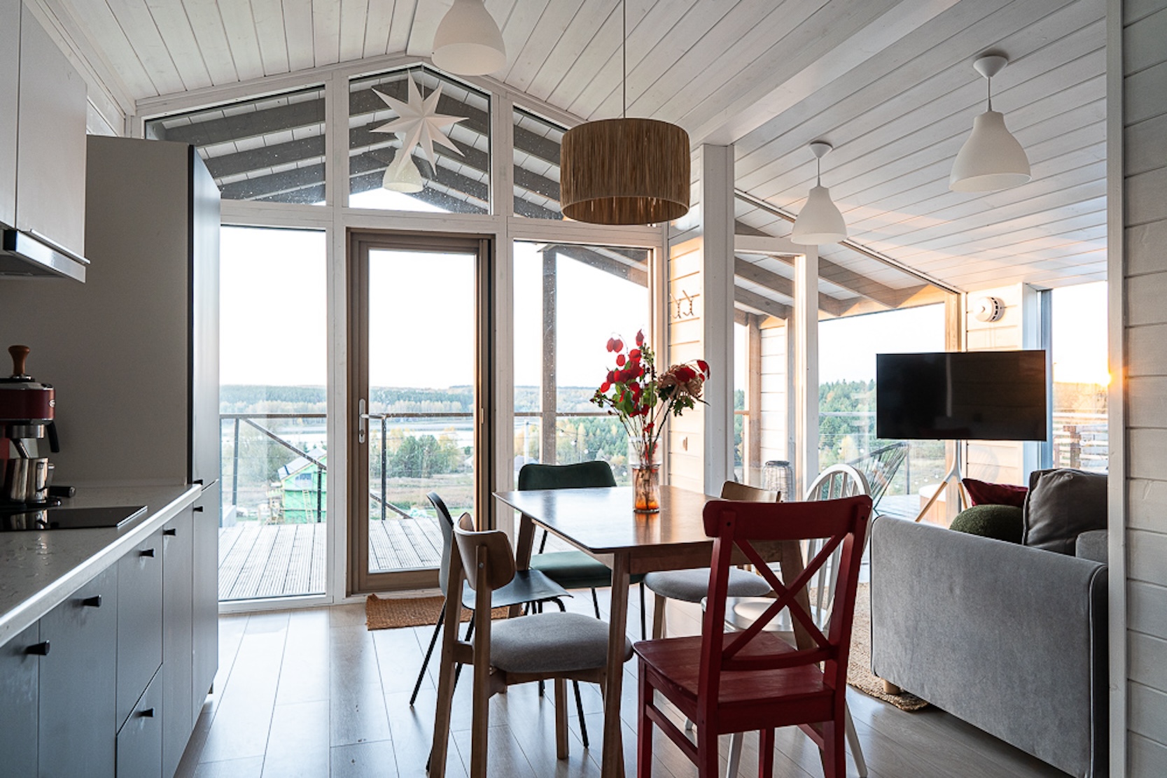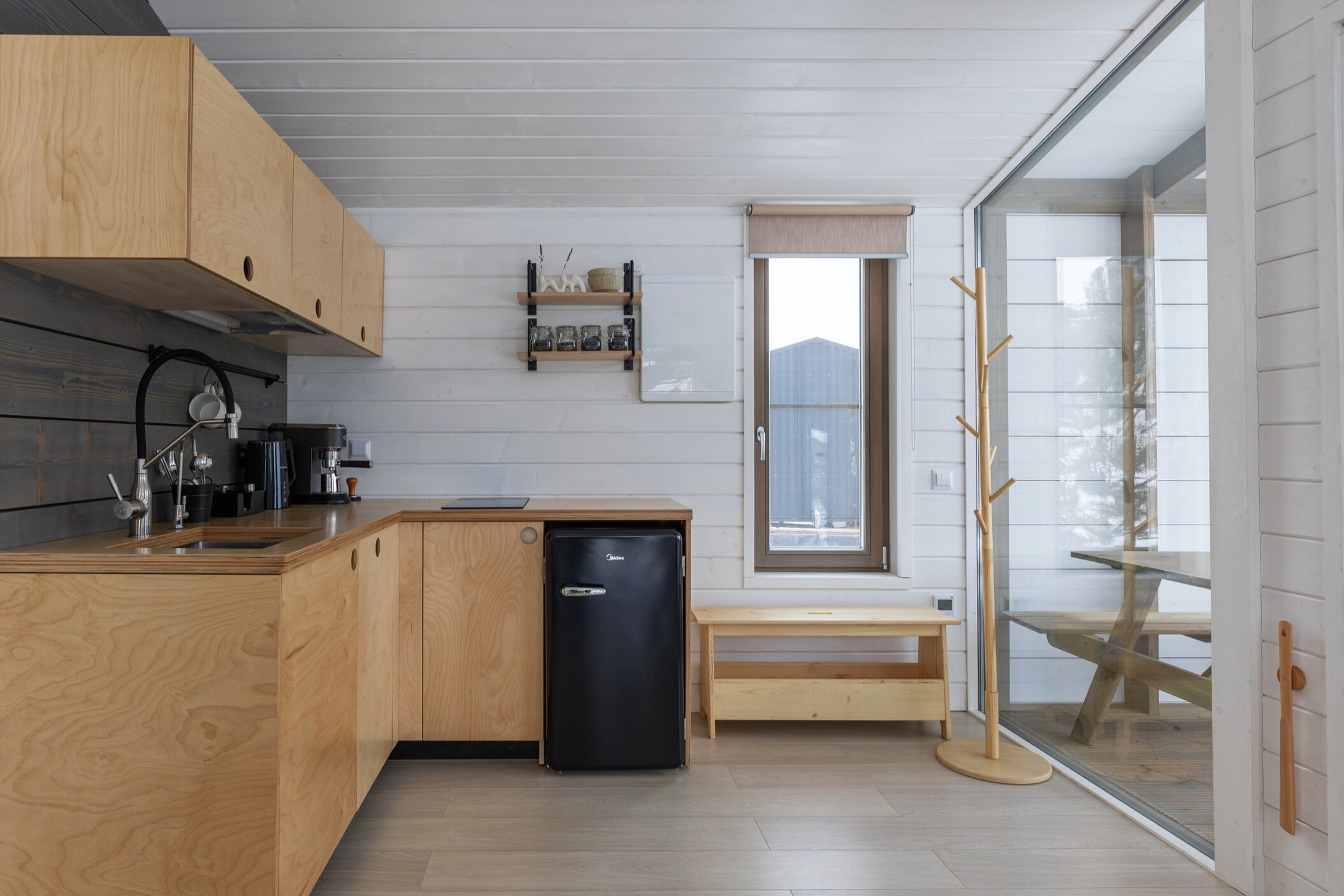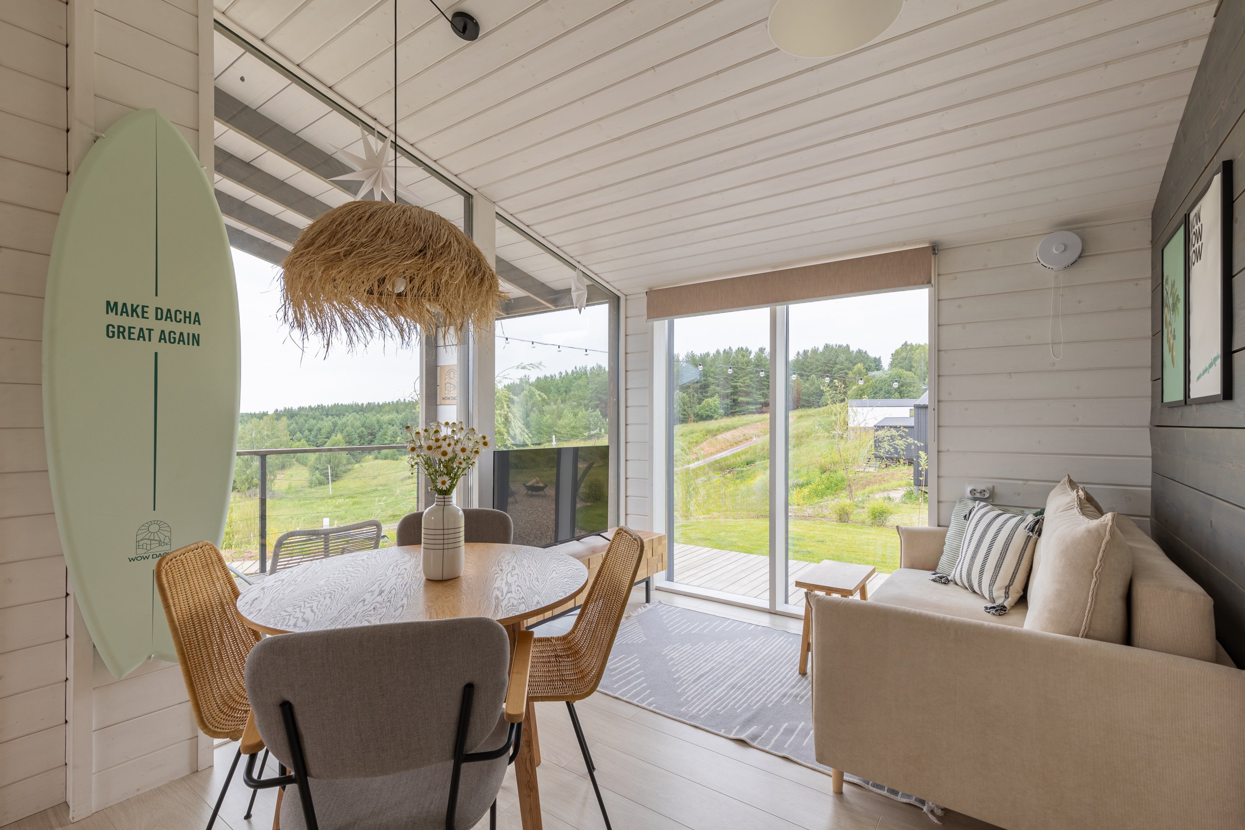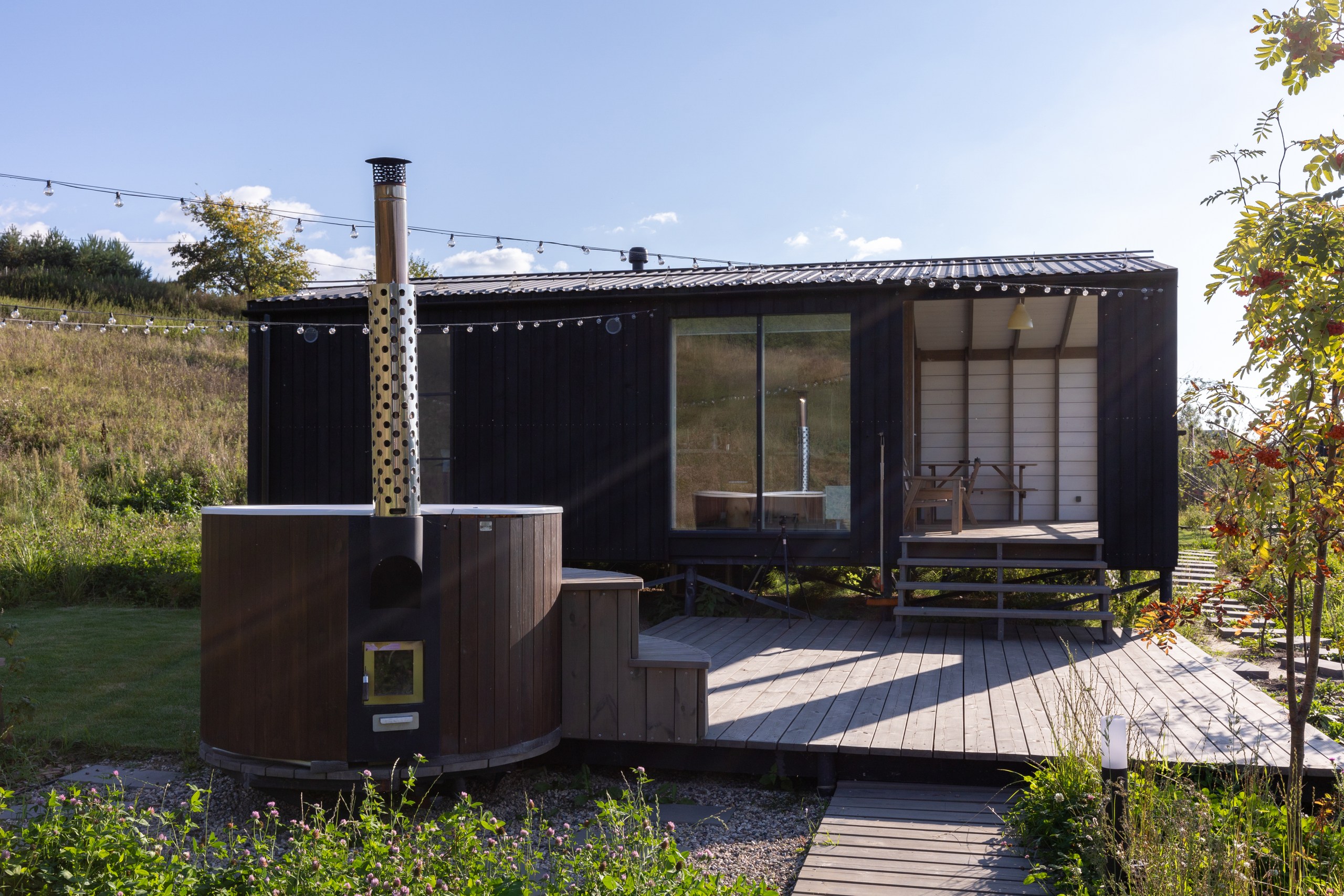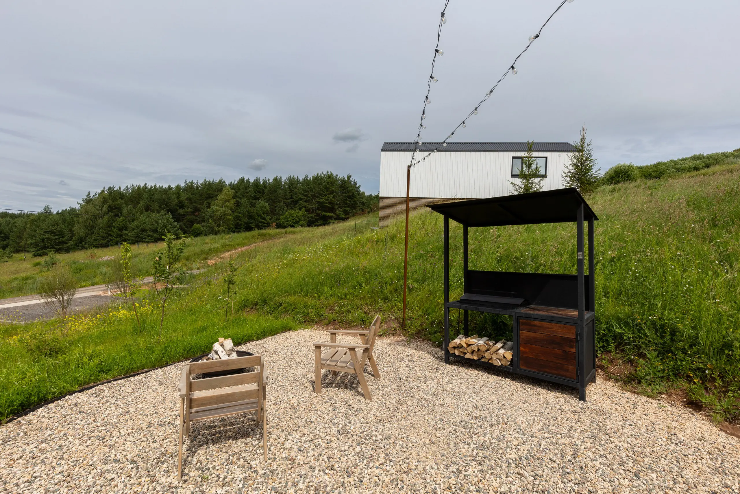 Вас ждут светлые домики с панорамными окнами, уютными спальнями и просторной кухней-гостиной, а на террасе каждого дома есть горячая купель с аэромассажем. Зоны отдыха оборудованы мангалами и костровыми чашами для вечерних посиделок.