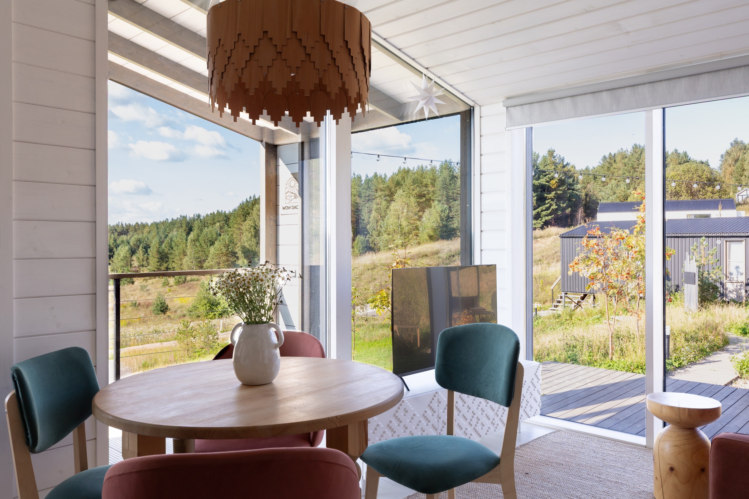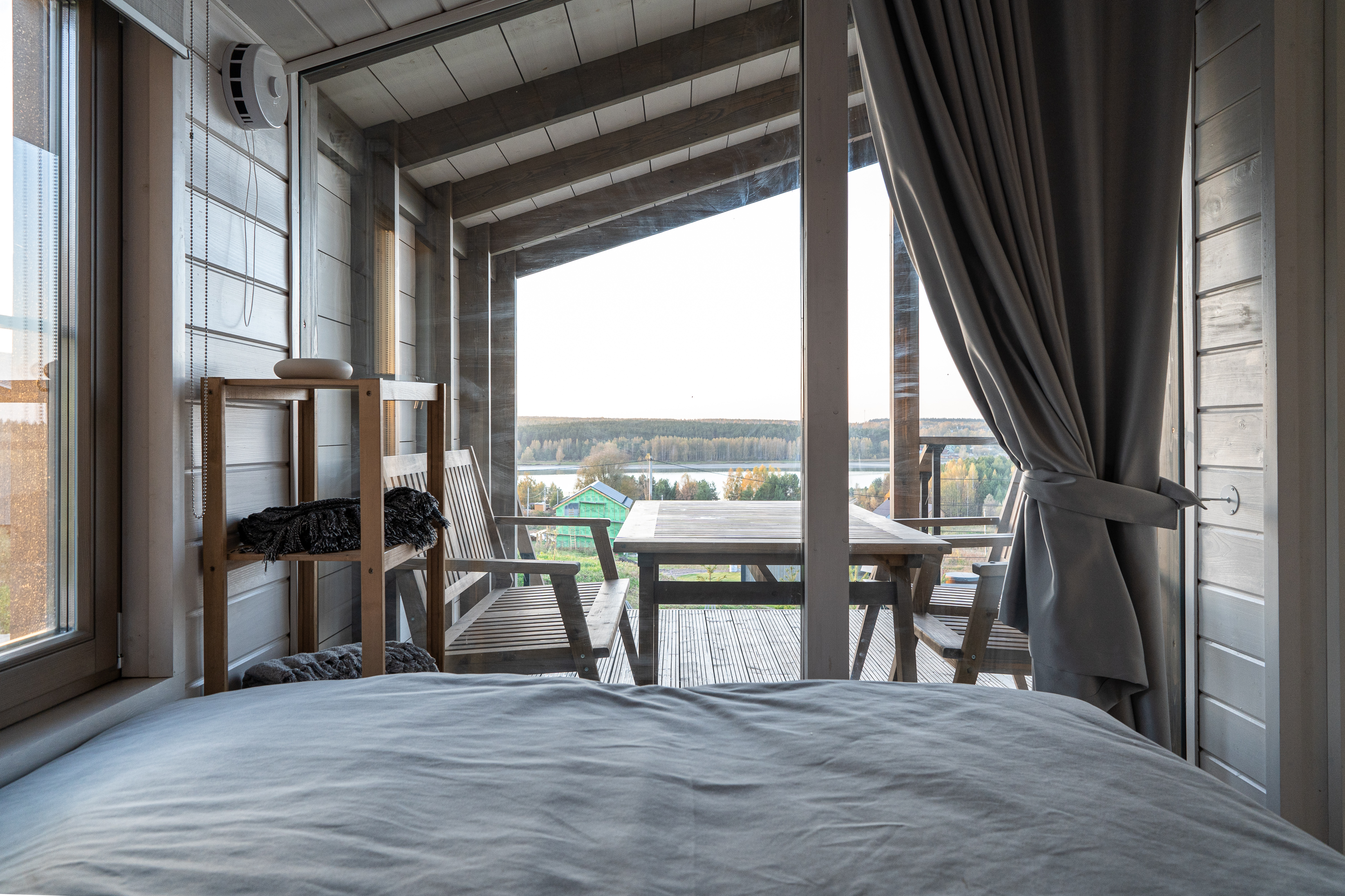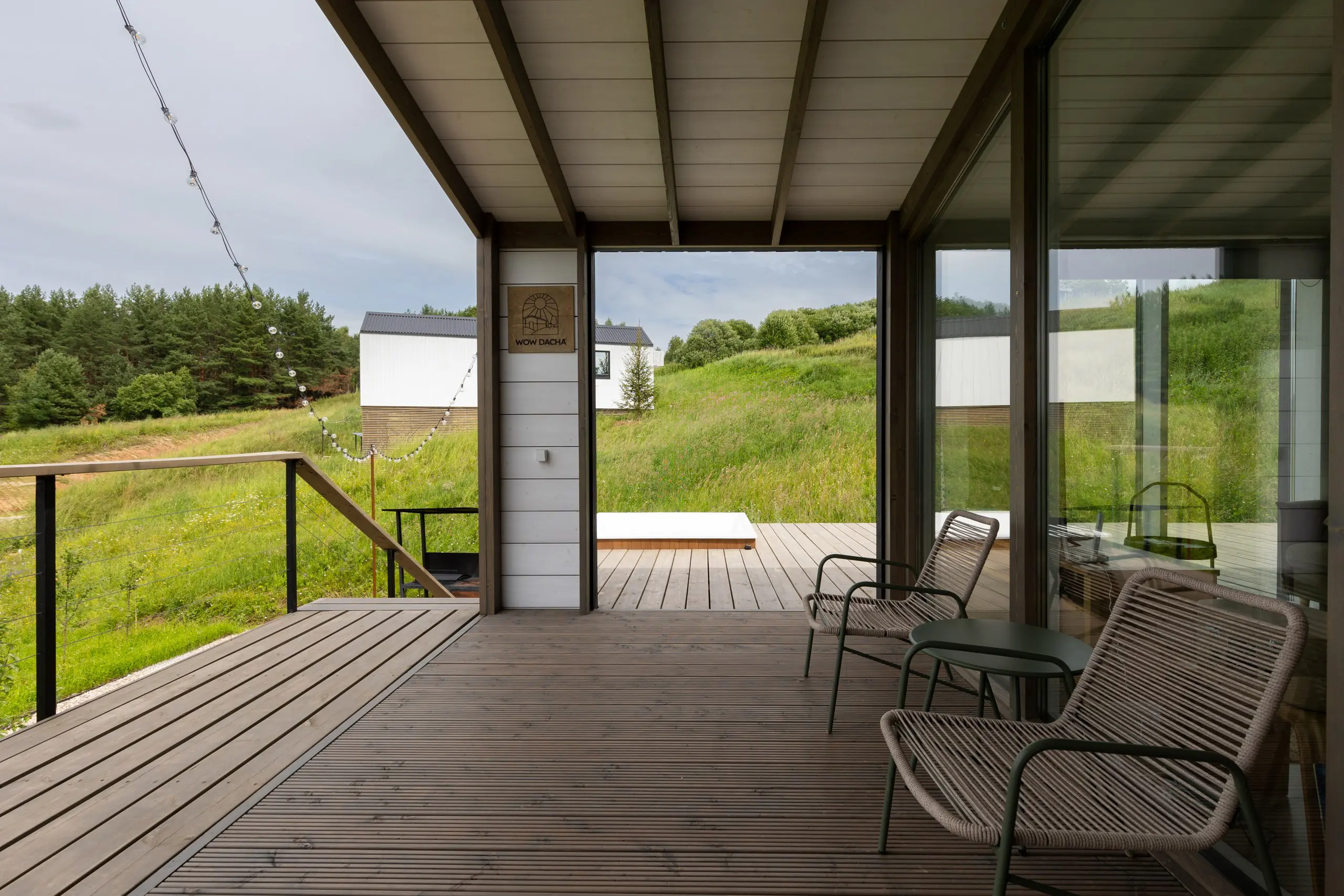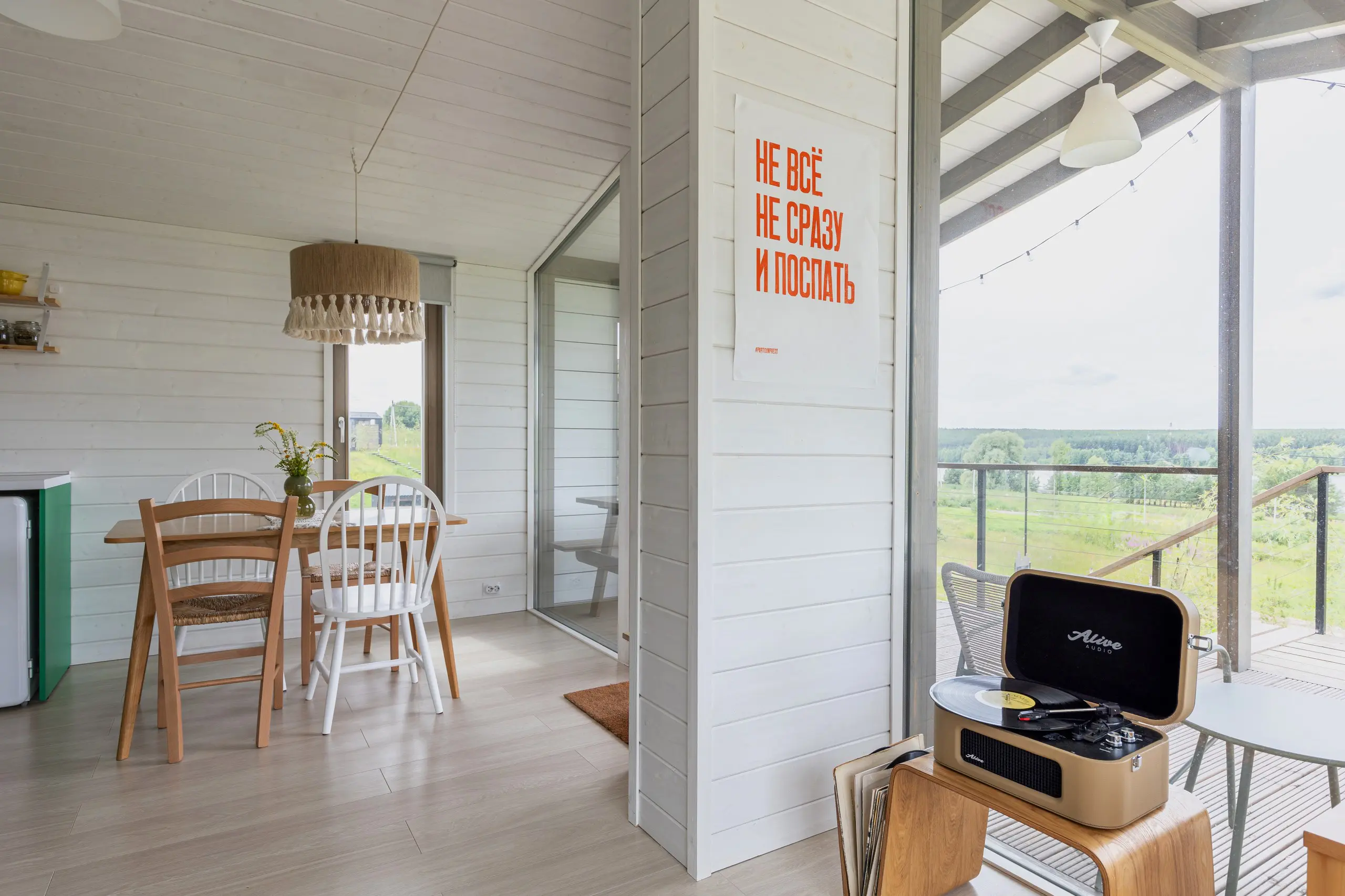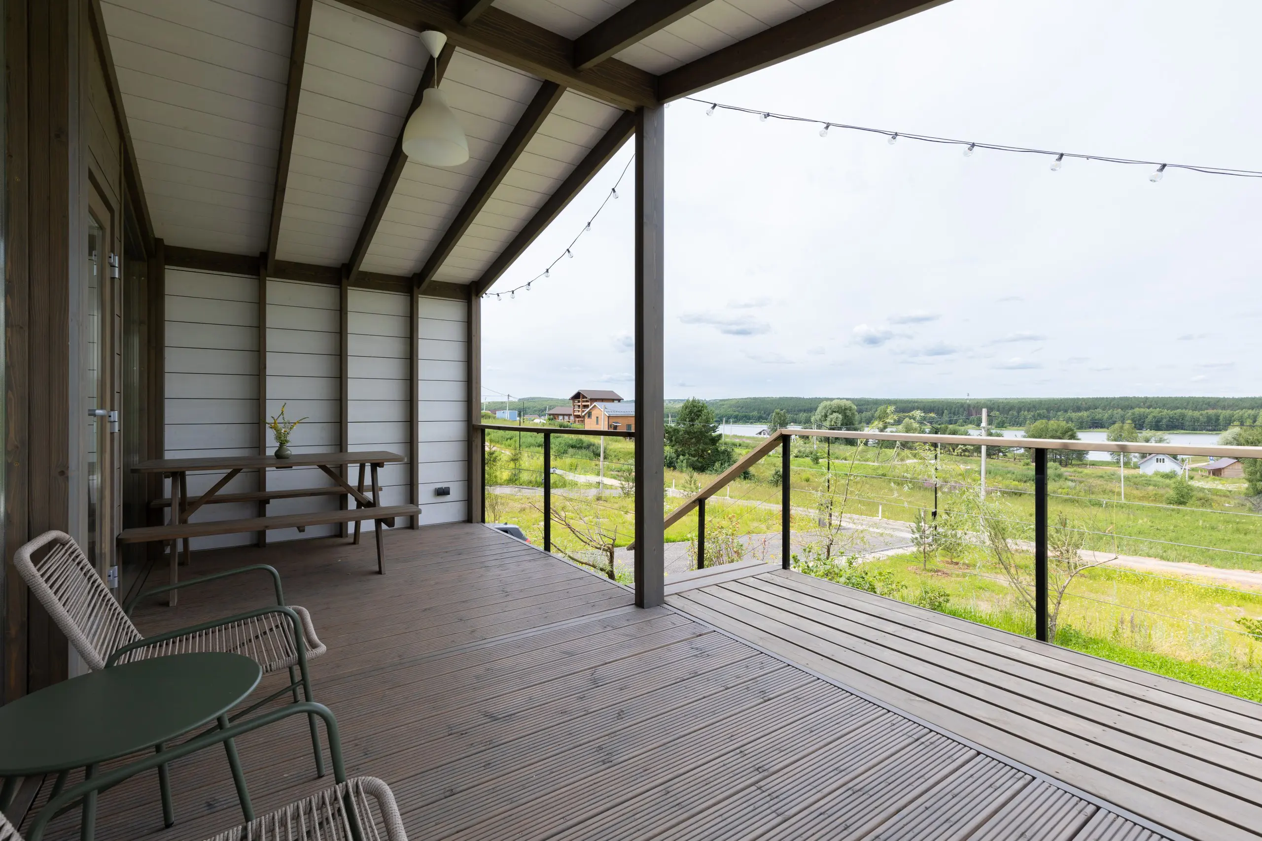 Вас ждут светлые домики с панорамными окнами, уютными спальнями и просторной кухней-гостиной, а на террасе каждого дома есть горячая купель с аэромассажем. Зоны отдыха оборудованы мангалами и костровыми чашами для вечерних посиделок.