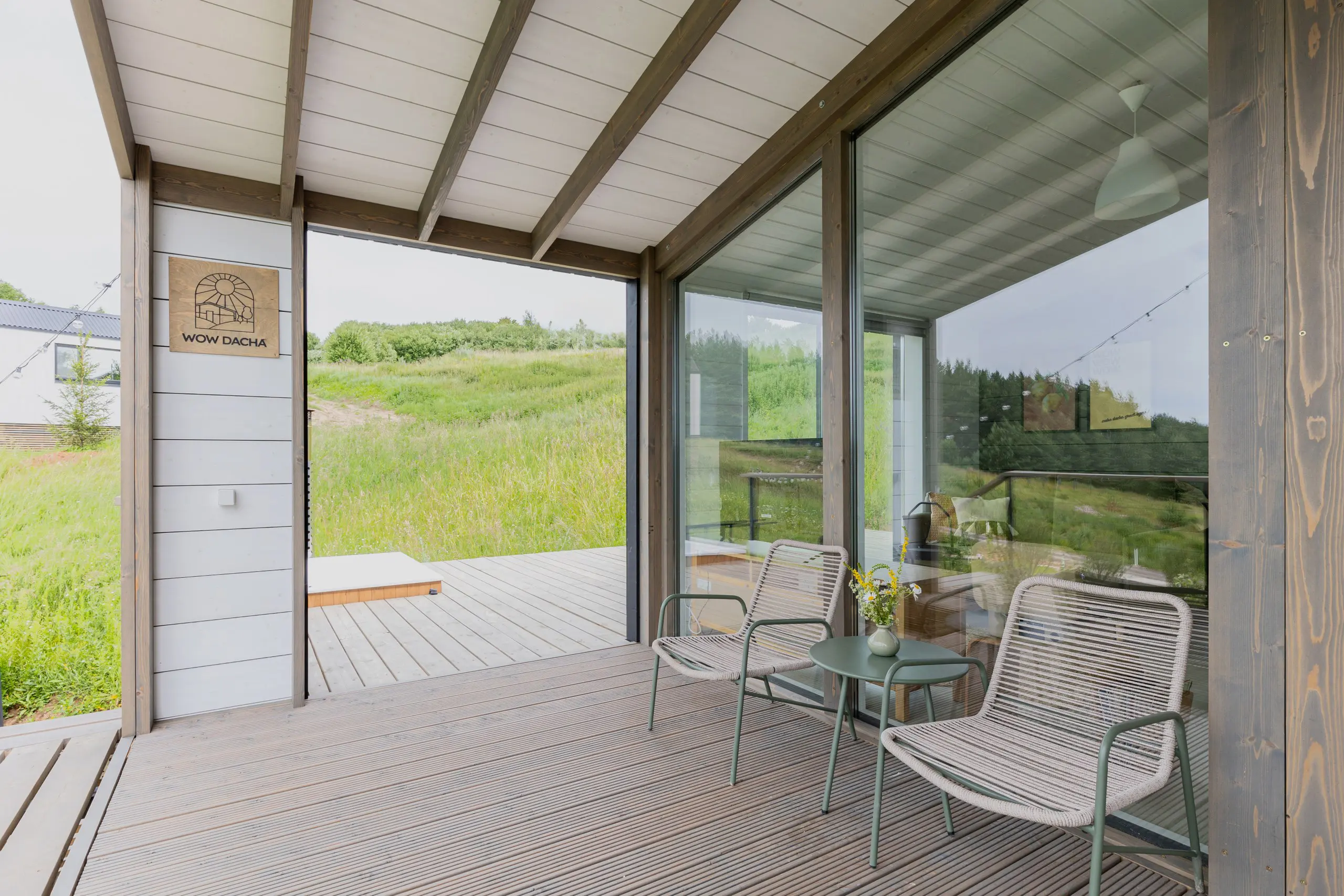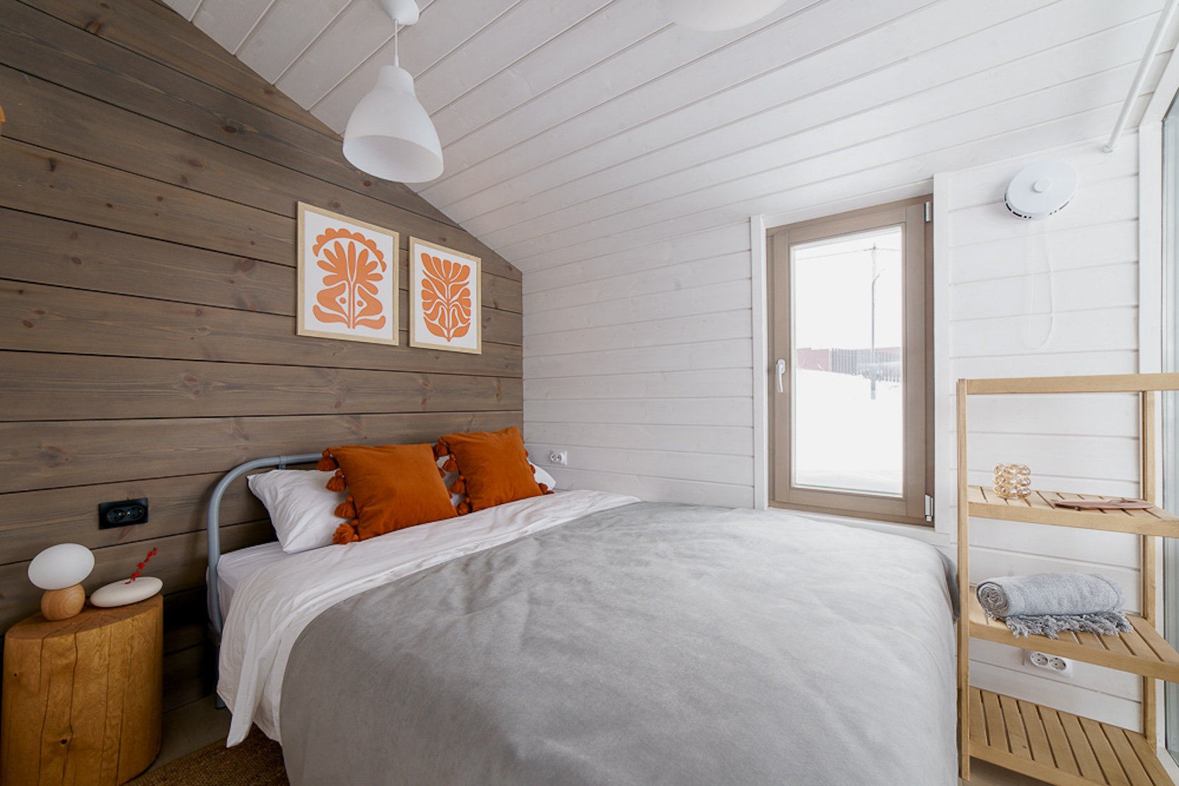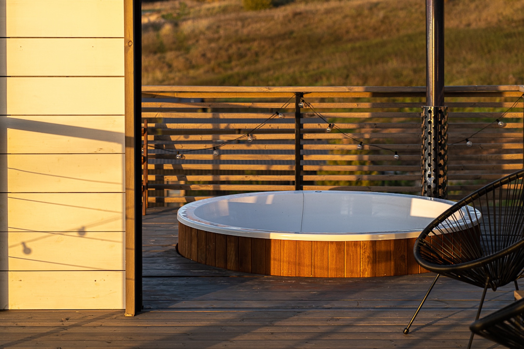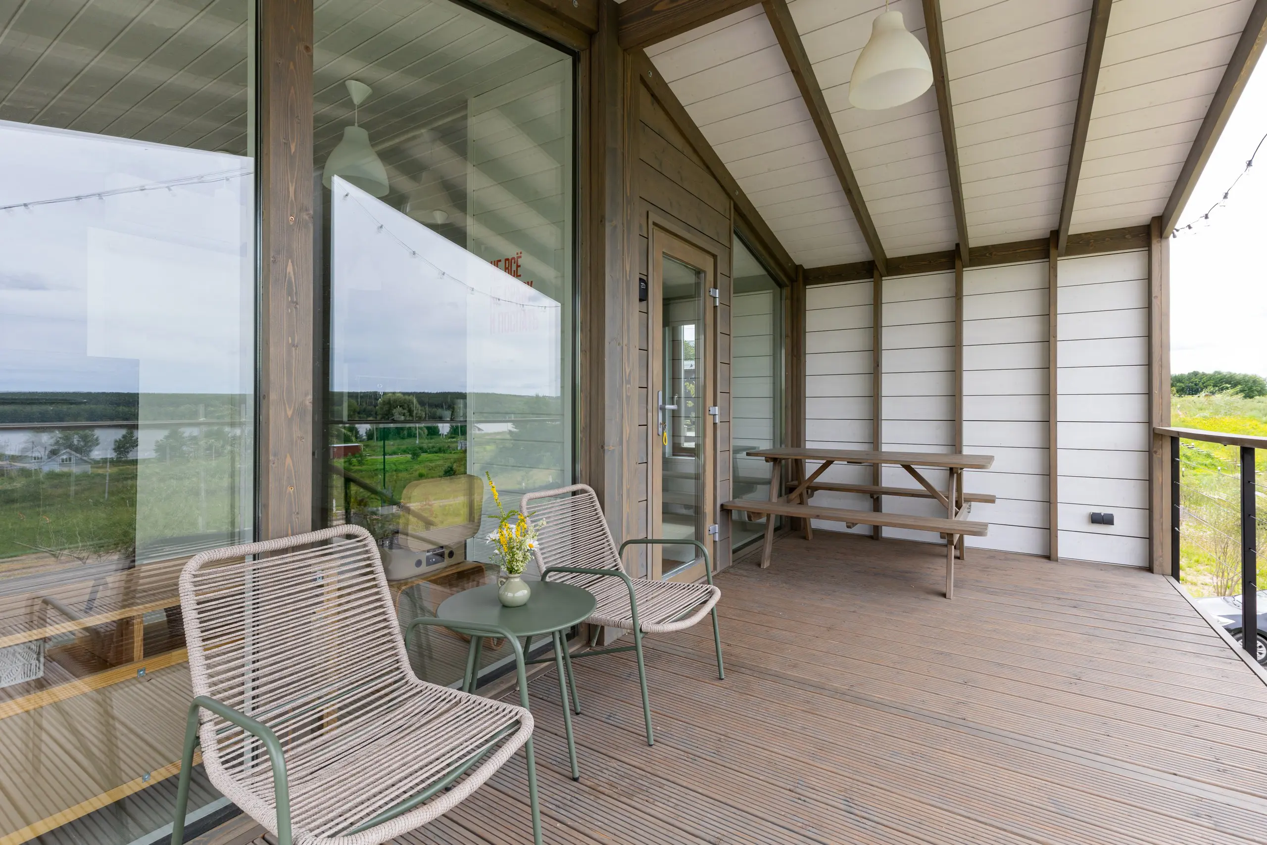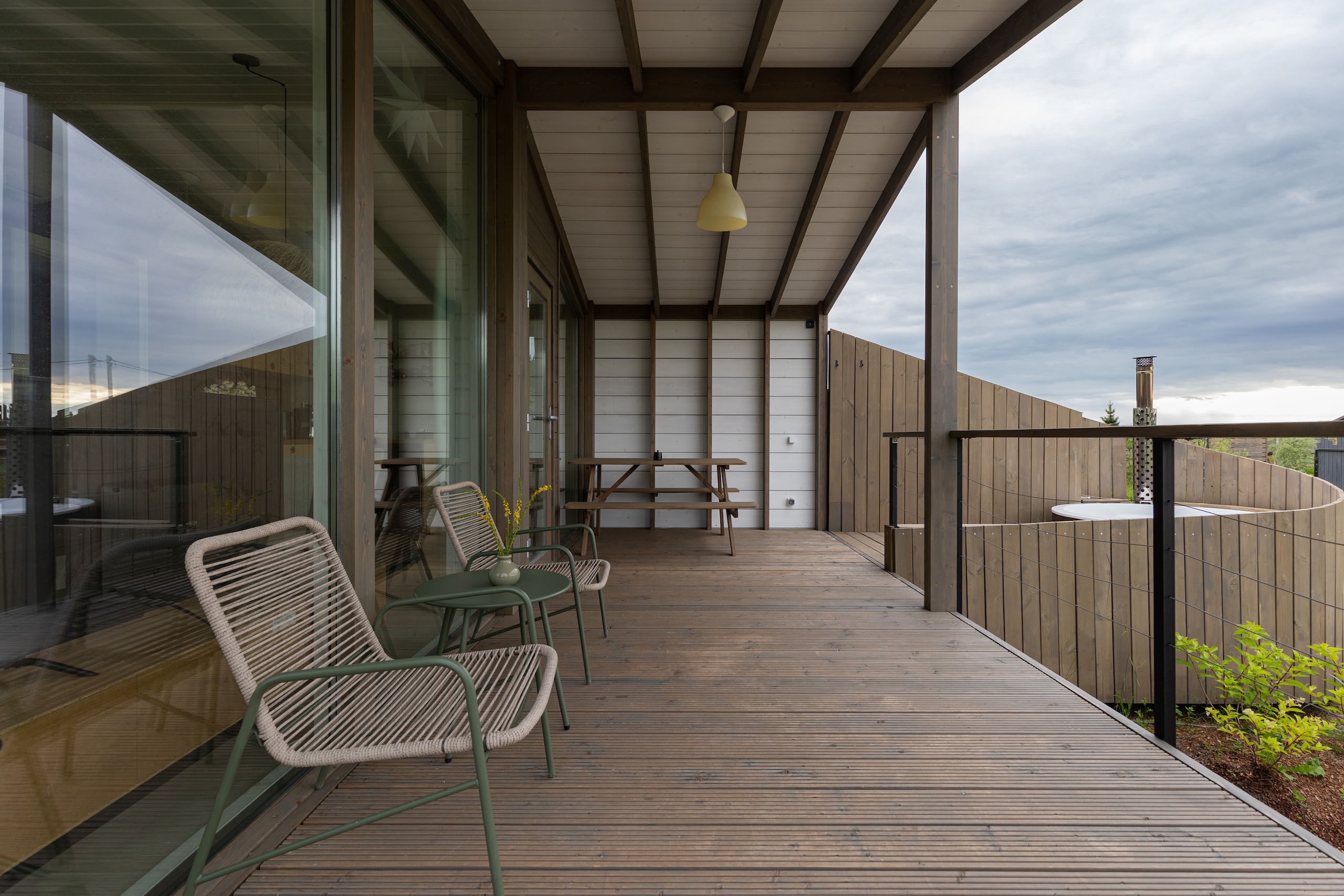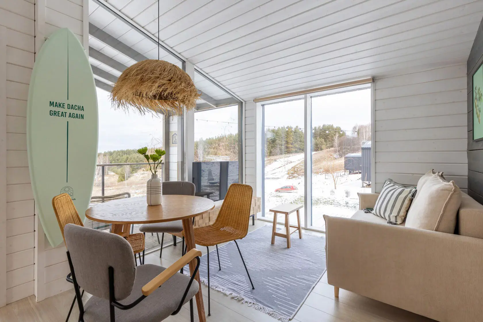 Вас ждут светлые домики с панорамными окнами, уютными спальнями и просторной кухней-гостиной, а на террасе каждого дома есть горячая купель с аэромассажем. Зоны отдыха оборудованы мангалами и костровыми чашами для вечерних посиделок.