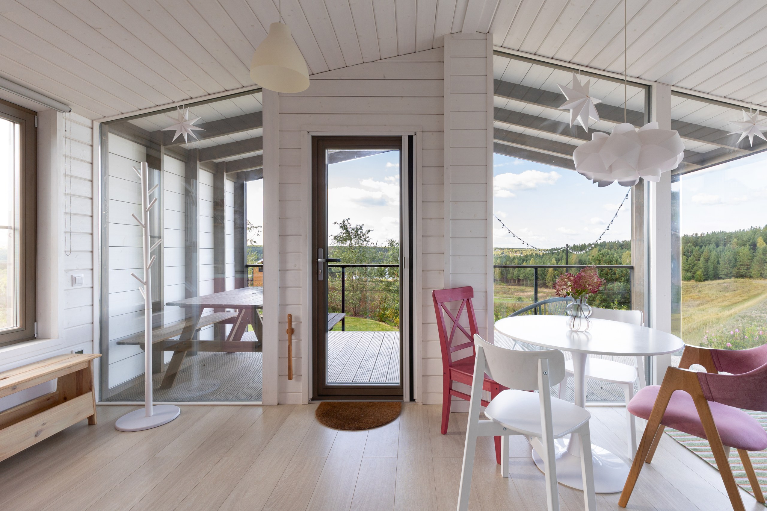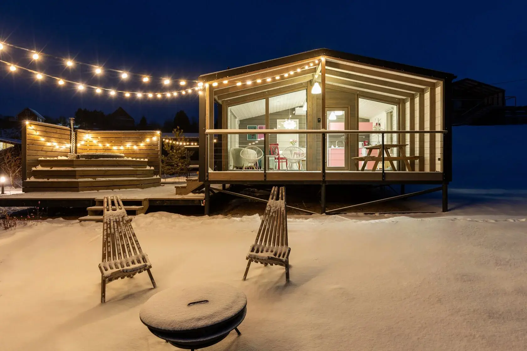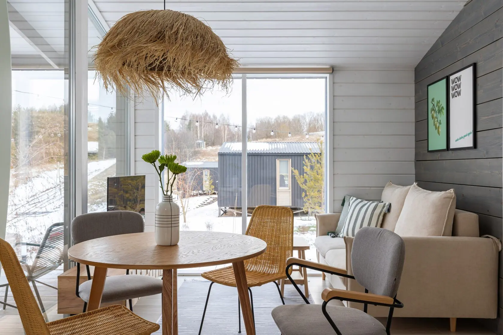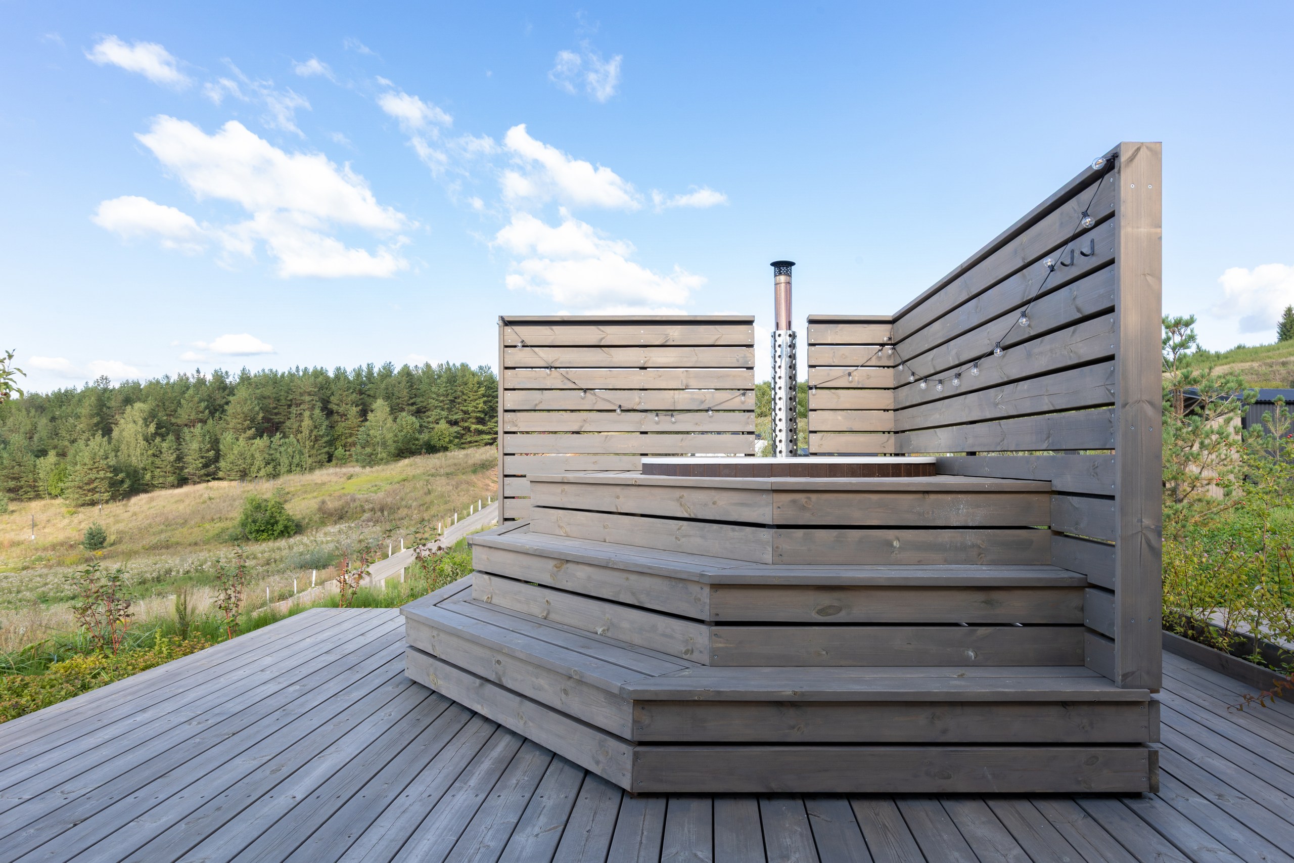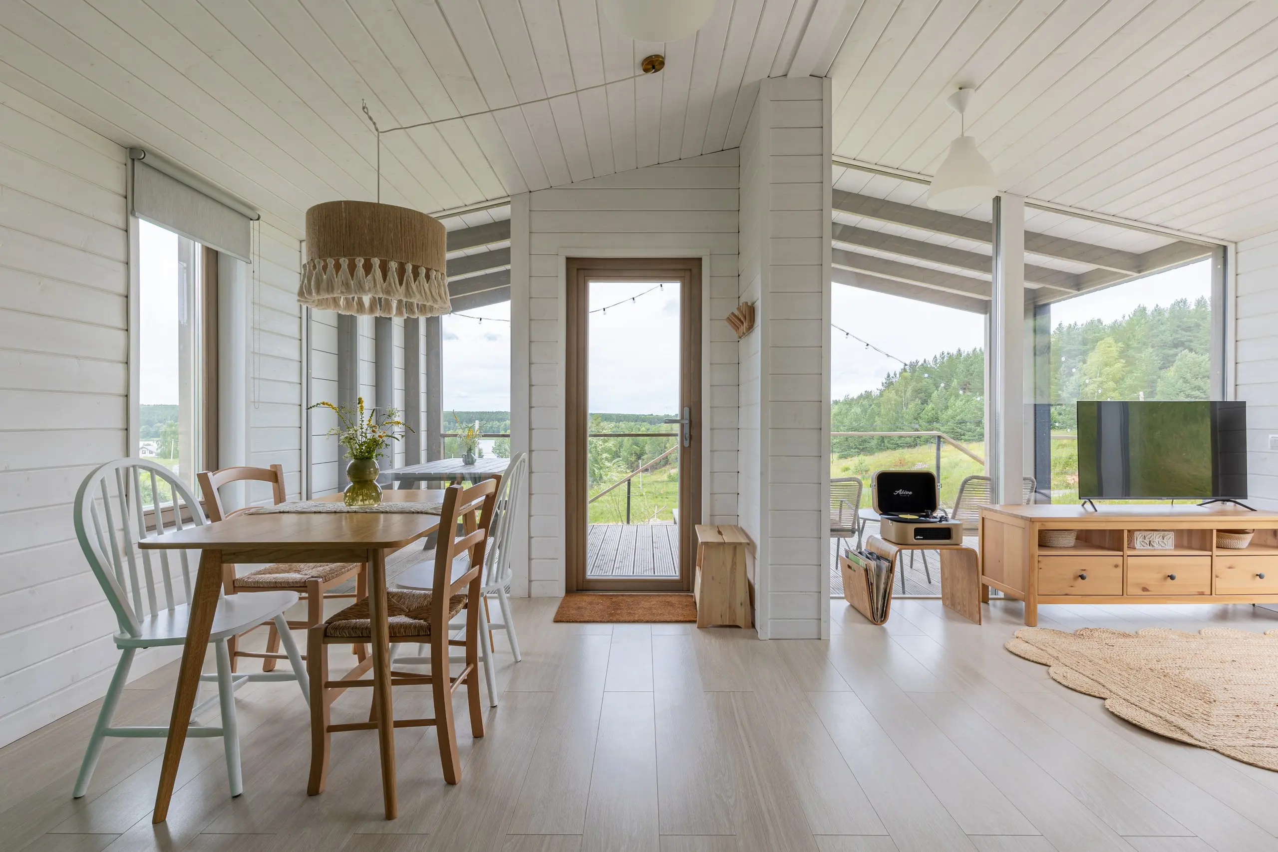 Вас ждут светлые домики с панорамными окнами, уютными спальнями и просторной кухней-гостиной, а на террасе каждого дома есть горячая купель с аэромассажем. Зоны отдыха оборудованы мангалами и костровыми чашами для вечерних посиделок.