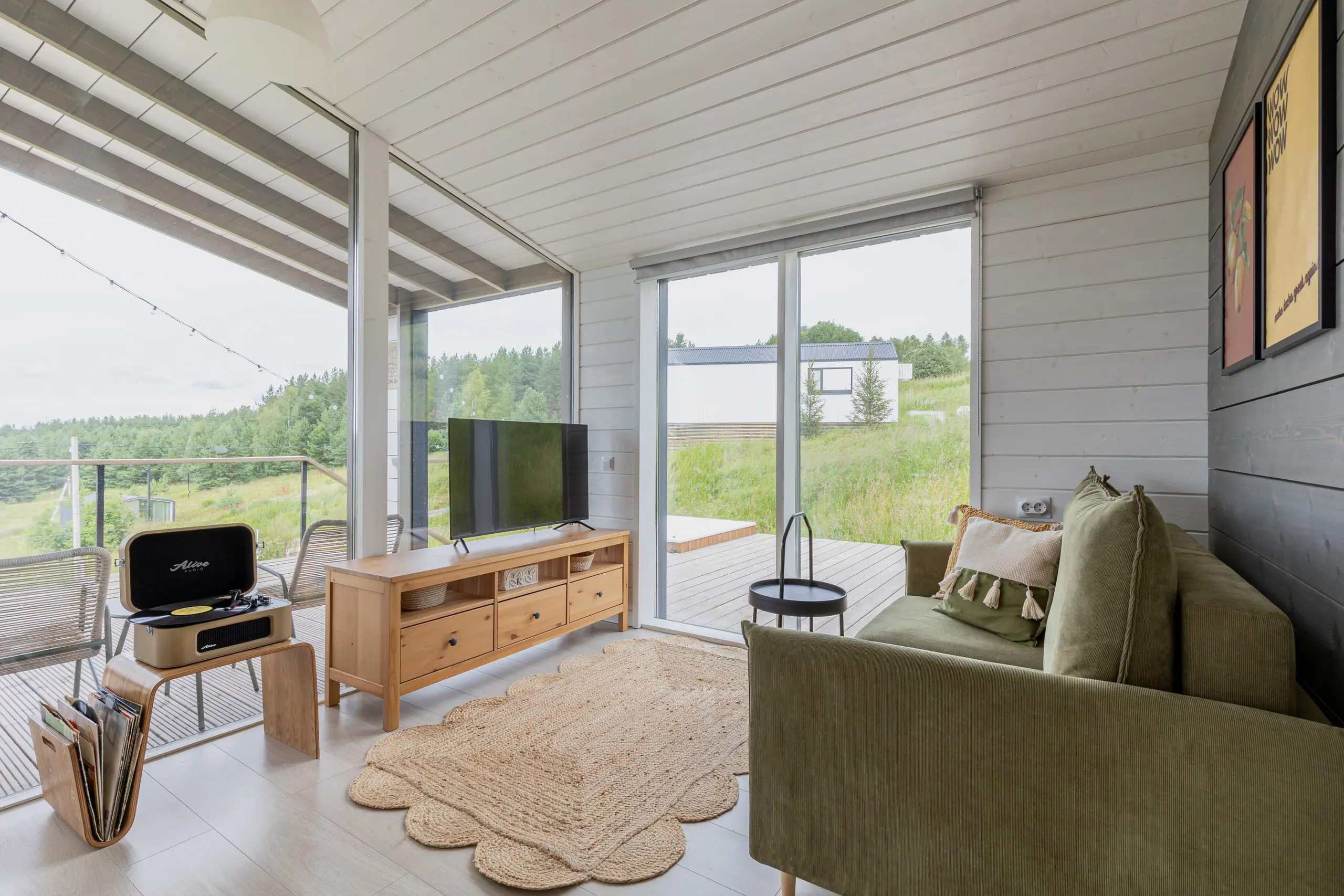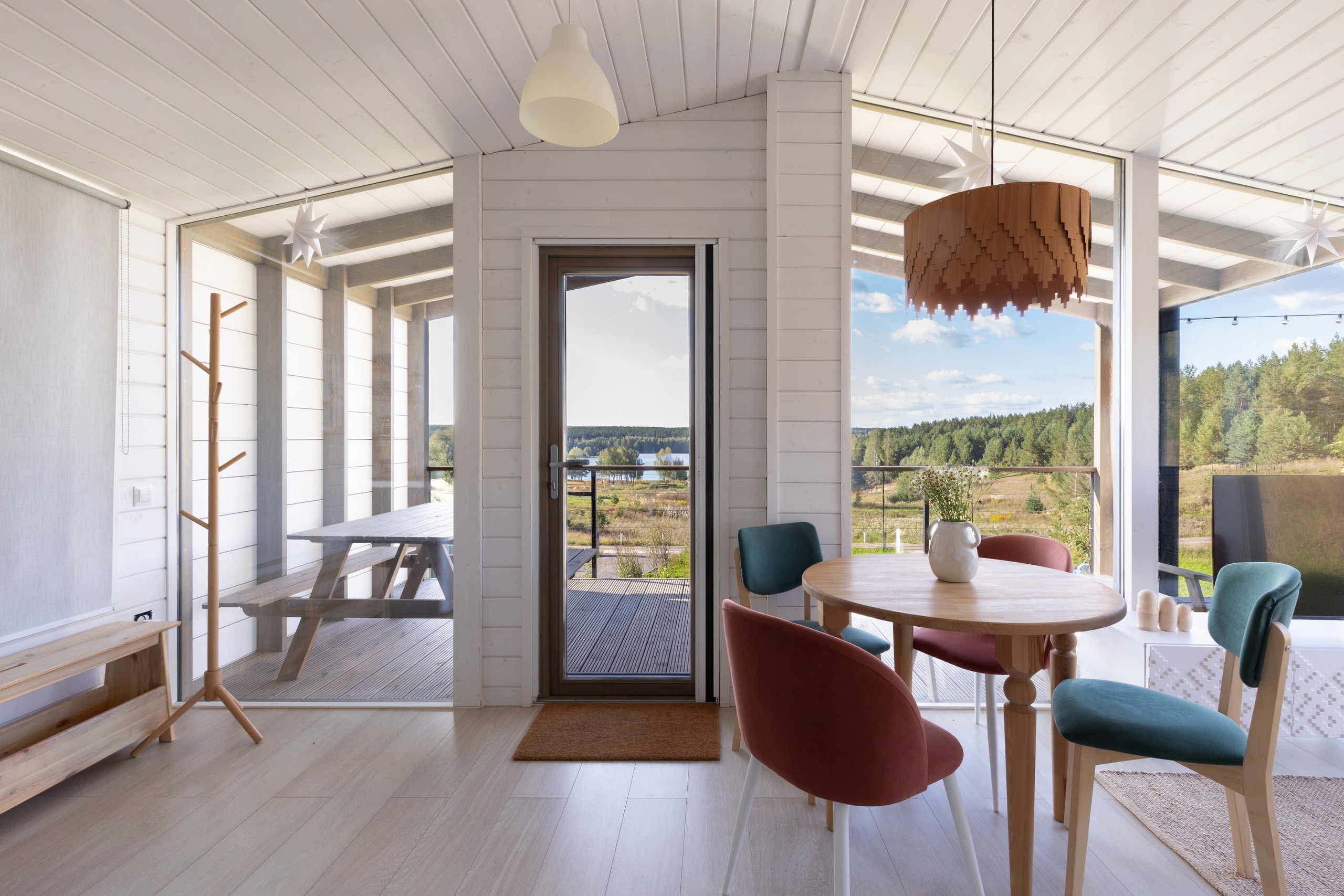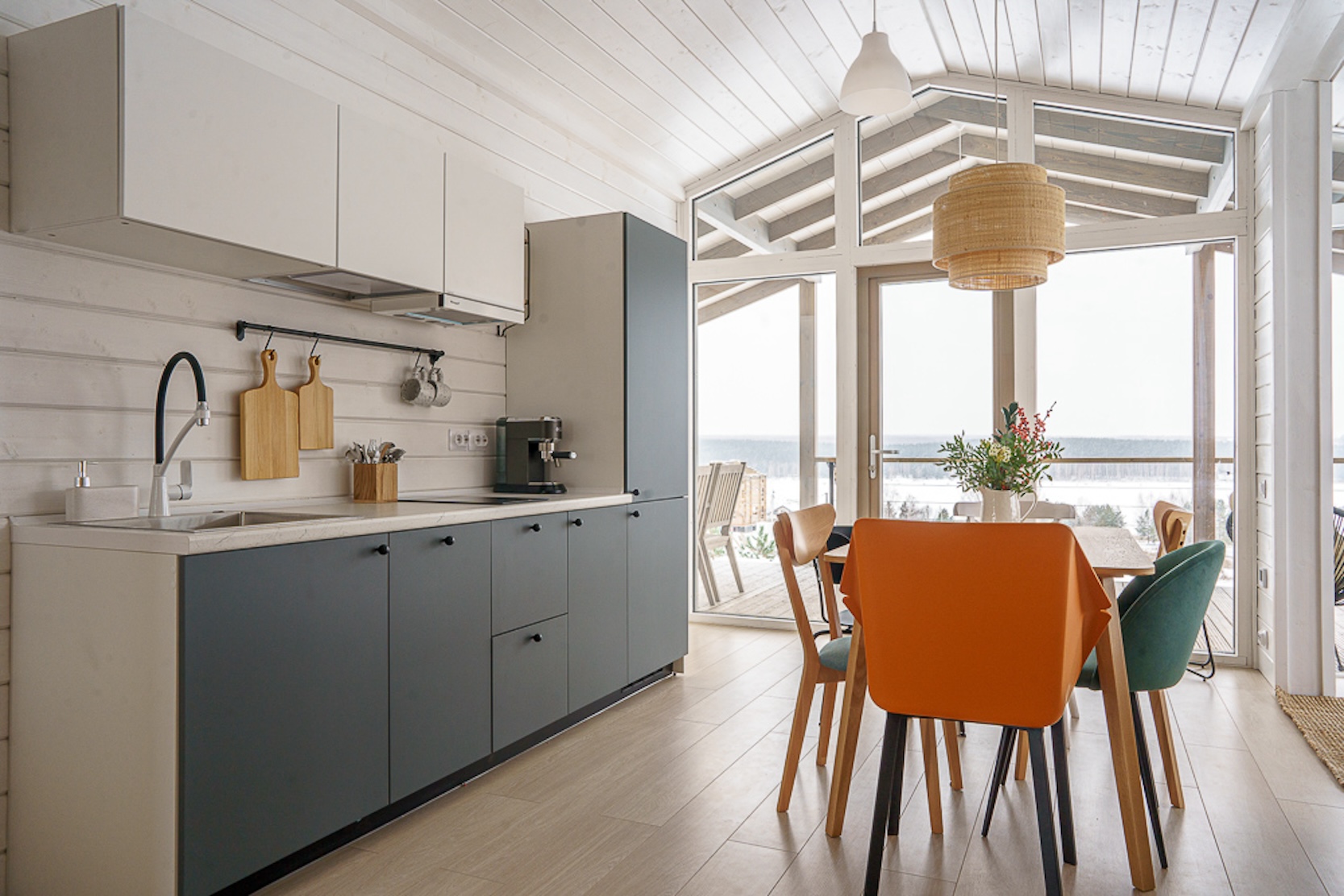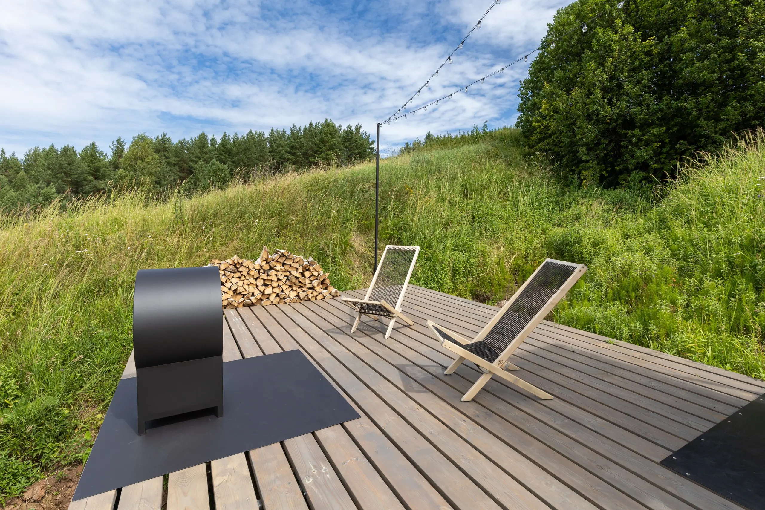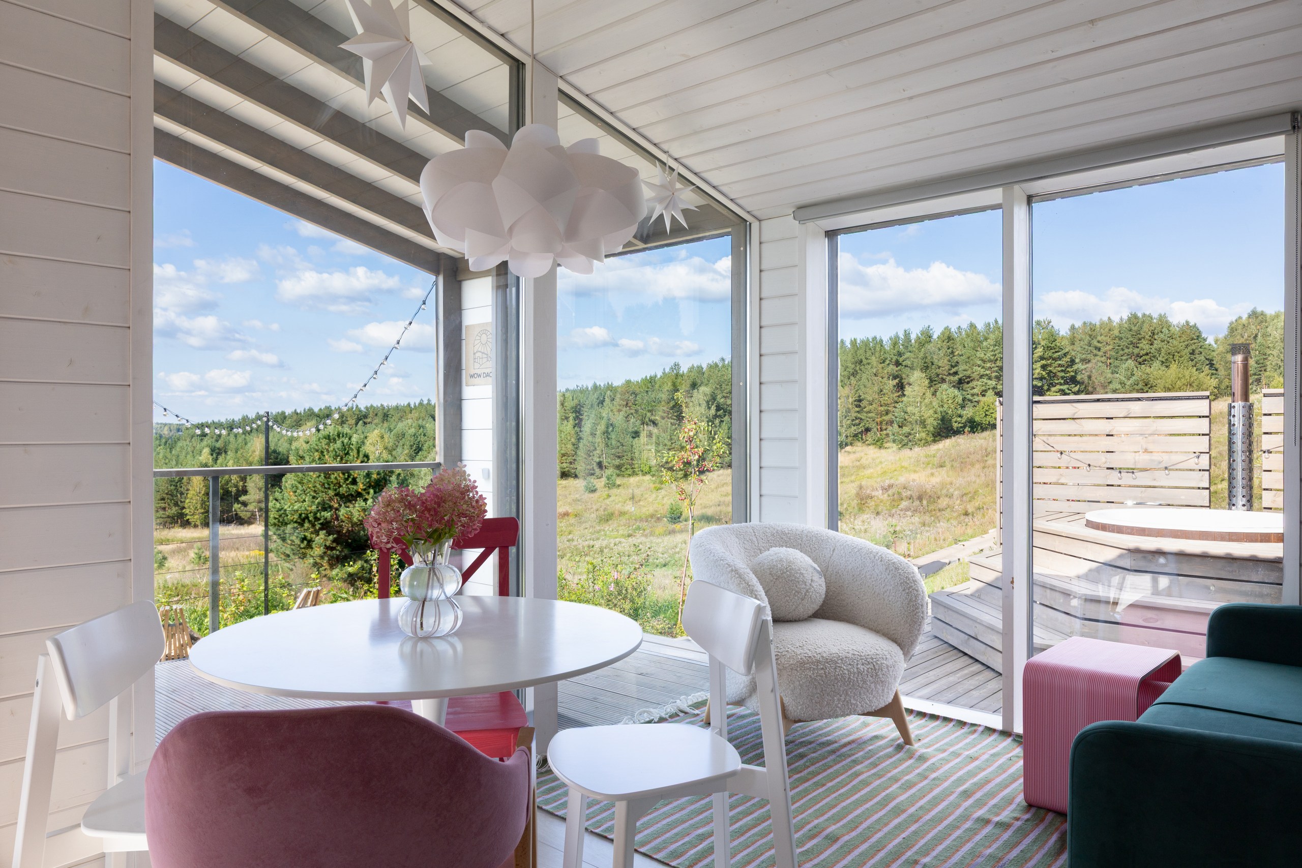 Вас ждут светлые домики с панорамными окнами, уютными спальнями и просторной кухней-гостиной, а на террасе каждого дома есть горячая купель с аэромассажем. Зоны отдыха оборудованы мангалами и костровыми чашами для вечерних посиделок.