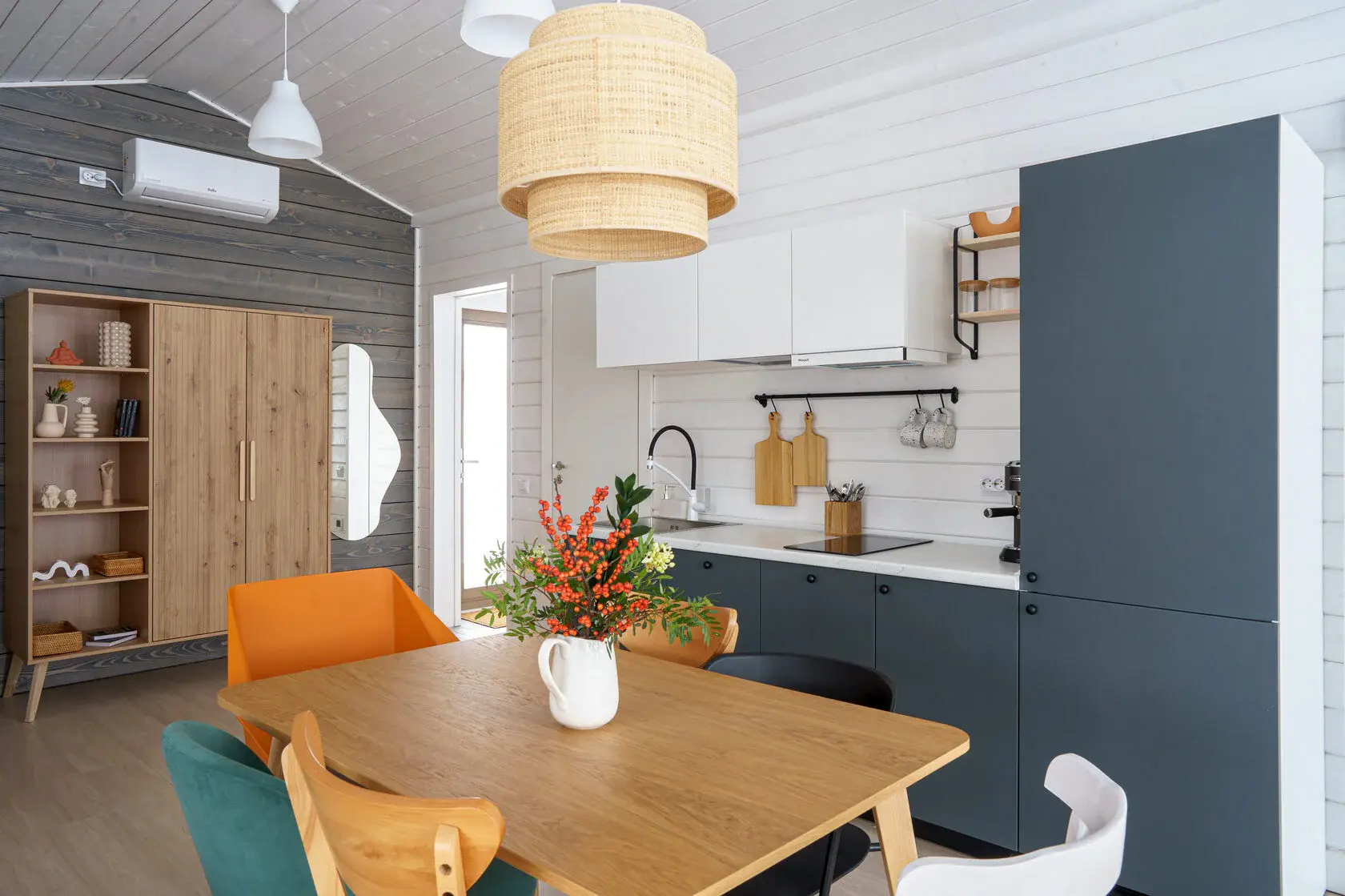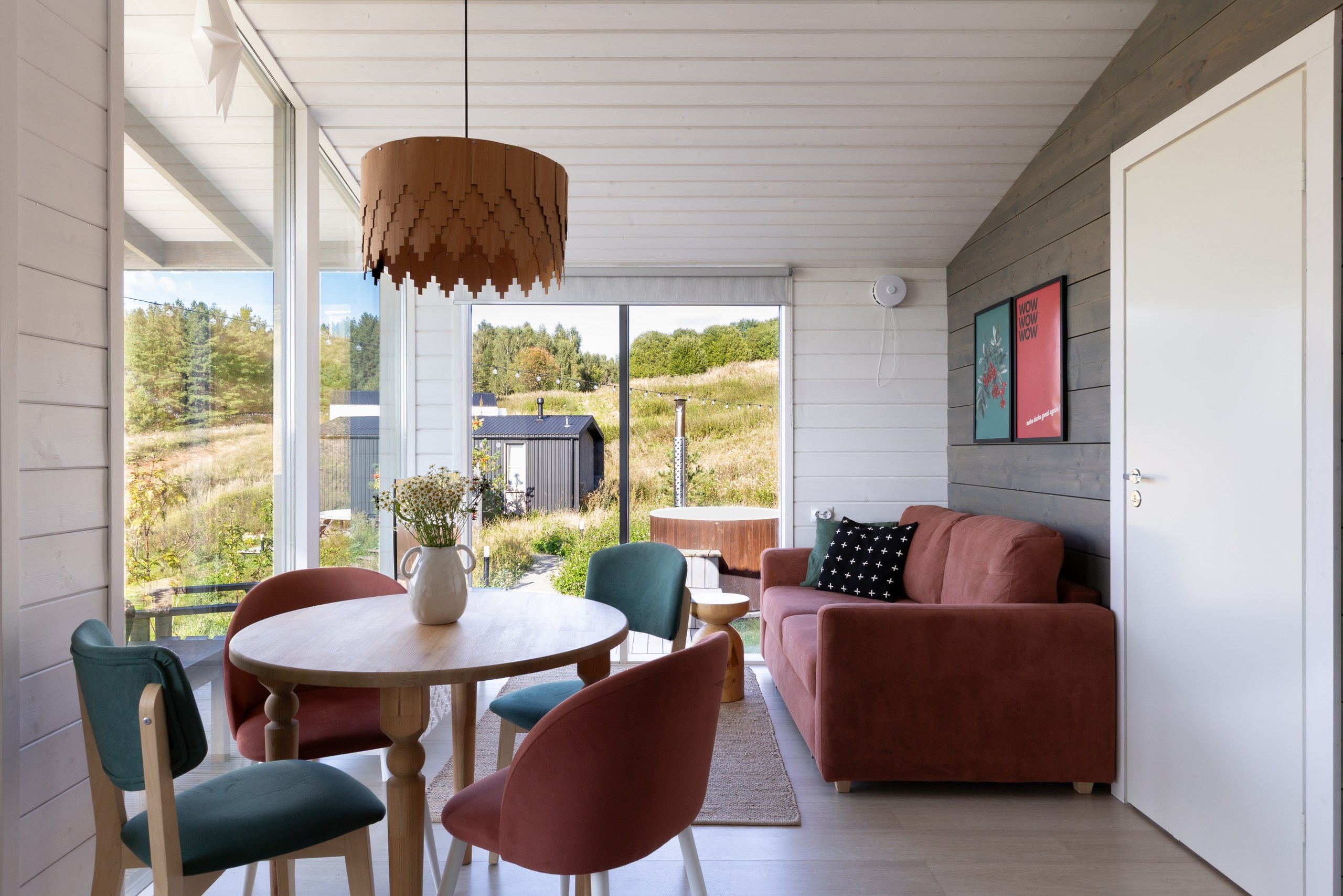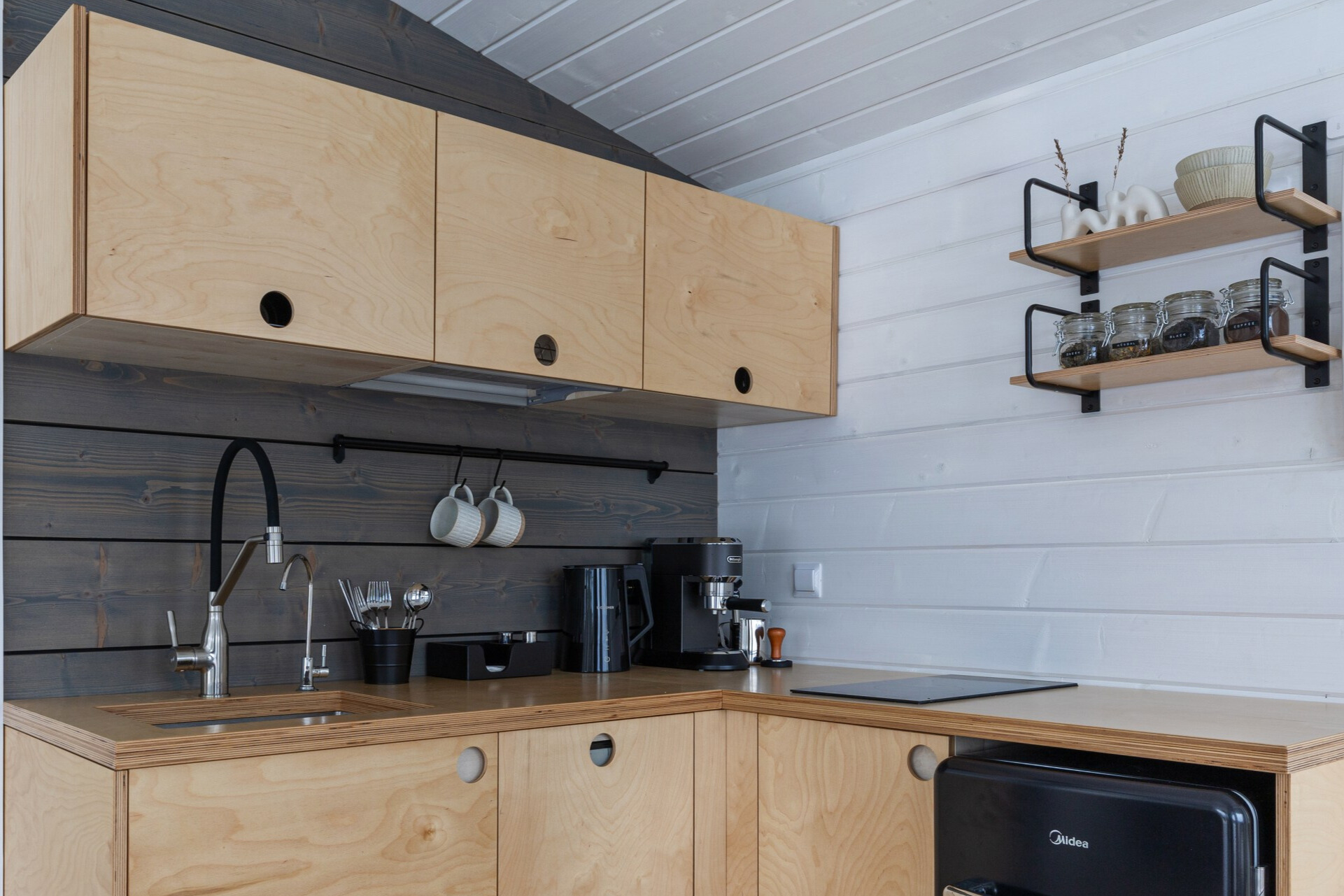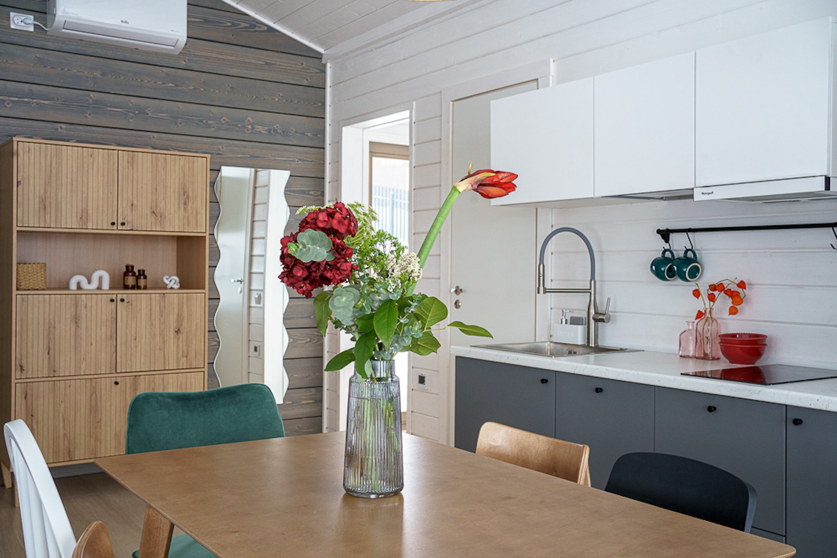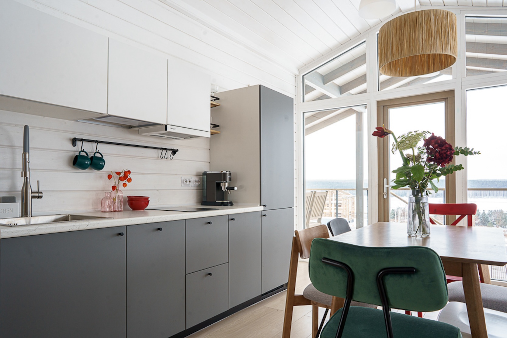 Вас ждут светлые домики с панорамными окнами, уютными спальнями и просторной кухней-гостиной, а на террасе каждого дома есть горячая купель с аэромассажем. Зоны отдыха оборудованы мангалами и костровыми чашами для вечерних посиделок.