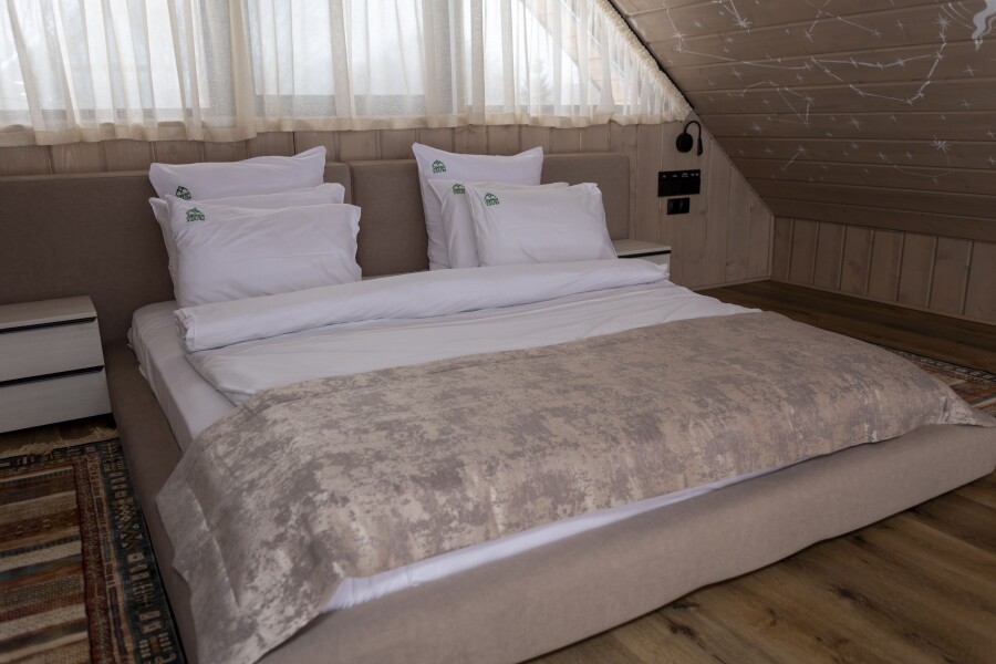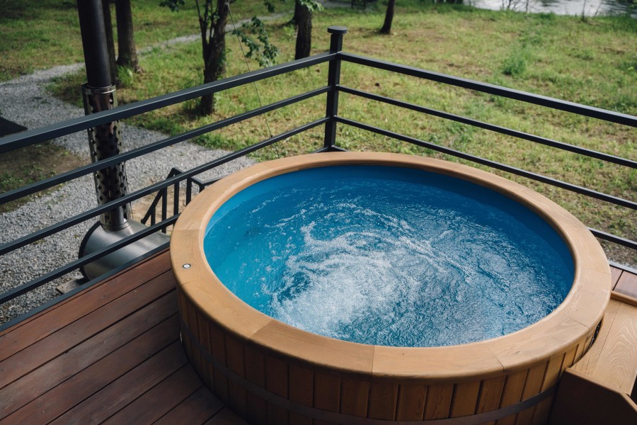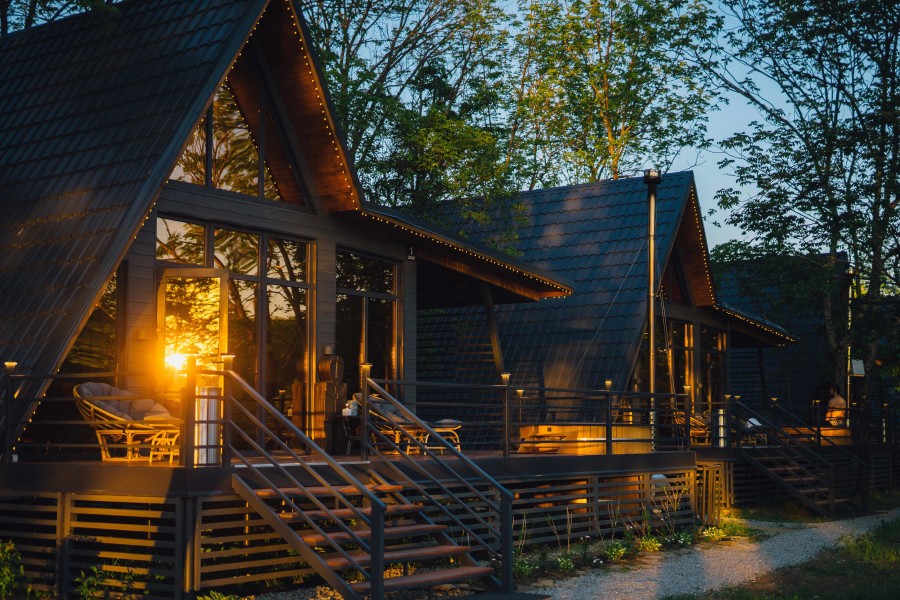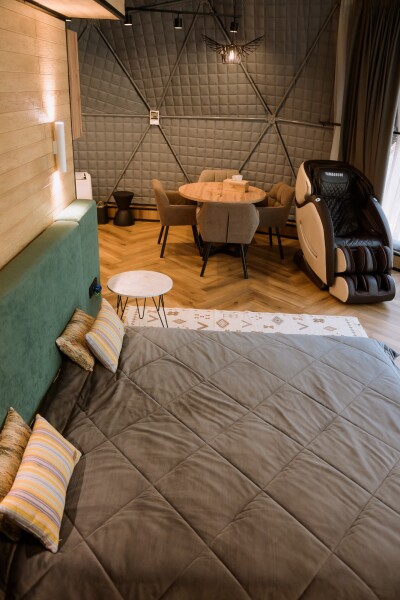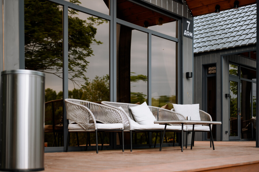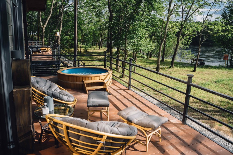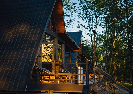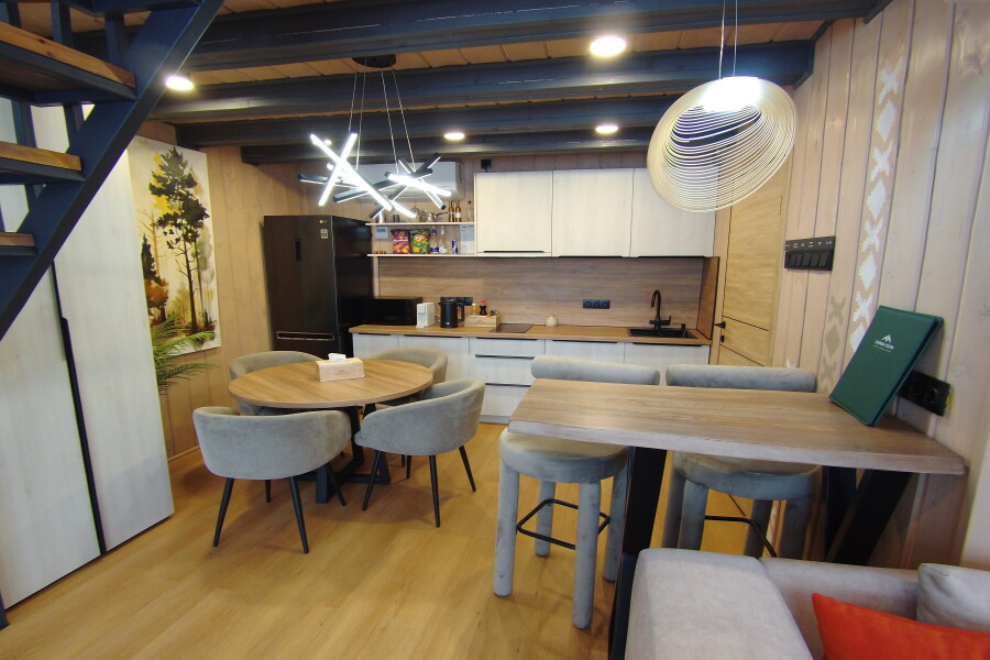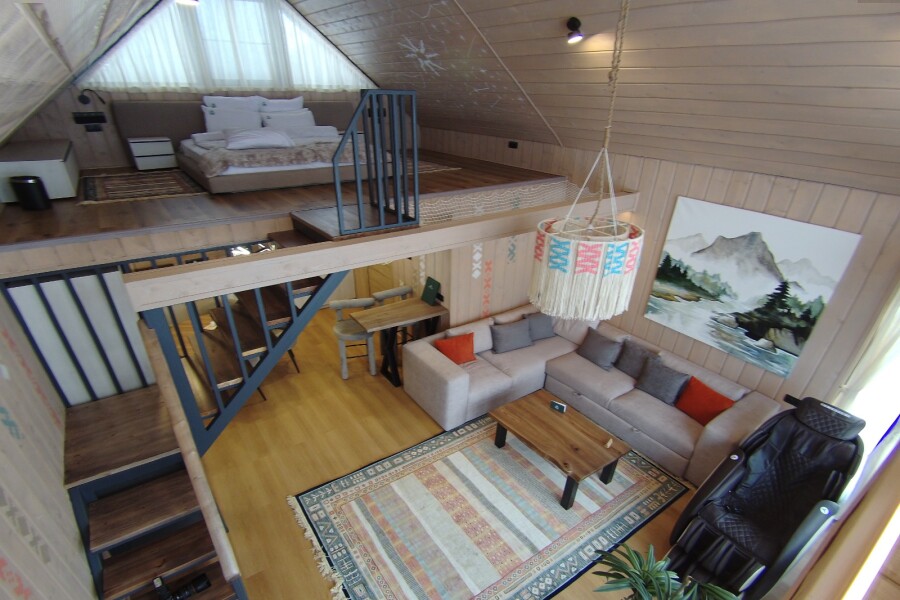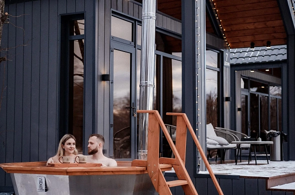 Каждая придомовая терраса оборудована индивидуальным банным чаном с гидромассажем, подсветкой и подогревом на дровах. Для развлечения гостей предусмотрены умная колонка с Алисой, небольшая библиотека и настольные игры. Так же доступна мангальная зона. По предварительному заказу повар на открытом огне приготовит сочный шашлык, ароматный плов или вкуснейшие завтраки. По запросу гостей доступна семейная рыбалка прямо на горной реке.